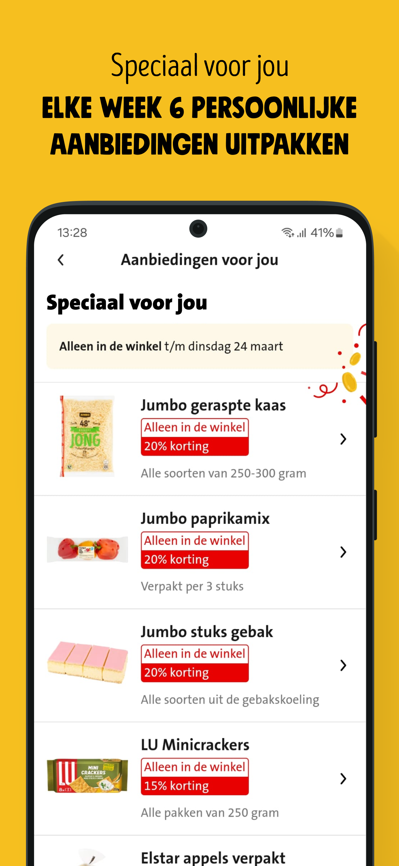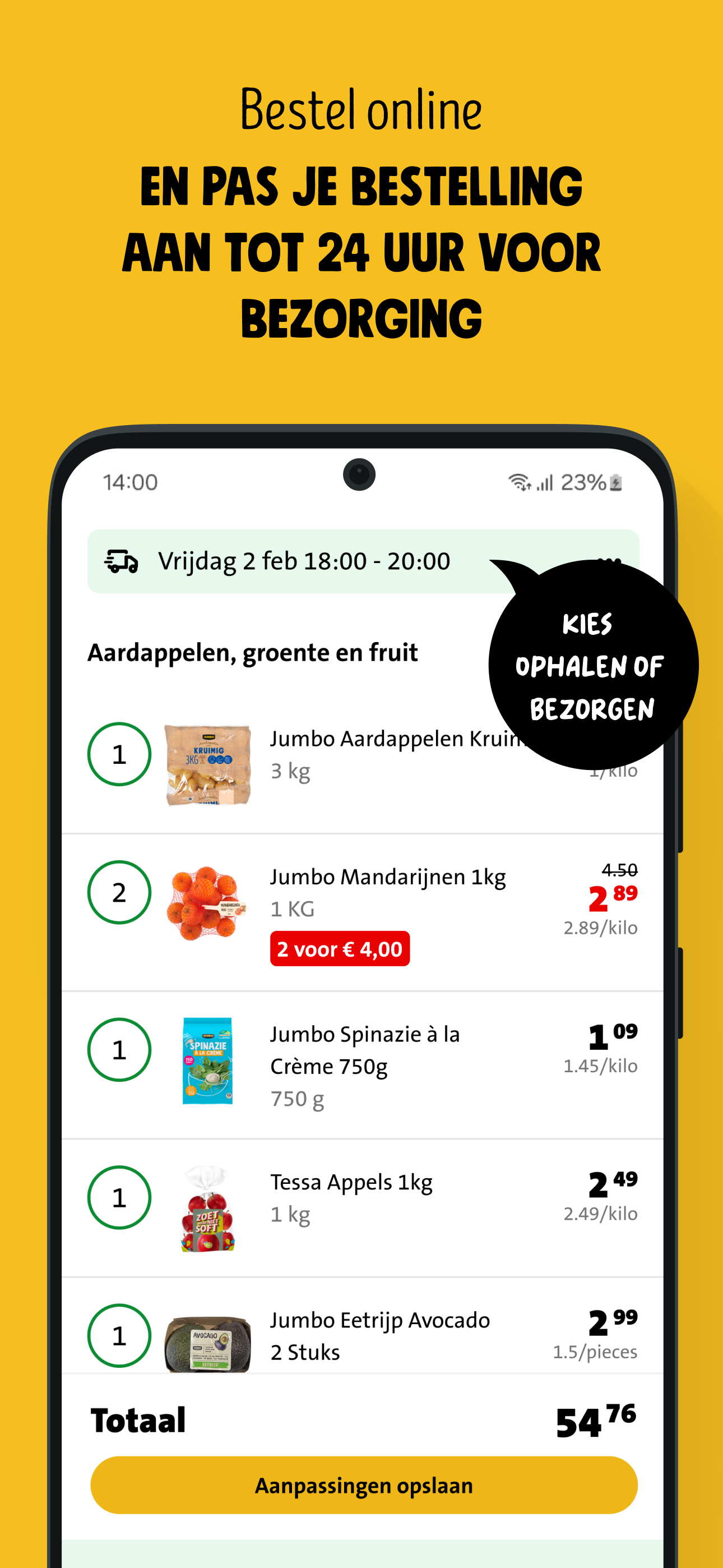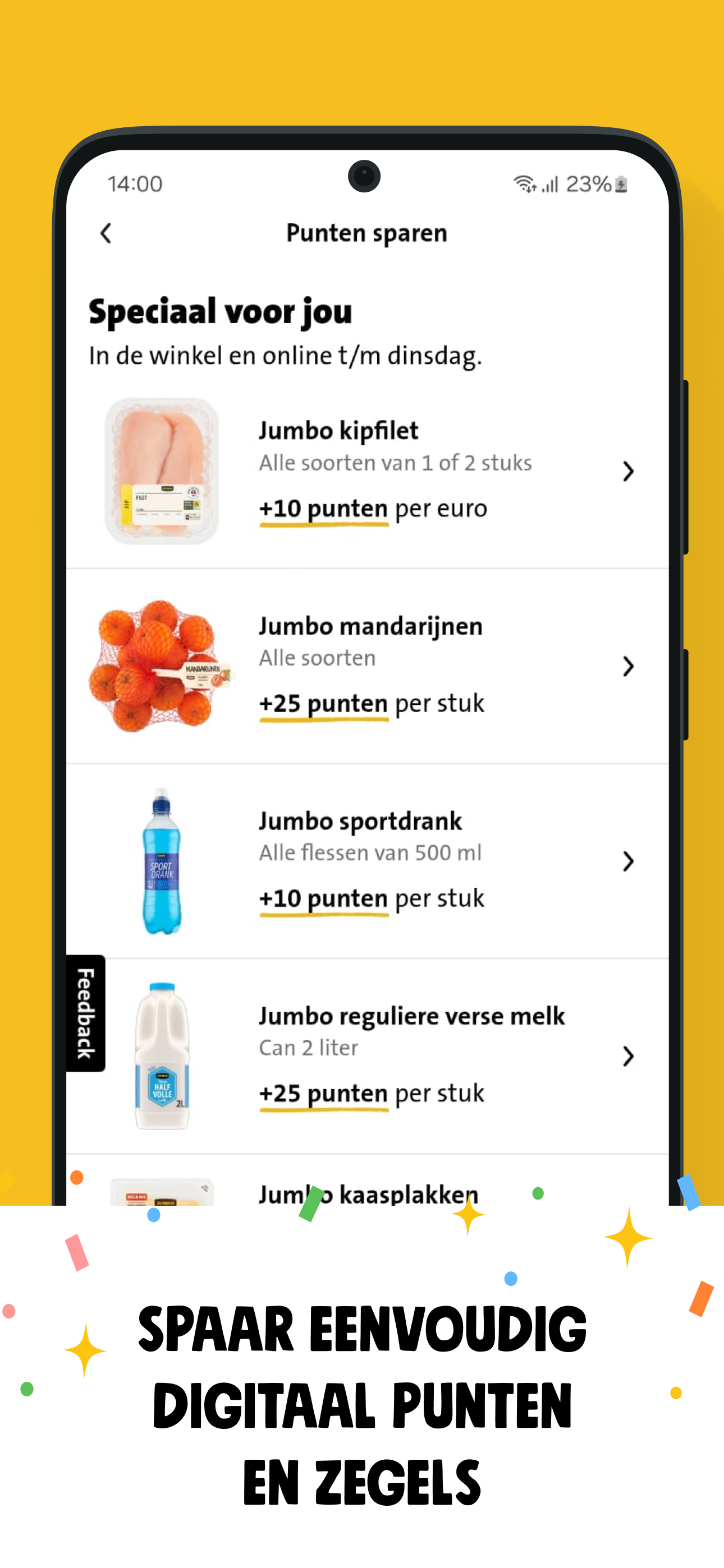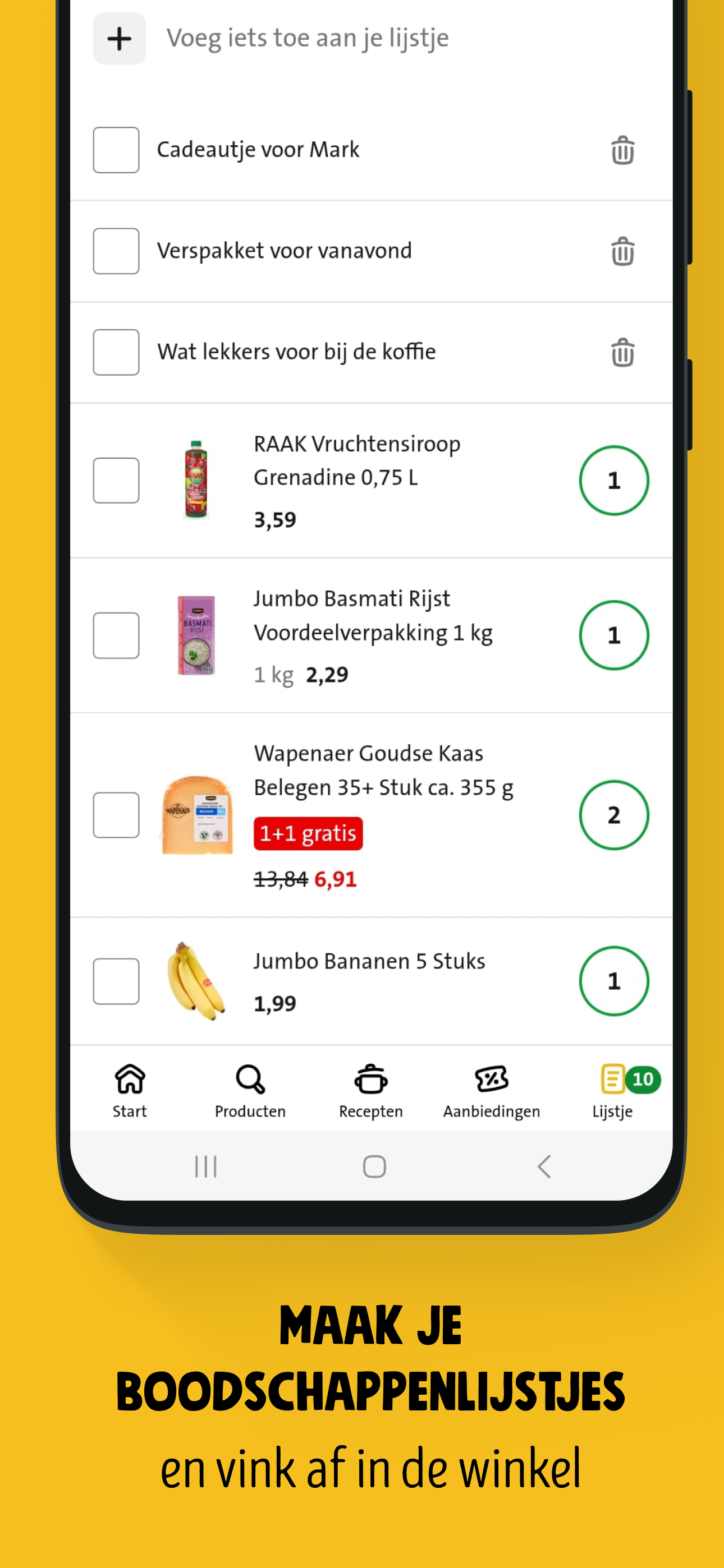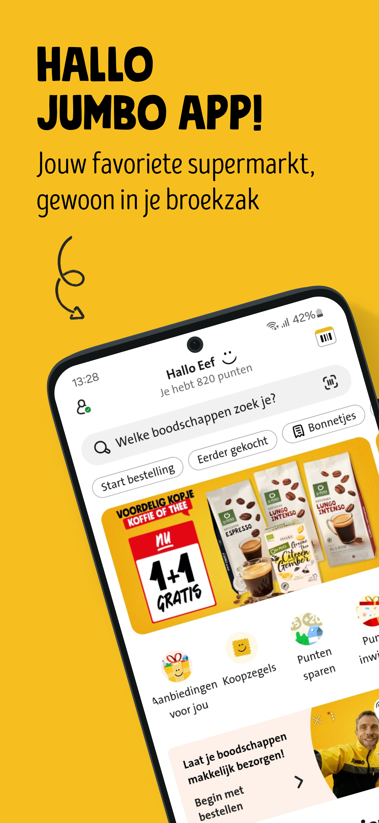 Everything for your groceries at Jumbo, in your pocket With the renewed Jumbo app, you can shop even smarter. Whether you order at home or in the store, you have everything at hand: from your shopping list to your Jumbo Extras card. Discover the convenience of ordering online and save points for free Extras. You benefit from the service, wide choice and top quality products at low prices that you are used to from us. You can do all this with the Jumbo app: Smart and fast grocery shopping - Stay informed of all offers and all the benefits of Jumbo Extras - View extensive product information of our entire range - Easily order your groceries online - Use your shopping list, handy for ordering online and in the store All the benefits of Jumbo Extras - Scan your (digital) Extras card, save points and redeem them. - View your points balance - All products on which you save points in one overview - Exchange your points for the best extras - Save stamps digitally for our savings promotions - Activate and benefit from 6 personal offers every week Inspiration and convenience - Choose from more than 20,000 simple, affordable and above all delicious recipes - Save your favorite products and recipes in My Jumbo - View our new brochure every week - See what you have previously purchased in your 'Previously purchased' list Your opinion counts We are continuously improving our app. Do you have a tip or question? Contact our customer service, see www.jumbo.com/contact. This application uses cookies (reading data from your device). Furthermore, personal data about you is also collected in other ways with the help of the application. If you choose to download and use this application, you agree that we i) place these cookies and that we also collect personal data with them and ii) that we collect personal data about you in other ways. This way we get a good picture of you as a user and we can make offers that are interesting for you. Do you want to read more about cookies and the way in which we use your personal data? Then click on the link 'Privacy policy' below, which refers to the cookie statement and the privacy statement of Jumbo. Or go to: www.jumbo.com/service/cookies-privacy
