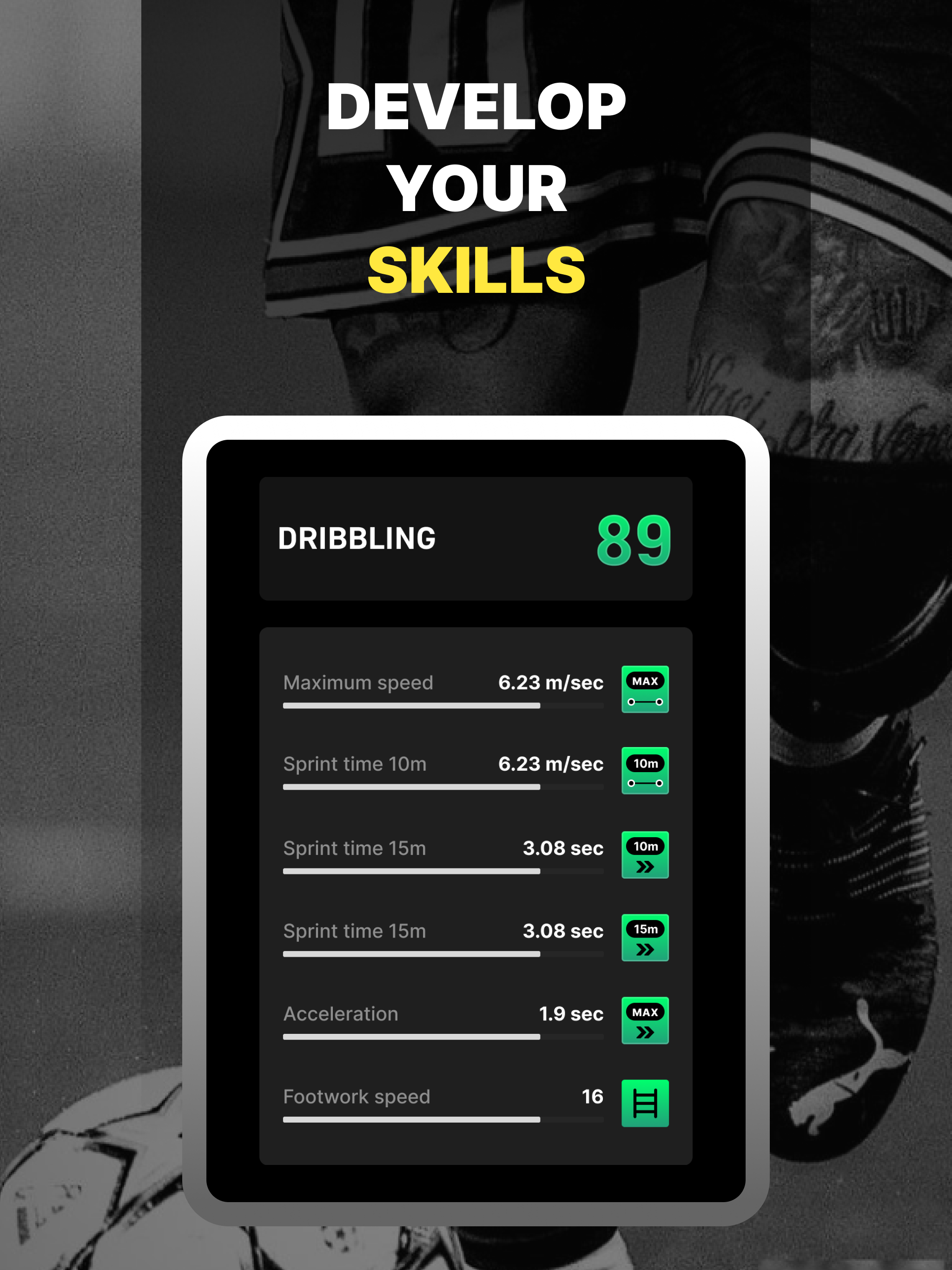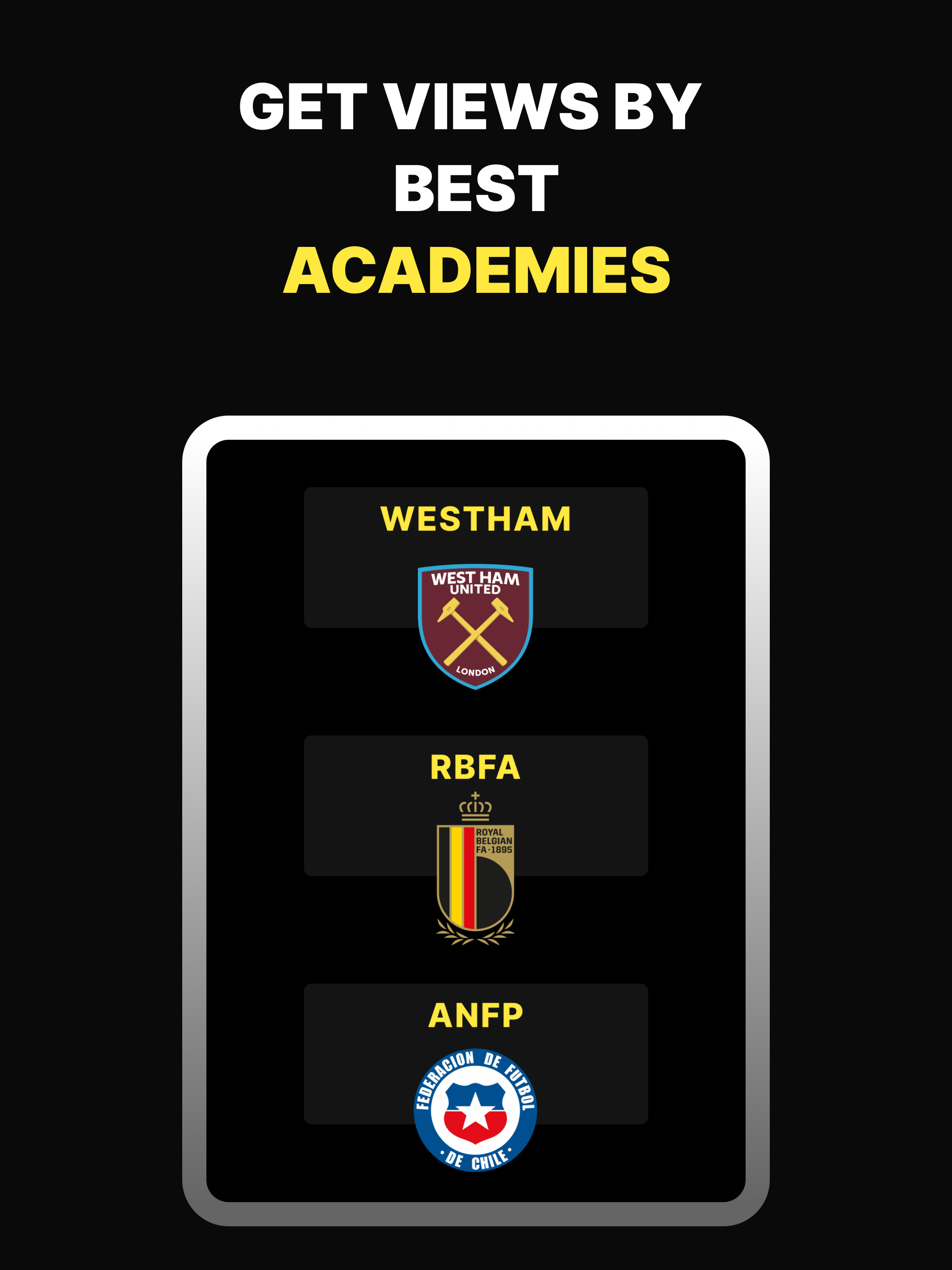Take tests, earn ratings, and join the world's elite academies: Arsenal, Manchester City, Chelsea, Liverpool, Manchester United, Real Madrid, West Ham, Barcelona, Inter Miami CF, LA Galaxy, New York Red Bulls!