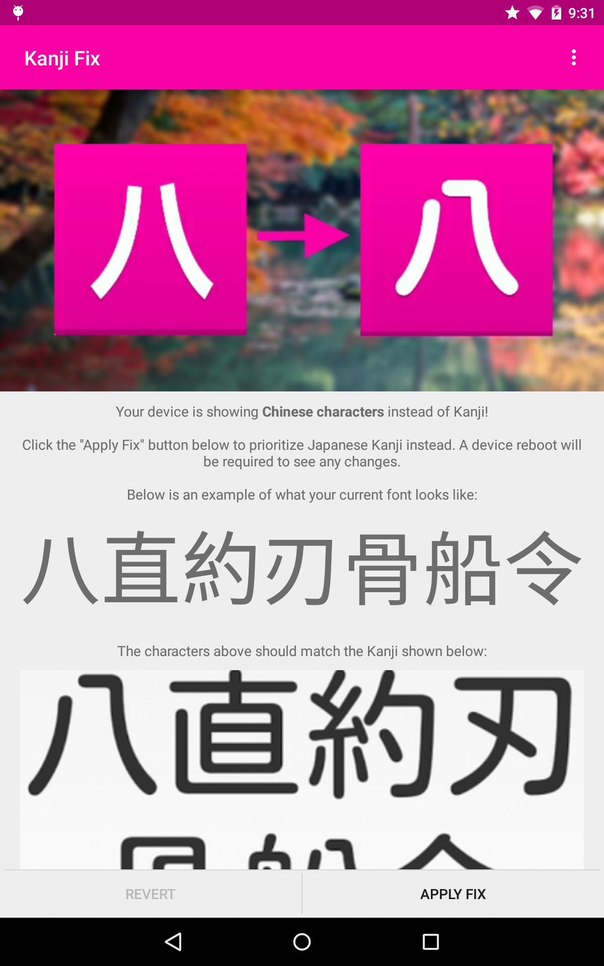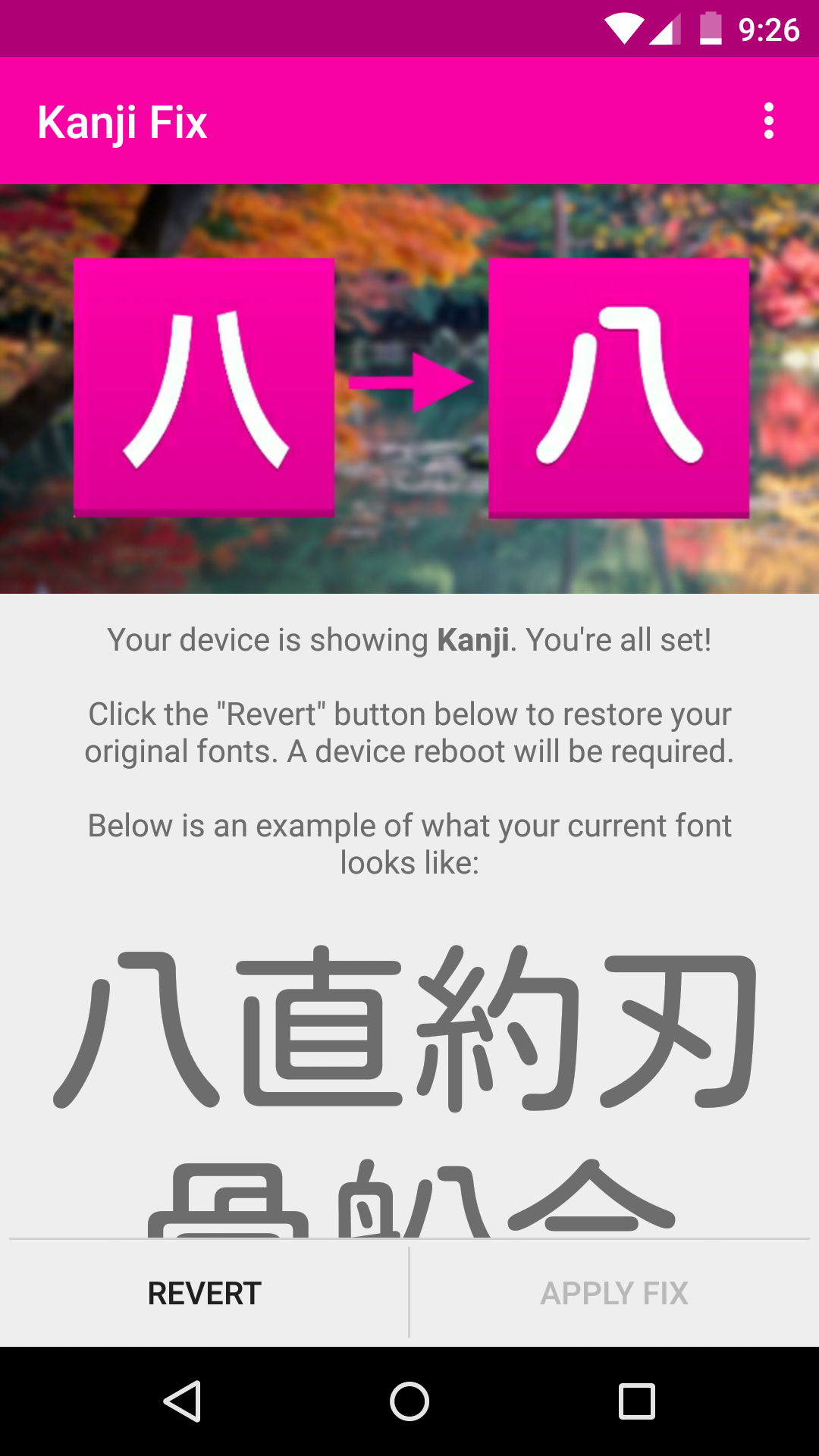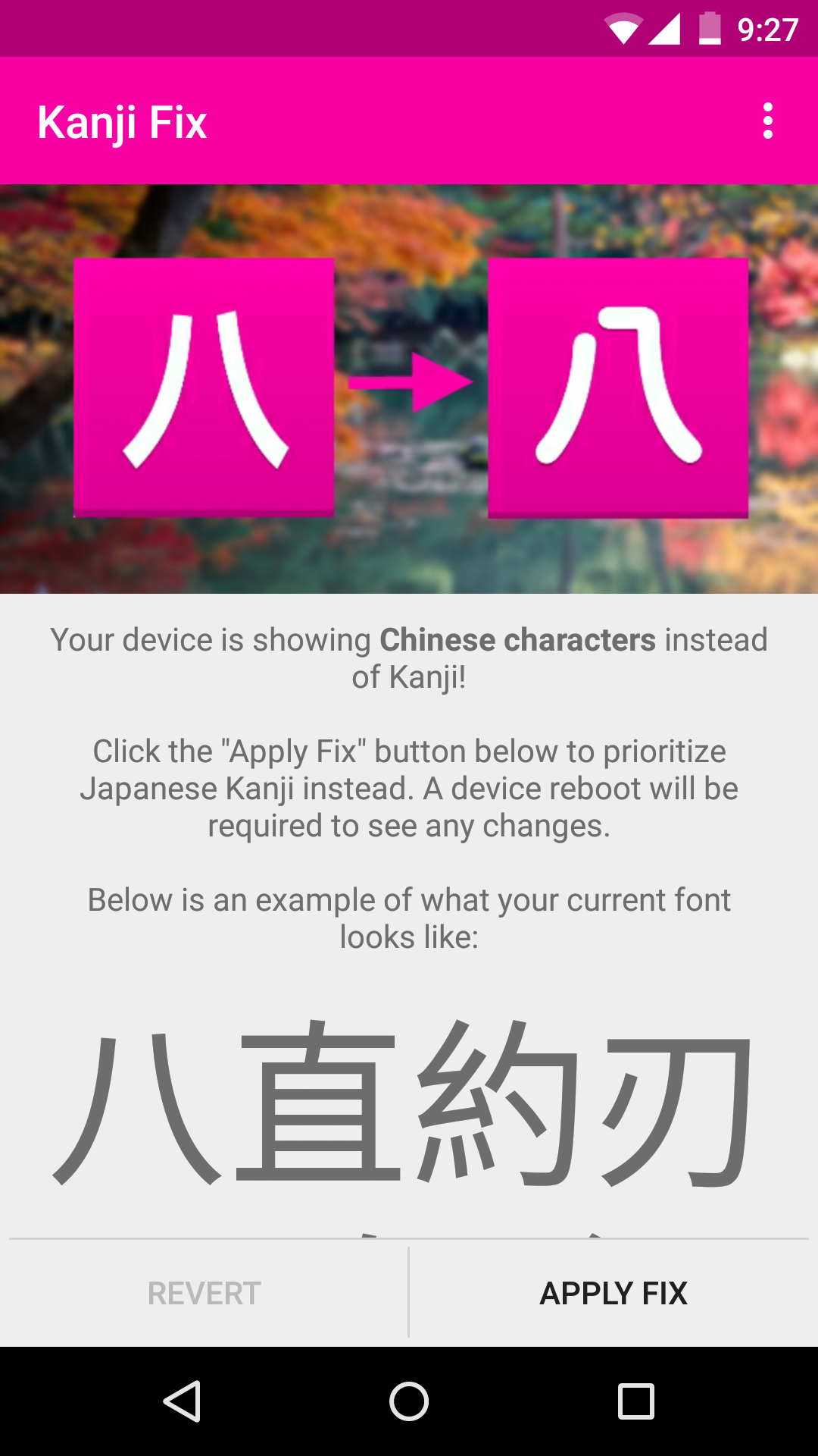 Kanji Fix is no longer required on Android 7.0+. Instead, add Japanese to your language list in Settings > Languages & Input > Languages. This will apply instantly to all apps. You can still use Kanji Fix to verify the list of Kanji look correct.