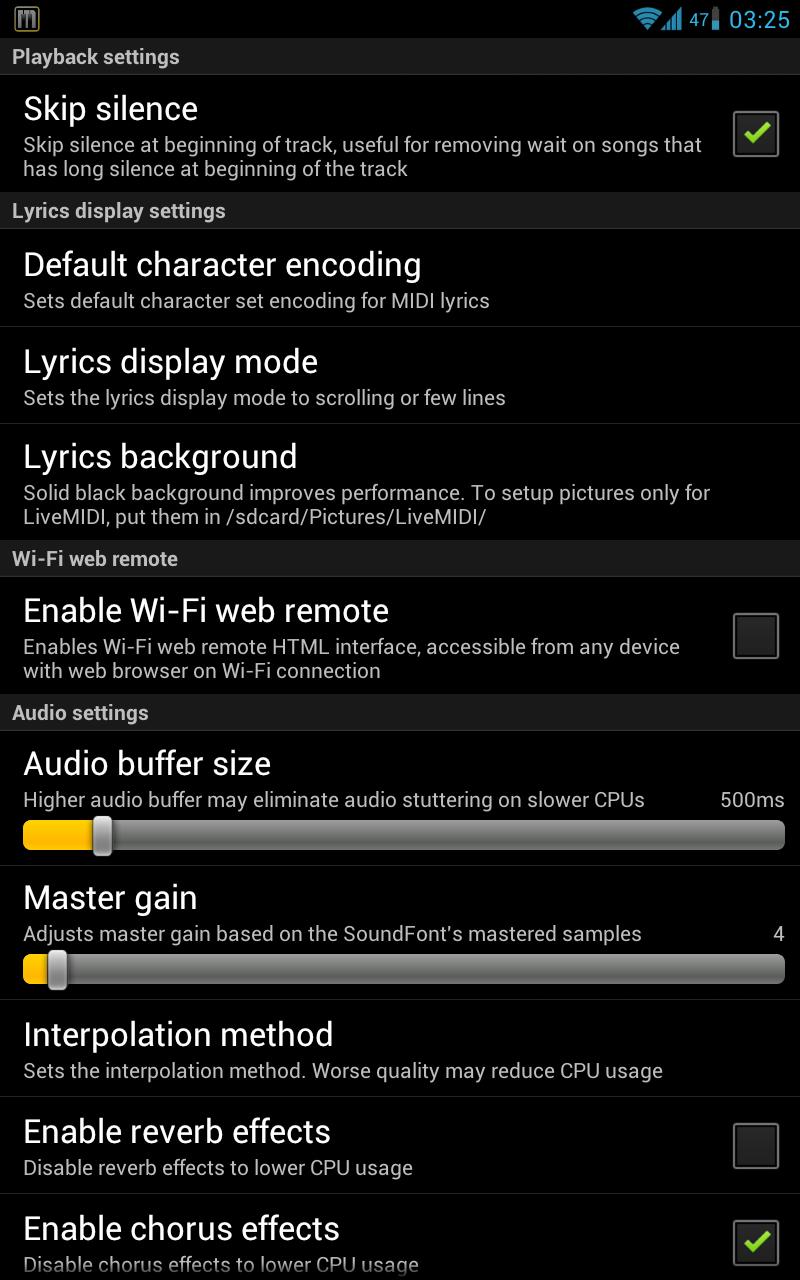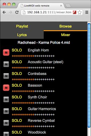 ** This is a DEMO version, limited to 30 seconds of song playback, though you can seek within that 30 seconds ;) For support on particular MIDI files, feel free to drop me an email ** Simply the best MIDI player with karaoke support for Android! Either as karaoke machine or backing music track replacing your expensive yet bulky arranger keyboard, LiveMIDI plays any MIDI and KAR files with outstanding and consistent sound quality across devices, even suitable for live performance! Minimum device requirements: - Android 2.3.x Gingerbread or higher - ARMv7 32-bit/64-bit, or x86/x86-64 CPU, dual-core 1GHz. May run on slower CPUs with linear or no interpolation, reverb and chorus turned off - 512MB RAM, may be higher if you intend to use larger custom soundfonts - 60+ MB free storage space, for application install and extracted soundfont Features: - Pitch perfect key change for any song, -8 to +8 - Tempo changes on the fly - Mute and solo channels - Tweak channel volume/gain, with settings being saved by song and by soundfont - Scrolling or fewer lines lyrics karaoke display, with background pictures - Multilanguage lyrics encodings as supported by device; ISO-8859-1, EUC-KR, EUC-JP, Big5, KOI8-R, etc. Custom support for VISCII Vietnamese character encoding (Lyrics encoding autodetection still needs improvement, so you might need to override it at times!) - Wi-Fi web-based remote control, remote-control from any wifi and browser-enabled devices! - Bundled with GeneralUser GS FluidSynth v1.451 courtesy of S. Christian Collins - Use your own GM/GS SF2 soundfonts! Simply put in /sdcard/LiveMIDI/soundfonts/ directory, restart LiveMIDI and choose soundfont to use! - Browse files through filesystem and ZIP archives, and with folder and zip-context search support