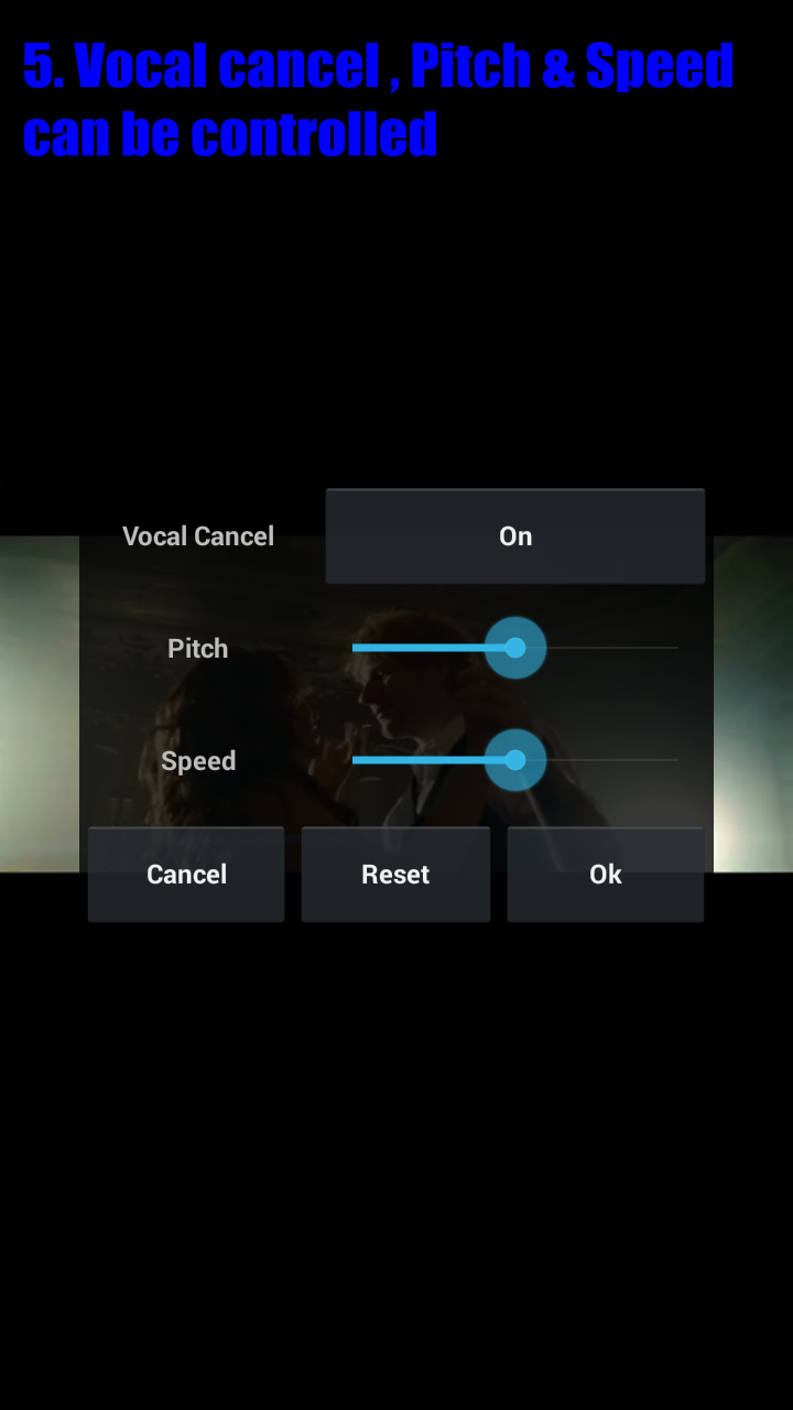 Opened the Setting menu, "Vocal Cancel" turn on or off the human voice, "Pitch" adjust the playback pitch, "Speed" adjust the playback speed.