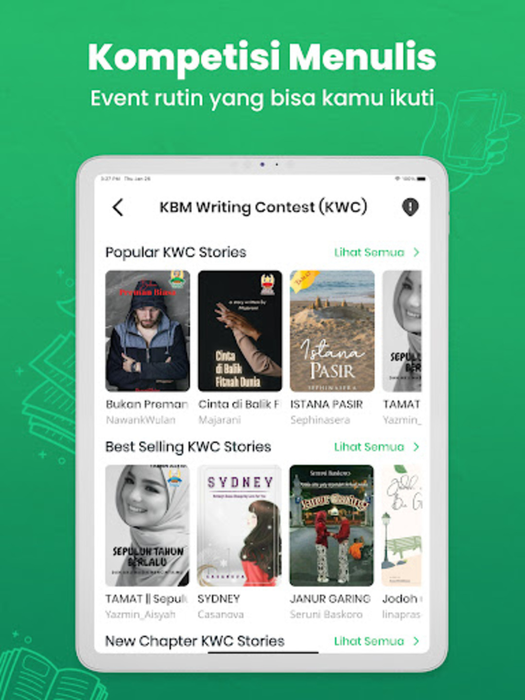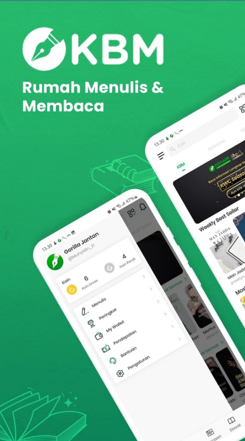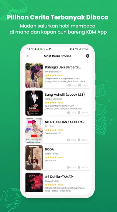 Enter a world full of stories with KBM App, the best application for reading novels and books online. From heart-fluttering romantic stories to fantasy stories full of imagination, the KBM App presents thousands of titles for all readers' tastes. KBM App Featured Features 📚 Collection of Thousands of Books and Novels From popular romance novels to classic stories that never get old, the KBM App has a large selection of books that you can read at any time. ✍️ Write and Publish Your Work Have a story you want to share? On the KBM App, you can start writing and publishing your own work. Starting from short stories to long novels, you can write everything and share it with readers. ✨ Free and Premium Content Enjoy thousands of books for free, or if you want more, you can access premium books for a more exciting reading experience. 🔖 My Reading List Forgot which page you last stopped reading? From the My Reading List feature, you can immediately continue reading without being confused looking for more pages, you know! 🎉 Fanboard On Fanboard, you can chat directly with other readers. Support your favorite authors, share your opinions, or simply swap stories with other people who share your interests. 📥 Inbox Want to chat more closely with other writers or readers? You can send and receive messages via inbox directly, making the relationship more personal and enjoyable. 💰 Coin Transfer With the coin transfer feature, you can provide support to other users. Send coins as a gift or just share kindness, and use them to enjoy various benefits in the app. 🏆 Daily Missions Complete daily missions to earn silver coins. You can use these coins to enjoy your favorite novels and exchange them for gold coins. Exciting, right? 🌟 Learn from the Stars Do you want to be a writer? Get the opportunity to take part in free weekly mentoring sessions with famous authors. Here, you can learn directly and get writing tips that are sure to be useful. 💵 Profit from Writing Writing on the KBM App isn't just a hobby, you know. You can make money from the work you write and publish here. Who knows, writing could be your path to a bigger career! 💰 Tips Do you like the story you read or even put it on your favorite story list? Give appreciation in the form of a tip as a sign of your love for the author for creating a story that is cool and fun to read at any time. 💲 Affiliate Want to earn extra money? Share your chosen story with the affiliate method. Every time a reader unlocks, you will get a commission bonus. 🎧 KBM Audio Novel Feel the sensation of listening to stories in audio novel form. It's easy to enjoy your favorite novel while traveling, working or relaxing at home! 📚 KBM Store Find cool special KBM App merchandise! Who is the KBM App for? Book lovers looking for interesting reads. Budding writers who want to share their stories. Casual readers who want to explore popular novels. Online reading app enthusiasts who love interactive communities. Why do users like the KBM App? 📖 There are lots of interesting stories! ✍️ I love being able to write and publish my own work. 💬 The community is very supportive and inspiring. 📥 Download KBM App now and start your reading experience! Follow KBM App on Social Media: 📸 Instagram: @kbmapp 🎵 TikTok: @kbmapp 💬 Telegram: Community Can Write ▶️ YouTube: KBM App Official