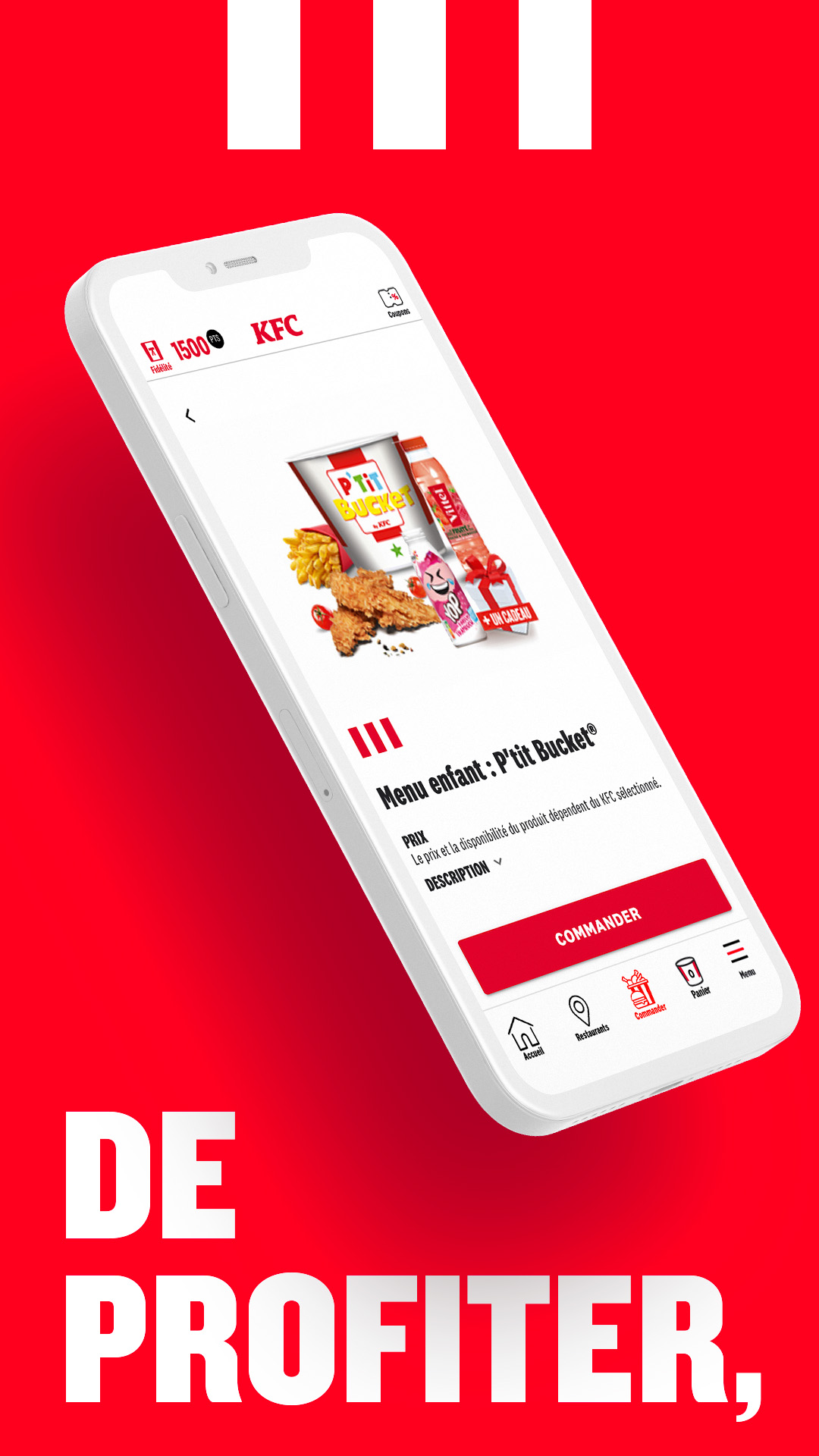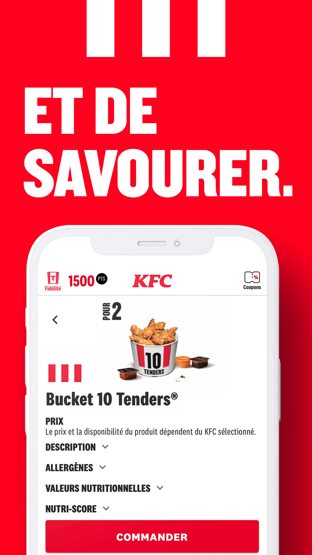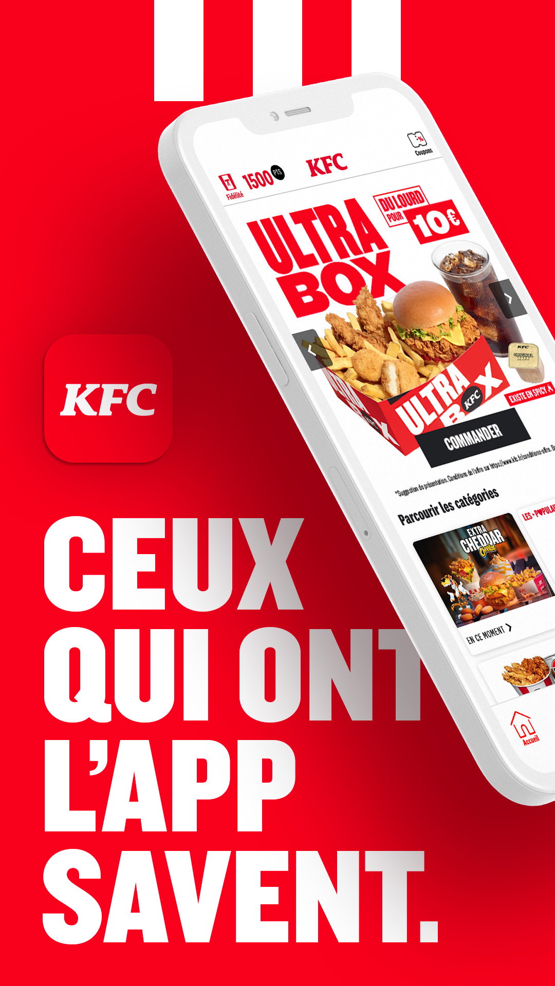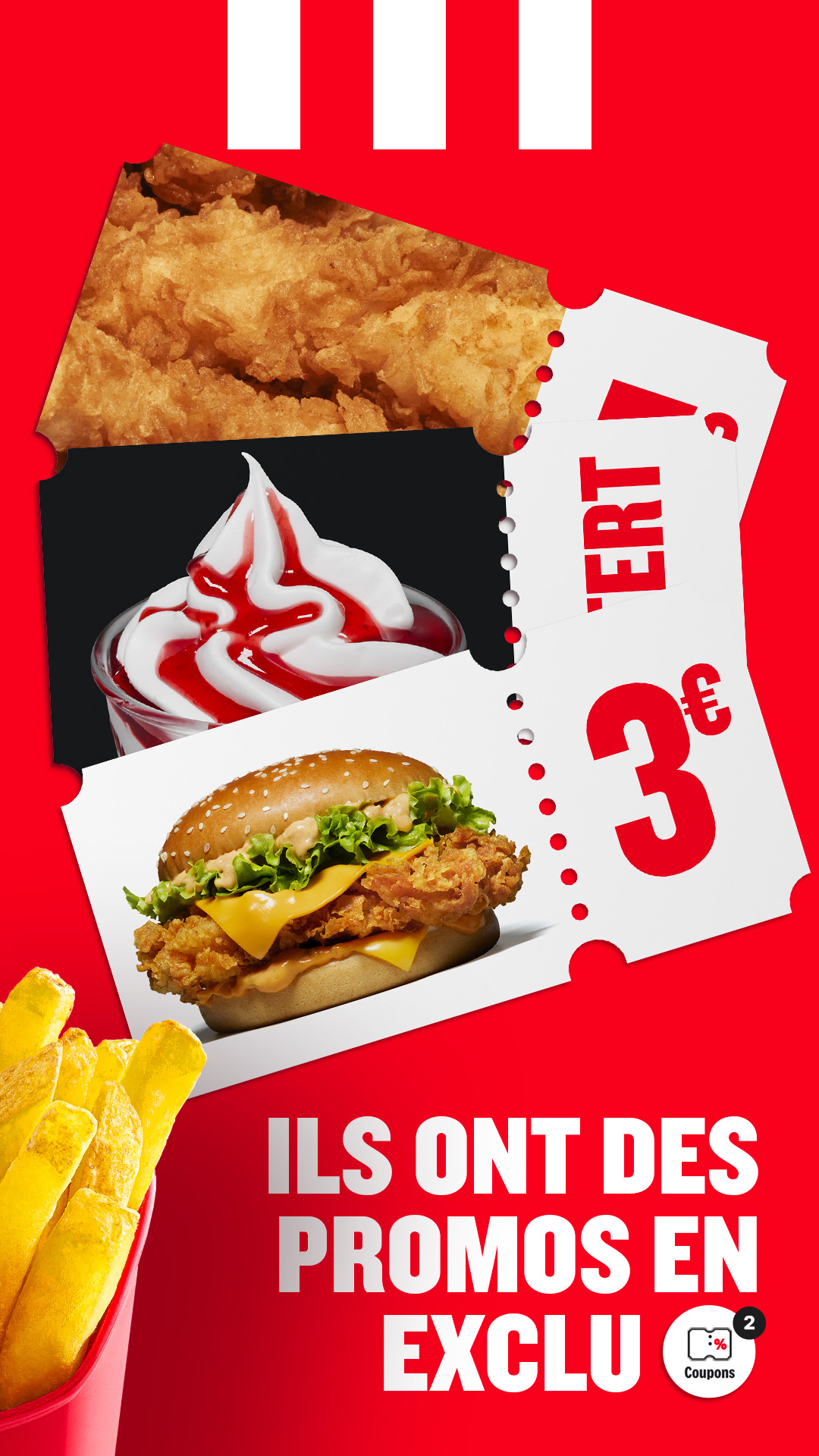 "So crispy you can't hear yourself talk with your mouth full," "Crispy on the outside and tender on the inside, a bit like you." Did you smile when you read that? Your taste buds did too. The KFC® app is likely to have the same effect on you. Download the KFC® app and order easily from your smartphone in just a few clicks for quick Click & Collect pickup at KFC® restaurants. Crispy or fried? Click & Collect, takeaway, or dine-in? No worries, we've got you covered. On the KFC® app, you'll find the new Kentucky® bacon recipe, the Colonel Original®, the Boxmaster®, our wraps, our Bucket® to share or enjoy solo, as well as our Caesar and Crispy salads. Ordering online via the KFC® app is simple, fast, and convenient: the hardest part will be choosing! On the KFC® app, you'll find the entire KFC® menu, including our iconic products like the Kentucky® with melted mature cheddar cheese, bacon, and crispy onions, the Cheeseburger®, all our Buckets®, as well as a wide selection of burgers, salads, ice cream, and kids' meals. All our recipes are prepared fresh in KFC® restaurants, using only beef fillets, to guarantee exceptional quality and taste. All recipes, adult and kids' meals, and the latest additions are available directly on the KFC® menu in the app. Order online and pick up your order with Click & Collect to eat in, at home, or at the office. To accompany your burger, choose a salad if you're watching your calories (kcal) or Kentucky® Fries with bacon bits and crispy onions, served with Original® sauce. Fancy a dessert or a snack? Discover our selection available in the KFC® app: Sundaes, Crousti Kream®, Ultimate Cookie & Peanut Butter, muffins, and other treats. Complete your meal with a drink from our selection; enjoyment is always just a click away. The KFC® app also lets you find the address of all KFC® restaurants and easily order for dine-in or takeout with Click & Collect, depending on your preferences and location. Kids aren't forgotten either, with the Little Bucket®, a menu specially designed to introduce them to the world of KFC®. Finally, create your KFC® loyalty account directly from the app to join Team Colonel. Earn points with every order, become a member, and enjoy loyalty benefits and numerous delicious rewards at KFC® restaurants.