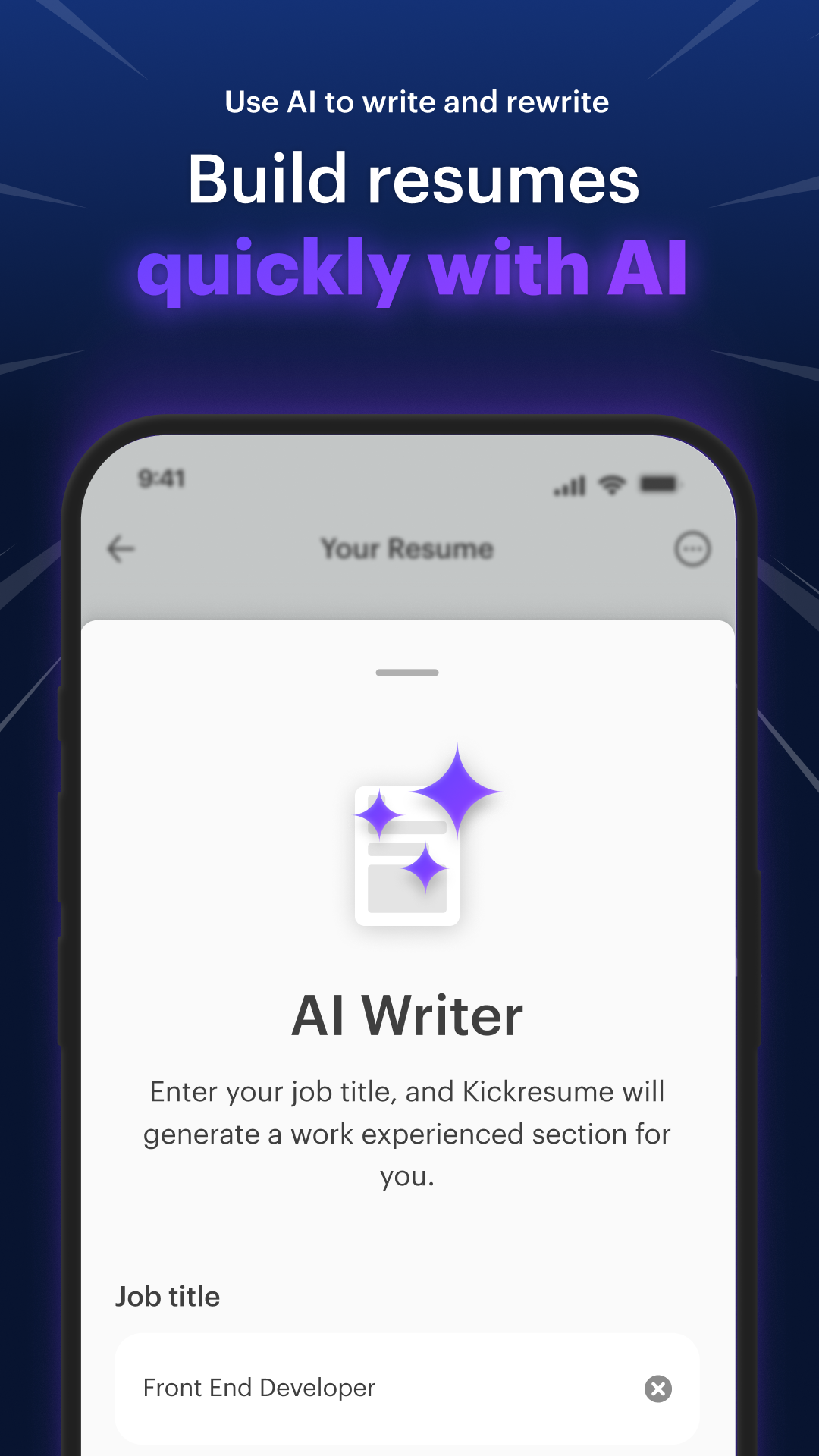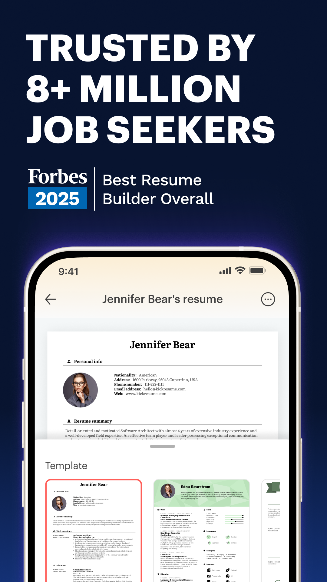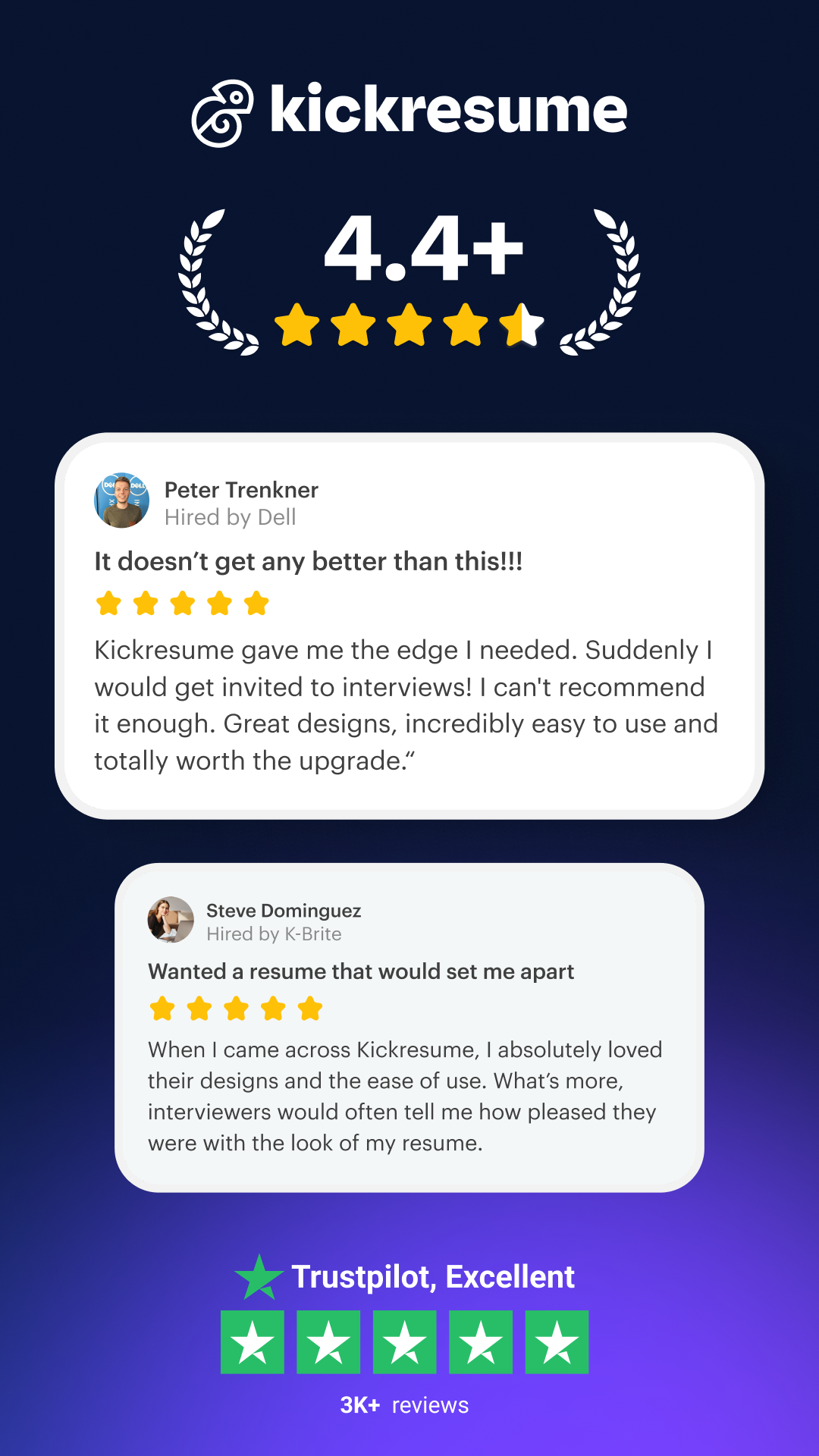 The best resume builder according to Forbes. Used by 8M+ job seekers worldwide. Thousands of 5-star reviews. Users regularly get hired at top companies like Google, Apple, SpaceX, and more. Kickresume’s ChatGPT-powered AI resume builder can generate resumes that are just as good as CVs written by human writers (only faster)—especially if you feed it your old resume or import your LinkedIn profile. Yes, our fine-tuned AI model is that good. It will tailor your resume to each job application and make your resume ATS-friendly, so you get invited to more job interviews. Kickresume will also make recruiters never forget your resume! Simply choose from 40+ customizable, ATS-optimized resume templates that were designed by a team of professional typographers and experienced recruiters for maximum impact and visibility. Do you want to make sure that your resume is better than everybody else’s? Our all-in-one career tool will calculate your resume score, optimize your resume for ATS, tailor your resume to each job application, and give you actionable resume feedback that only takes seconds to implement. Kickresume’s mobile AI resume builder makes it easy to create and edit your resumes and cover letters on the go. You can use it exclusively on your iPhone or pick up where you left off on desktop (and continue on your iPhone again if you like). All your resumes, CVs, resignation letters, and cover letters are stored in the cloud and easily accessible from any place, any device, at any time. But it doesn’t end there! Create a cover letter using a cover letter template that fits with your resume visually. Then let our AI Cover Letter Writer automatically generate a cover letter that fits with your resume in terms of content. Do you need to quit your current job before starting a new one? Leave it to our AI Resignation Letter Generator. Kickresume’s all-in-one career tool has your back even before your job hunt begins. Sign up for free or upgrade to Kickresume Premium to unlock the full power of this resume builder: more templates, more customization options, ATS Resume Checker, more AI features, and unlimited everything. - Award-winning AI resume builder powered by our fine-tuned OpenAI’s GPT-5 model. - Pick from 40+ ATS-friendly resume templates and cover letter templates. - Improve your resume’s ATS score to make sure that your resume gets past the bots, right into human hands. - Use resume tailoring to automatically adapt your resume to each job application and maximize your chances. - Translate your resume into multiple languages with our AI resume translation tool. - Have your resume proofread by our human proofreaders (we’re not all about AI, we’ll always depend on expert humans too). - Automate your cover letter creation with our AI Cover Letter Writer. - Want to quit your job? Leave it to our AI Resignation Letter Generator, and start working on that new resume. - Get inspired by 1,500+ job-specific resume samples created by people who already landed their dream job or our professional resume writers. - Learn to write a perfect CV with the help of our exhaustive resume guides. Privacy policy: https://www.kickresume.com/privacy/ Terms of use: https://www.kickresume.com/terms/
