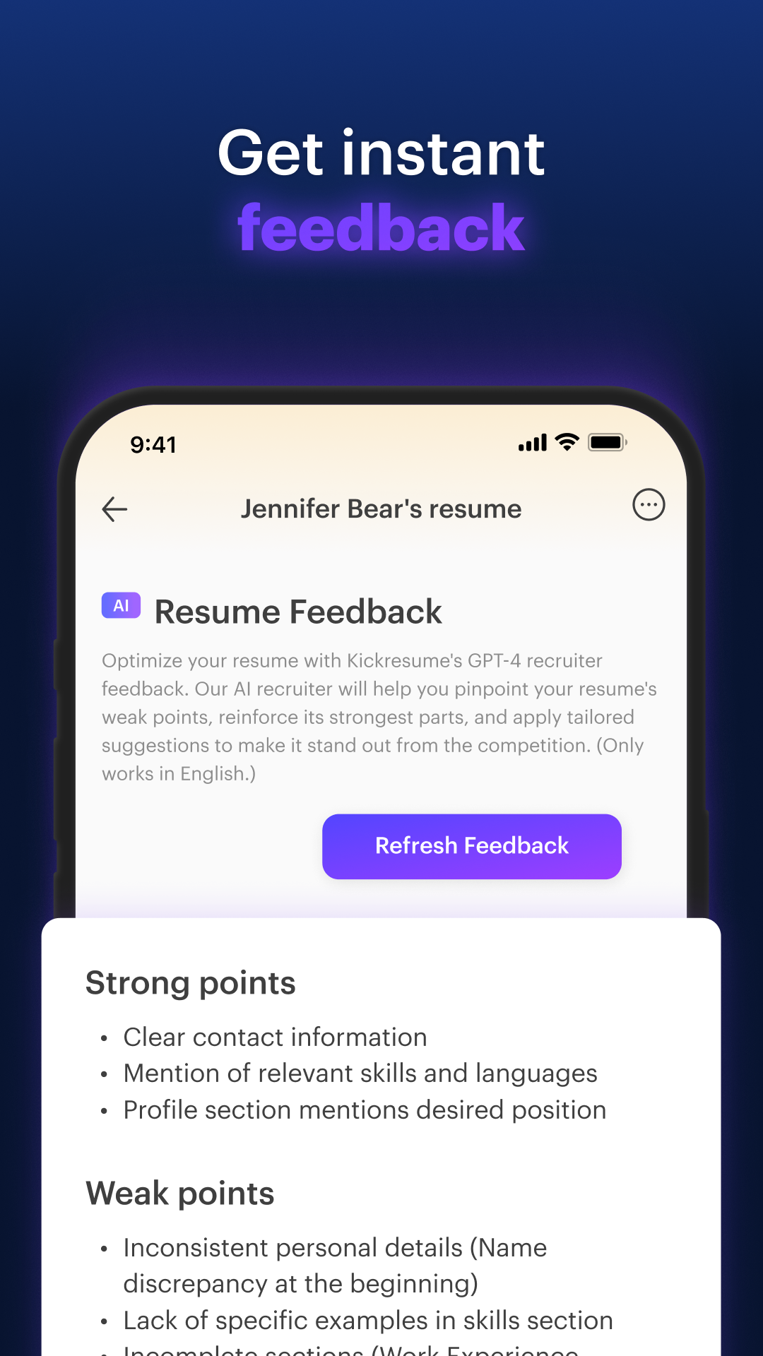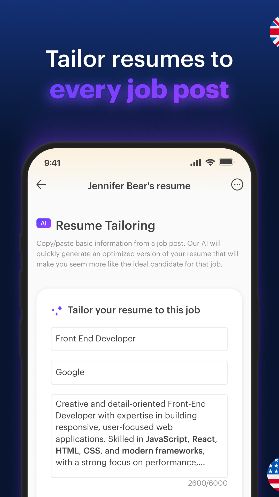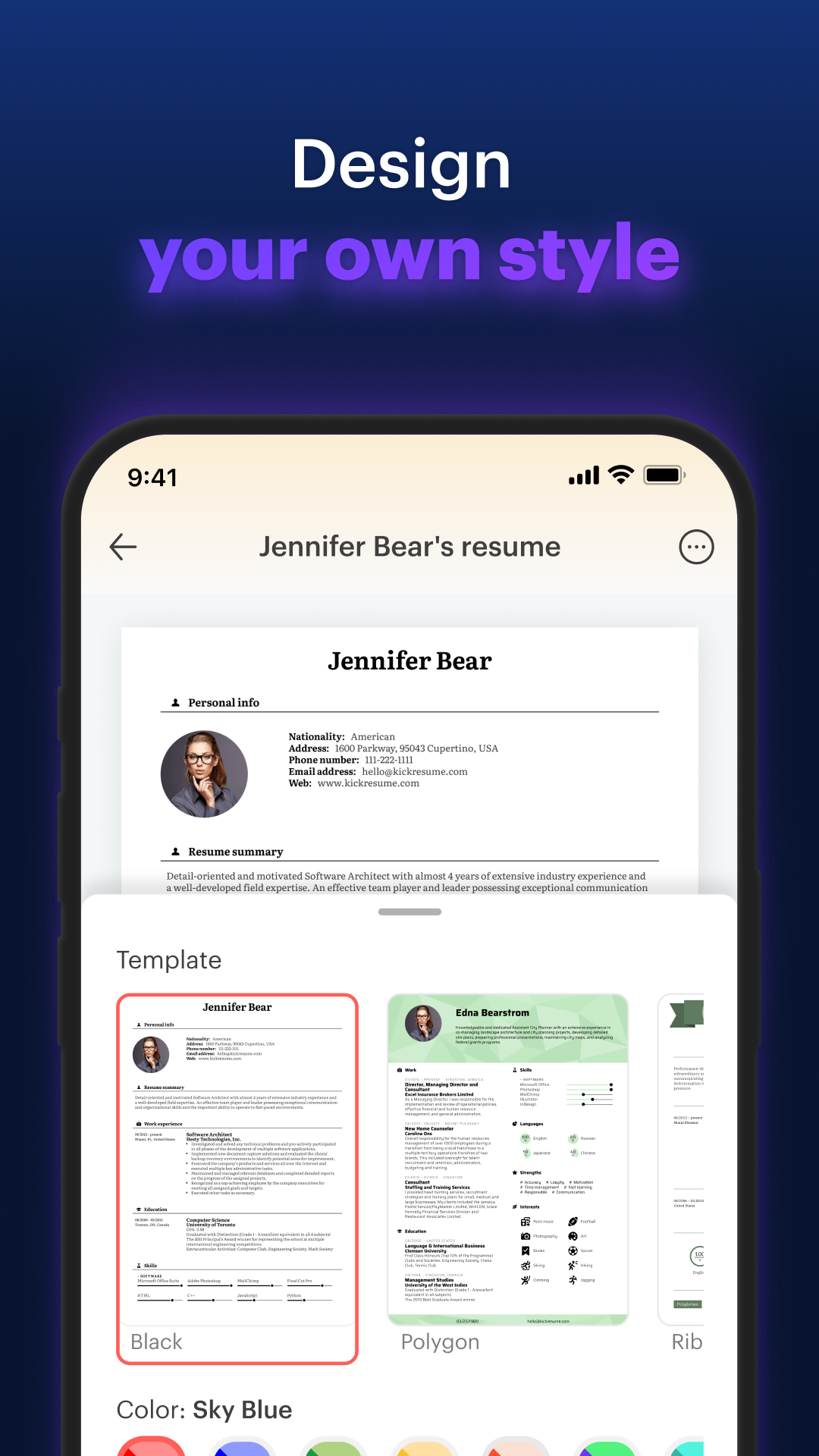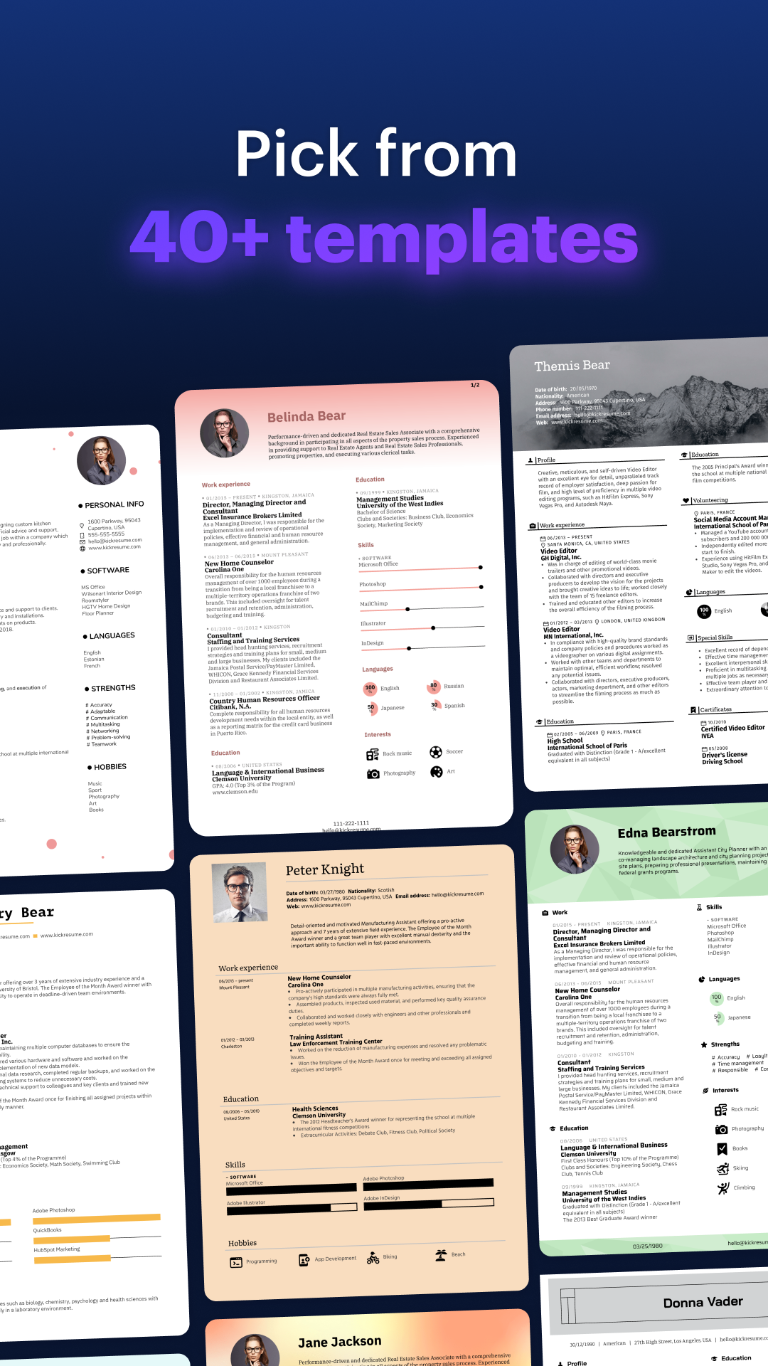 The best resume builder according to Forbes. Used by 8M+ job seekers worldwide. Thousands of 5-star reviews. Users regularly get hired at top companies like Google, Apple, SpaceX, and more. Kickresume’s ChatGPT-powered AI resume builder can generate resumes that are just as good as CVs written by human writers (only faster)—especially if you feed it your old resume or import your LinkedIn profile. Yes, our fine-tuned AI model is that good. It will tailor your resume to each job application and make your resume ATS-friendly, so you get invited to more job interviews. Kickresume will also make recruiters never forget your resume! Simply choose from 40+ customizable, ATS-optimized resume templates that were designed by a team of professional typographers and experienced recruiters for maximum impact and visibility. Do you want to make sure that your resume is better than everybody else’s? Our all-in-one career tool will calculate your resume score, optimize your resume for ATS, tailor your resume to each job application, and give you actionable resume feedback that only takes seconds to implement. Kickresume’s mobile AI resume builder makes it easy to create and edit your resumes and cover letters on the go. You can use it exclusively on your iPhone or pick up where you left off on desktop (and continue on your iPhone again if you like). All your resumes, CVs, resignation letters, and cover letters are stored in the cloud and easily accessible from any place, any device, at any time. But it doesn’t end there! Create a cover letter using a cover letter template that fits with your resume visually. Then let our AI Cover Letter Writer automatically generate a cover letter that fits with your resume in terms of content. Do you need to quit your current job before starting a new one? Leave it to our AI Resignation Letter Generator. Kickresume’s all-in-one career tool has your back even before your job hunt begins. Sign up for free or upgrade to Kickresume Premium to unlock the full power of this resume builder: more templates, more customization options, ATS Resume Checker, more AI features, and unlimited everything. - Award-winning AI resume builder powered by our fine-tuned OpenAI’s GPT-5 model. - Pick from 40+ ATS-friendly resume templates and cover letter templates. - Improve your resume’s ATS score to make sure that your resume gets past the bots, right into human hands. - Use resume tailoring to automatically adapt your resume to each job application and maximize your chances. - Translate your resume into multiple languages with our AI resume translation tool. - Have your resume proofread by our human proofreaders (we’re not all about AI, we’ll always depend on expert humans too). - Automate your cover letter creation with our AI Cover Letter Writer. - Want to quit your job? Leave it to our AI Resignation Letter Generator, and start working on that new resume. - Get inspired by 1,500+ job-specific resume samples created by people who already landed their dream job or our professional resume writers. - Learn to write a perfect CV with the help of our exhaustive resume guides. Privacy policy: https://www.kickresume.com/privacy/ Terms of use: https://www.kickresume.com/terms/