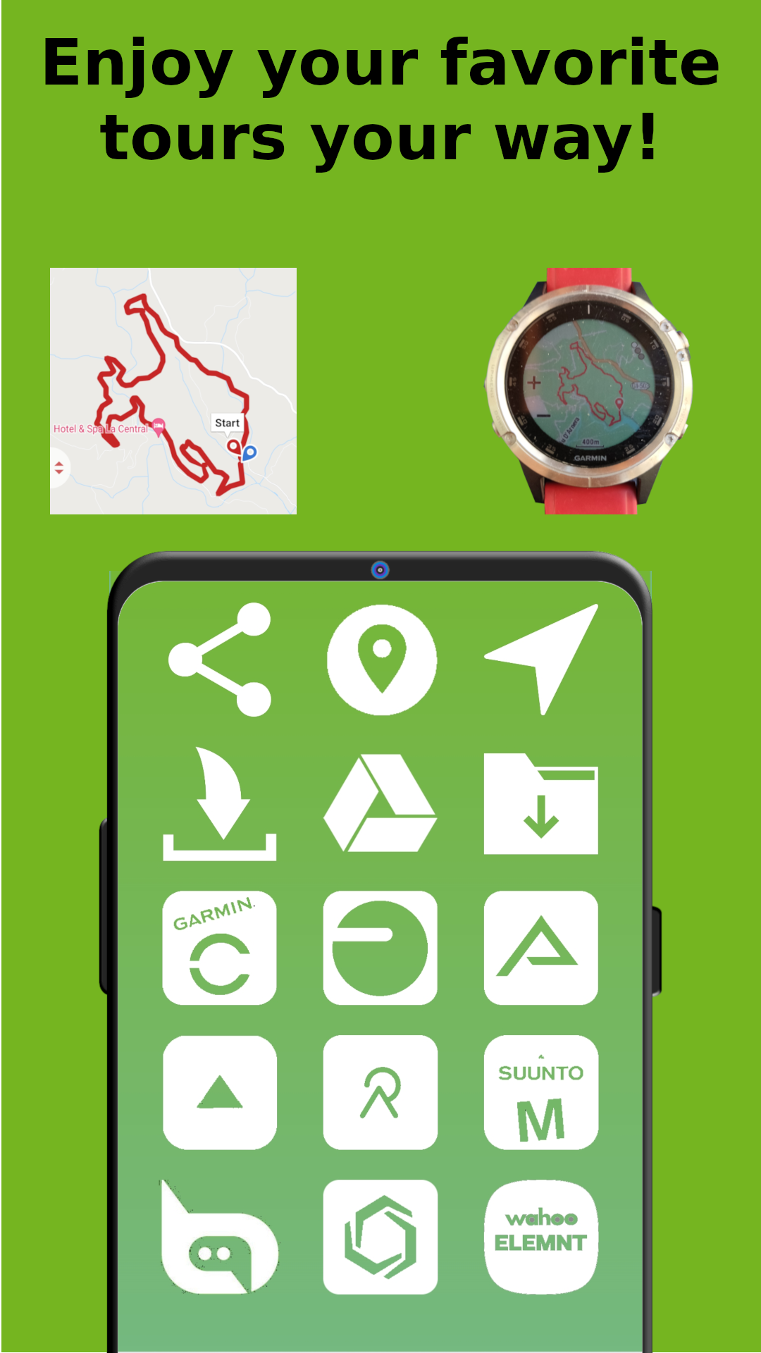- Download a GPX file from Komoot saved tour, sharing it from Komoot or type its link (https://www.komoot.com/tour/...). - Share the GPX file using Gmail, Whatsapp, ... or open it using Garmin Connect, Wikiloc, ... - Send the GPX file to you GPS device (Garmin, Suunto, Amazfit, ...) - Watch how to use on Youtube: https://www.youtube.com/watch?v=JoXFaIUuPsI&list=PLzd7QZILvgy5Ps_GXrewrPDXFT8OX3uKT&index=3&t=0s - App forum http://spark71.com/forum/viewforum.php?f=5 ** Komoot to GPX is not affiliated or endorsed by Komoot in any way. This is purely a third party companion app, for this reason the the correct functioning of this app is not be warranted lifetime ** ** To the extent legally permissible, this app, its content and the user generated content are provided "as is". The authors or copyright holders will not be liable for any damages or loss incurred to you or any other person as a result of the connection with your use of this app, its content and / or the user generated content. Your use of the app, its content and / or the user generated content is entirely at your own risk. ** ** This app is provided “as is”, without warranty of any kind, express or implied, including but not limited to the warranties of merchantability, fitness for a particular purpose and noninfringement. In no event shall the authors or copyright holders be liable for any claim, damages or other liability, whether in an action of contract, tort or otherwise, arising from, out of or in connection with the software or the use or other dealings in the software. **