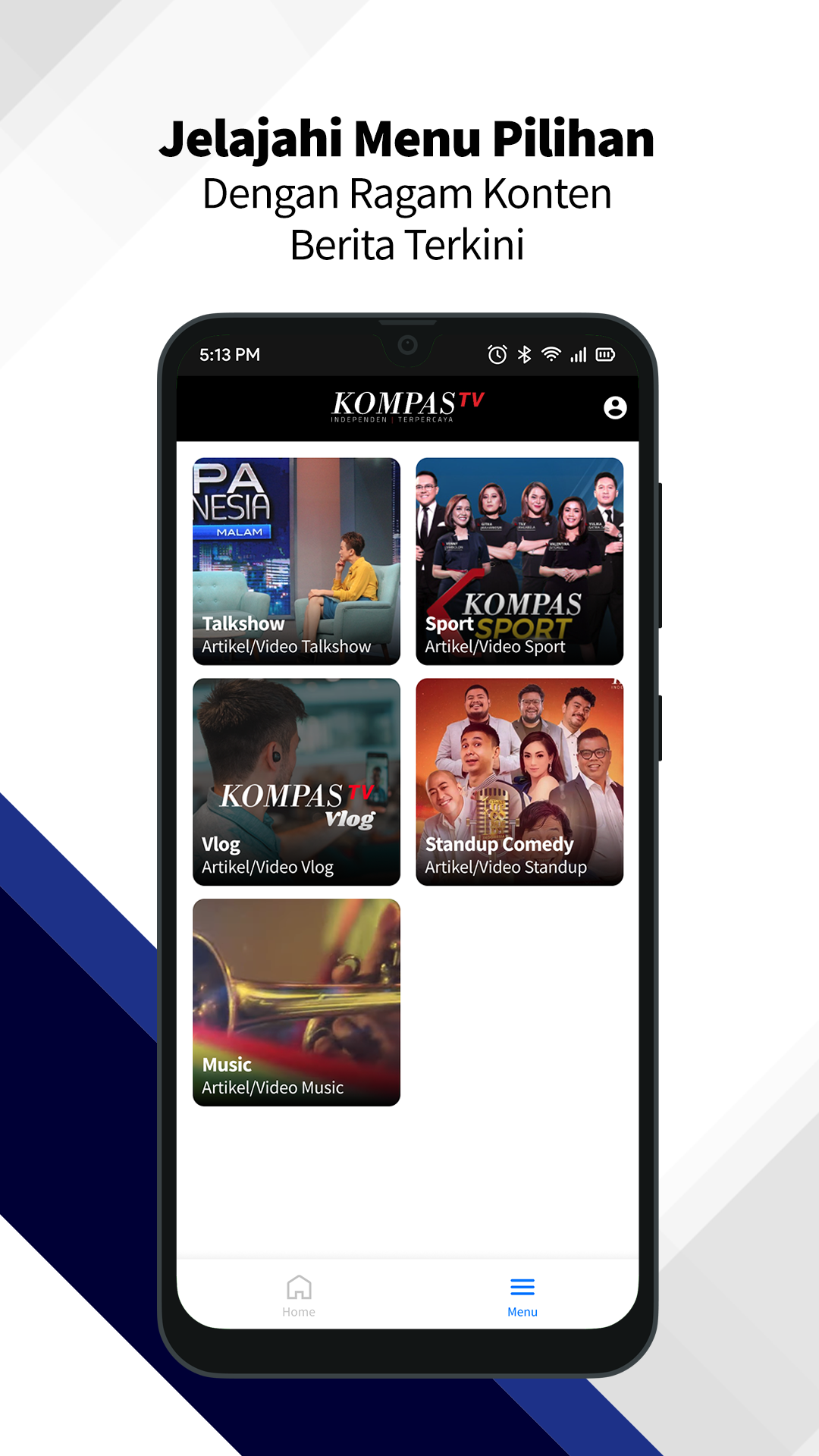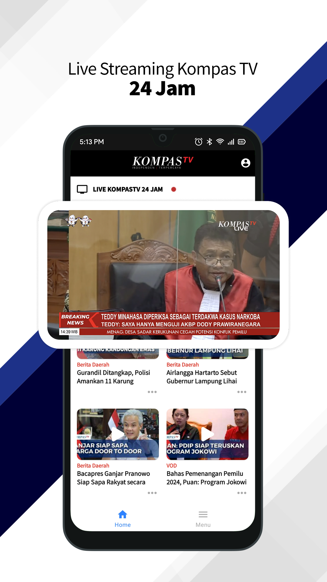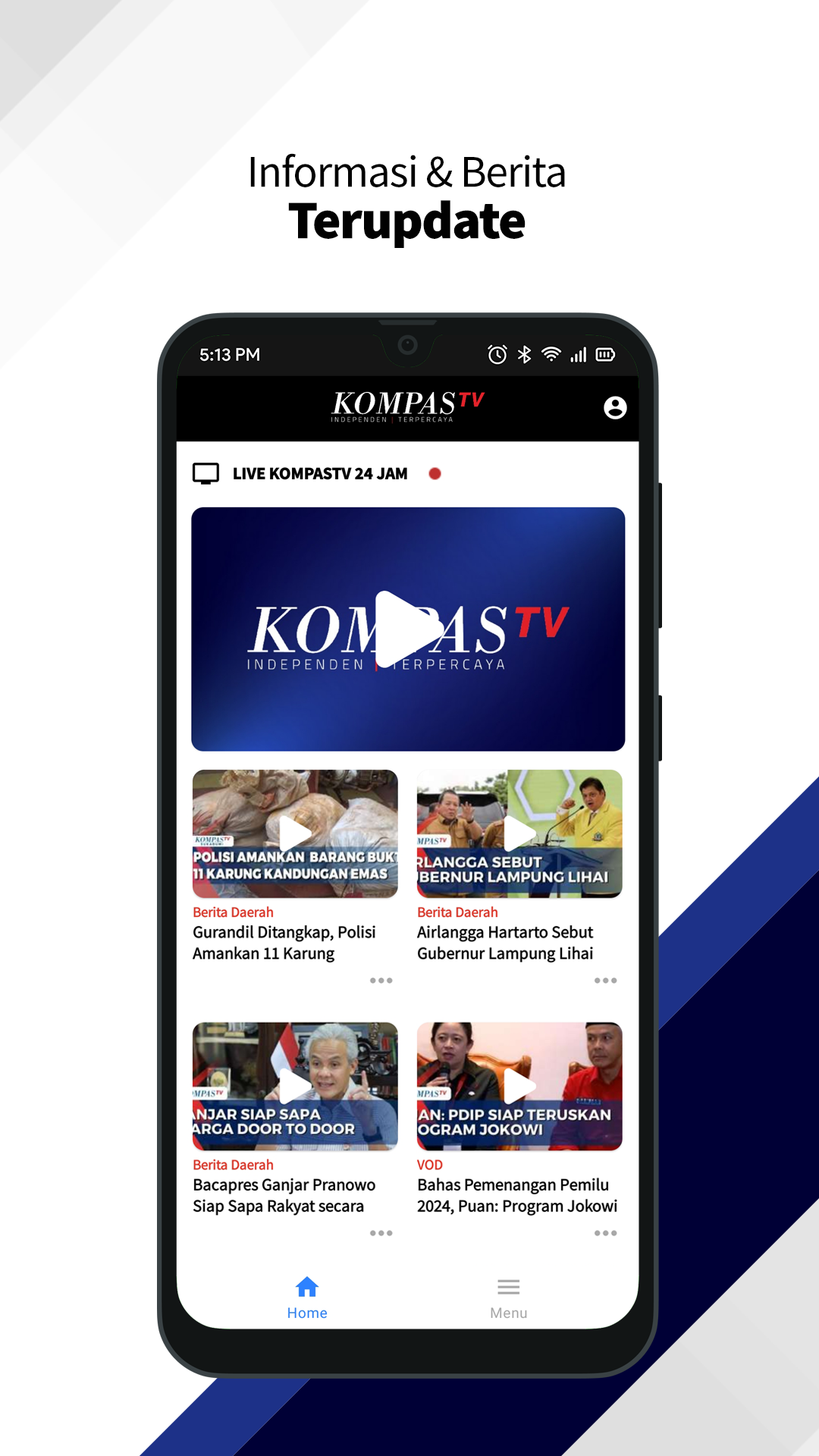 Kompas TV - Saksikan Liputan Live Streaming dan Video Berita (Eksklusif), Ikuti Interaktif TV, Liputan Berita Terkini, Independen, dan Terpercaya Dirancang dengan dukungan teknologi Android terkini, menyaksikan liputan live streaming dan menonton video berita menjadi lebih mudah, menyenangkan, dimana saja setiap detiknya. Aplikasi berita Kompas TV terbagi dalam : Cerita Indonesia Indonesia memiliki banyak peristiwa dan kisah unik nan menarik, untuk diulas dalam bentuk gambaran cerita video berdurasi singkat yang penuh informasi. Musika Foresta Bagaimana jika musisi masuk ke hutan? Top 3 News Rangkuman liputan berita terkini KompasTV yang dikemas secara singkat, padat, dan jelas dalam format digital. Izinkan Kami Sekolah (Web Series) Anak-anak yang terinfeksi HIV justru menjadi korban perundungan teman-temannya, bahkan dikeluarkan dari sekolah tempat mereka belajar. Orangutan Pulang Liputan laju deforestasi hutan Kalimantan yang tak terbendung mendorong kehidupan orangutan pada jurang kepunahan. Orangutan menderita dan mati karena penghancuran hutan hujan tropis secara sistematis. Orang-Orang Jakarta (Web Series) Liputan yang bercerita seperti apa kehidupan yang ada di ibu kota, dari sebuah sudut pandang. The Interview with Tukul Bersama Tukul Arwana, talkshow inspiratif yang mengundang tokoh-tokoh penting dari kalangan pejabat, penuh cerita mengenai kehidupan, karir, isu terkini, hingga rahasia. ROSI ROSI adalah talkshow ber-genre semi investigatif yang menghadirkan sejumlah narasumber unik, dan dipandu langsung oleh Pemimpin Redaksi KompasTV, Rosianna Silalahi. Apa Kata Hukum Mengangkat isu yang tengah mewacana di masyarakat dari kacamata hukum, terutama isu yang sebenarnya masuk di ranah hukum positif, tapi kerap tercampuri isu politik dan atau kemanusiaan. Talk with Timothy Saksikan bincang-bincang dengan para tamu unik bersama Timothy Marbun dan Joshua Suherman. Dua Arah Membahas isu-isu atau peristiwa terkini dari pendapat dua kubu berbeda. Kuliner Nusantara Program kompilasi yang menyajikan beragam informasi dan sajian kuliner khas kearifan lokal Nusantara. Jalur Rempah Sebuah program dokumenter televisi (travel-history documentary) yang bercerita tentang peran rempah-rempah Nusantara dalam mengubah dan membentuk sejarah dunia. Food Story Program kuliner yang tidak hanya mengangkat tentang kelezatan makanan, tapi juga sejarah, keunikan, dan sosok di balik terciptanya sebuah sajian. Inspirasi Ramadhan Berbagai informasi dan berita seputar Ramadhan, yang siap menambah wawasan dan pengetahuan Islam Anda. Urban Cook Bersama Yuda Bustara, chef "urban" muda yang suka memasak dan berbagi resep mudah makanan sehat untuk sehari-hari. Ekspedisi Gunung Agung Menjelajahi sebuah gunung yang dinyatakan sebagai sumber kemakmuran dan spiritualisme masyarakat Bali. Olahraga Rangkuman berita dan liputan peristiwa seputar dunia olahraga, baik nasional maupun internasional. Stand Up Comedy Indonesia Ajang kompetisi melawak tunggal atau "stand up comedy" yang diikuti oleh para peserta berbakat, melalui hasil seleksi dari seluruh wilayah di Indonesia. Acara TV Informasi jadwal acara Kompas TV, update setiap hari. Live TV Saksikan liputan live streaming Kompas TV dengan kualitas HD, tersedia pilihan bandwidth yang sesuai dengan kualitas jaringan internet Anda. Interaktif TV Kirimkan komentar cerdas Anda pada Kompas TV Interaktif. Komentar Anda akan ditayangkan langsung melalui kurasi dan dibahas oleh pembawa acara Kompas TV.
