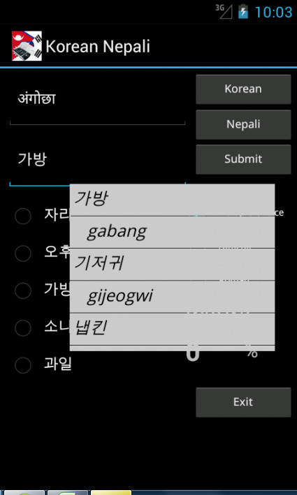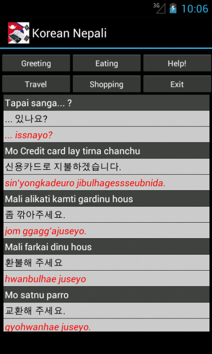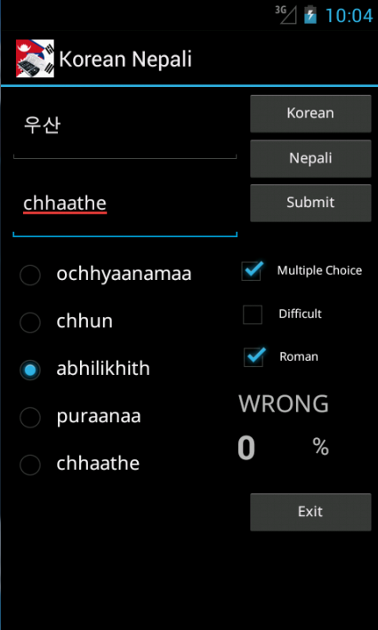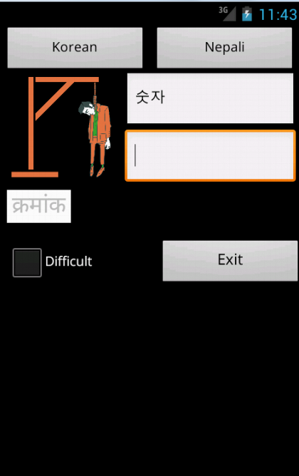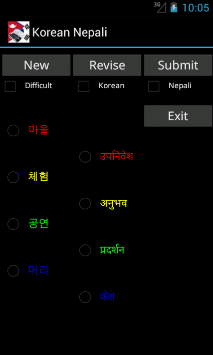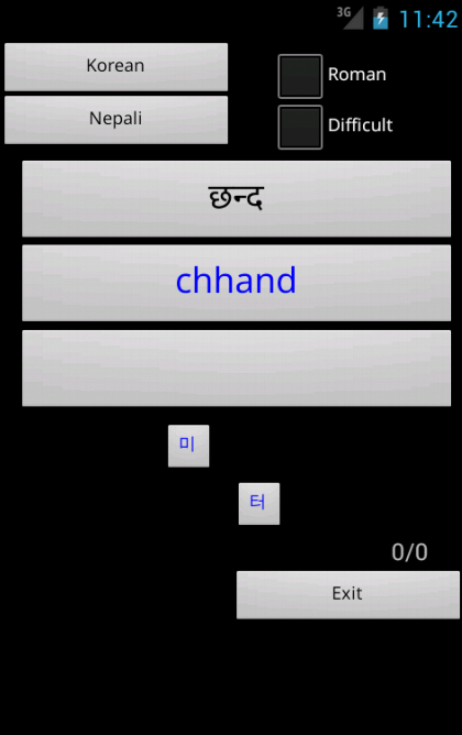 Korean Nepali Dictionary (with roman pronunciation) – travel dictionary to translate Korean to Nepali displaying a list of words in Nepali. The dictionary also translates from phonetic Nepali to Korean. Copying a word from the translated list for a reverse translation can be used to find synonyms and to understand the broader use of the Nepali word in the Korean language. Although the Korean Nepali dictionary does not provide definitions or examples, the use of the translation software in this way provides you with a mechanism to better understand Nepali words in the Korean context without the need for definitions. 20K references. Combine the Phrasebook with the dictionary to make over a 100 essential phrases. Learning games help to build vocabulary, using flashcard, multiple choice, spelling and word matching. Play the classic Hangman game. The word to guess is represented by a row of dashes, giving the number of letters. If the suggested letter occurs in the word, it is displayed in the correct position. If the suggested letter does not occur in the word, one element of the man it drawn. The game is over when the word is complete, or the hanged man is fully drawn. View the history of words used in the games and click on the list to show synonyms. Ideal for travelers, business people or students. (Uses Hindi TTS voice as close approximation) May require paid TTS voices FAQ Q. How quick are the dictionary searches A. This app takes up a small amount of space on your device and is very quick Q. Are there definitions in the dictionary A. No, but if you touch on any of the found words synonyms are displayed helping to show its use in a broader context Q. How do I play the flashcard learning game A. Select the language for the head word and select the matching word from the list below and select Submit. Q. I am a more advanced learner can I play a harder set of words A. Yes, tick the Advanced box to play against the full dictionary or untick to play against the 1500 words needed for high school Q. Can I type an answer for the head word intead of having multiple choices, for the flashcard game A. Yes, this is for more advanced learners. Untick the Multiple Choice box, type your answer and select Submit. Q. How do I play the Word Match game A. Select New, then touch the head word in the left column and it's matching word in the right column. Its colour will change. Repeat this for all words and then select Submit to check the answers Q. Can I use the Word Match game as a revision aid or word of the day A. Yes, select Revise to see the left and right words in matching order Q. Can I see synonyms in the word games A. Yes, touch any word in the game, after you have submitted your answer, to see synonyms and the broader meanings for each word. Q. Can I see a list of words that have been used in the games A. Yes, select Review History from the main menu Q. Can I see synonyms in the History A. Yes, touch any word in the history list to display synoyms Q. Can I clear the game history A. Yes, use a long touch on the list of word to be prompted to clear the history