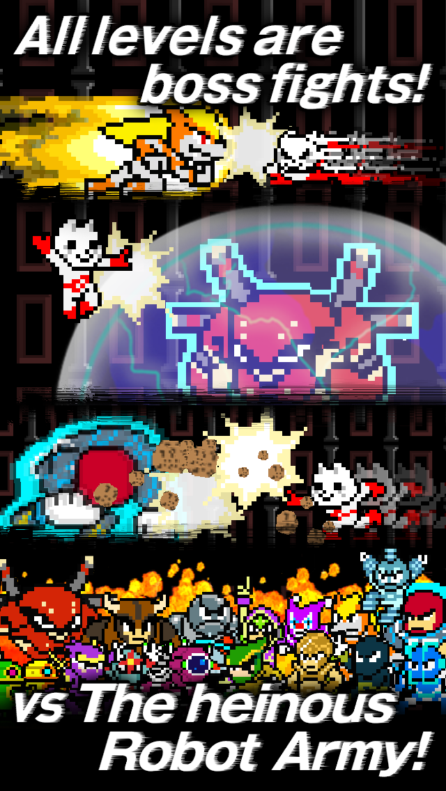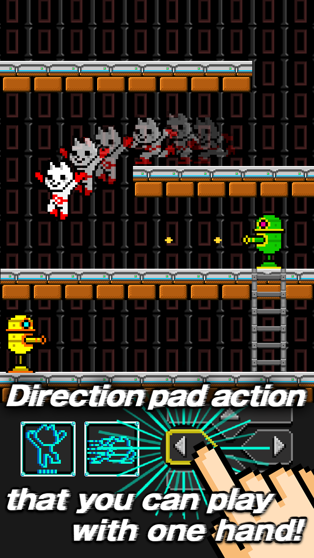 [KUFU-MAN], the high action Sci-Fi game of escape!! It is the year 2XXX... And the world is ruled by robots! In an attempt to save the world, Dr. Hidari, a scientific genius, has created Kufu-Man, a cat-type robot who will fight in the ultimate showdown. Get creative and stand up to the dreaded robots who attack you! All levels are boss fights! A continuous climax! You hardly need any action game skills! An 'escape action game' where you can usually win if you can see the key to winning!! Pixel graphics with an exciting and dramatic story! Contains everything that everyone loves! No play restrictions! You can keep playing until you cleared! [Recommended for] - People who like retro games - People who do not want to play long games (can be finished within 2 hours) - People who have stopped playing lots of games halfway through (you can see hints in the game) - People who like comic-book stories - People who want to save the world - People who like cats, and people who like white cats