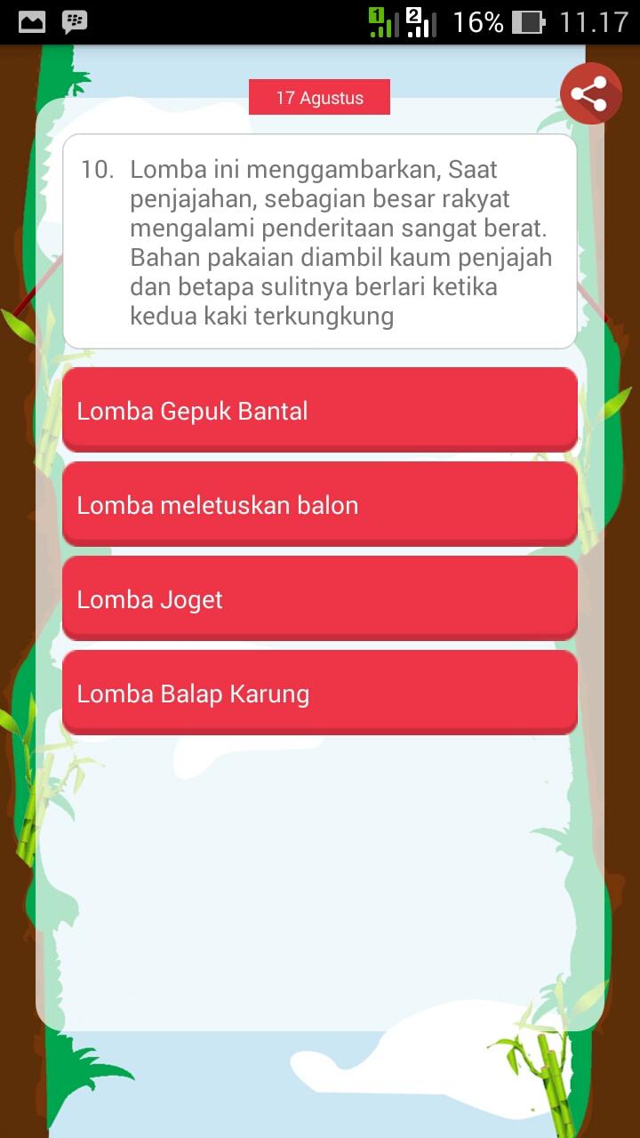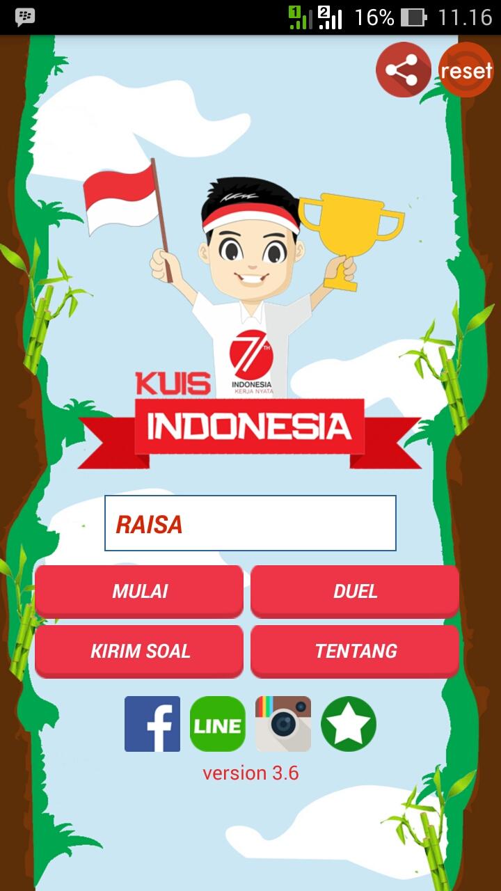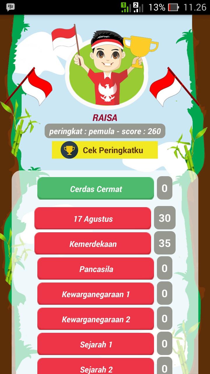 Kuis Indonesia adalah game asyik yang mengasah kemampuan logika, pengetahuan anda yang menguji wawasan anda tentang indonesia, sejarah, pahlawan, pariwisata indonesia, tokoh penemu, pribahasa, matematika,geografi, olahraga, fisika, biologi, bahasa inggris, bahasa indonesia, IPA, IPS, sosiologi, sepak bola, bahasa daerah dan pelajaran lainnya. Game ini adalah game umum yang bisa dimaikan oleh siapa saja. tipe game ini adalah game asah otak, kuis logika, teka-teki, kuis pengetahuan umum seperti pelajaran ilmu pengetahuan alam, sejarah, budaya, tokoh, pribahasa, test IQ, tes kepintaran, tebak-tebakan, tes logika, kuis benar atau salah, tebak pariwisata indonesia termasuk pariwisata dan kebudayaan daerah-daerah di Inonesia seperti Jambi, Palembang, Jakarta, Yogyakarta, Sulawesi, Papua, Jawa, Bali, kalimantan, sumatra dan lain-lain selain itu juga ada kategori spesial yaitu cerdas cermat, duel kuis indonesia (duel otak) dan terdapat papan peringkat untuk melihat peringkat yang anda raih dalam bermain game ini. game ini juga sangat membantu dalam menghadapi ujian sekolah maupun ujian nasional (UN). anda juga bisa membagikan soal ke teman-teman melalui fitur yang disediakan didalam game kuis indonesia ini.