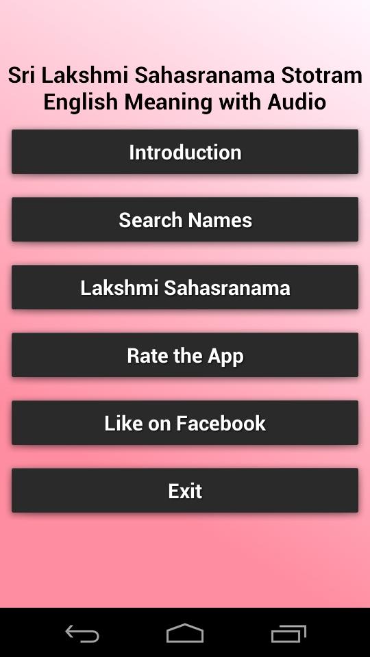 Sri Lakshmi Sahasranama Stotram (Package Name: com.omlakshmiyainama) is developed by V K R and the latest version of Lakshmi Sahasranamam 1.0 was updated on May 23, 2014. Lakshmi Sahasranamam is in the category of Music & Audio. You can check all apps from the developer of Lakshmi Sahasranamam. Currently this app is for free. This app can be downloaded on Android 2.2+ on APKFab or Google Play. All APK/XAPK files on APKFab.com are original and 100% safe with fast download.