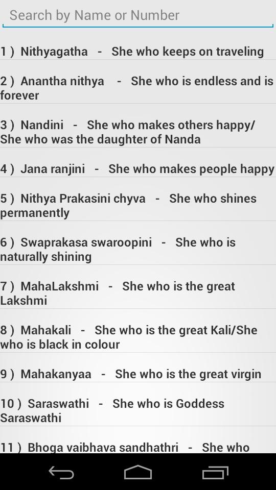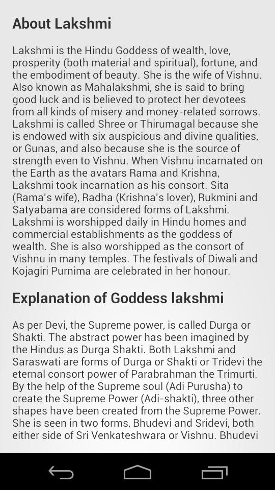 About Lakshmi Lakshmi is the Hindu Goddess of wealth, love, prosperity (both material and spiritual), fortune, and the embodiment of beauty. She is the wife of Vishnu. Also known as Mahalakshmi, she is said to bring good luck and is believed to protect her devotees from all kinds of misery and money-related sorrows.Lakshmi is called Shree or Thirumagal because she is endowed with six auspicious and divine qualities, or Gunas, and also because she is the source of strength even to Vishnu. When Vishnu incarnated on the Earth as the avatars Rama and Krishna, Lakshmi took incarnation as his consort. Sita (Rama's wife), Radha (Krishna's lover), Rukmini and Satyabama are considered forms of Lakshmi.Lakshmi is worshipped daily in Hindu homes and commercial establishments as the goddess of wealth. She is also worshipped as the consort of Vishnu in many temples. The festivals of Diwali and Kojagiri Purnima are celebrated in her honour. Explanation of Goddess Lakshmi As per Devi, the Supreme power, is called Durga or Shakti. The abstract power has been imagined by the Hindus as Durga Shakti by the help of the Supreme soul (Adi Purusha) to create the Supreme Power (Adi-shakti), three other shapes have been created from the Supreme Power.She is seen in two forms, Bhudevi and Sridevi, both either side of Sri Venkateshwara or Vishnu. Bhudevi is the representation and totality of the material world or energy, called the aparam Prakriti, in which she is called Mother Earth. Sridevi is the spiritual world or energy, called the Prakriti. Most people are mistaken that they are separate beings although they are one, that is, Lakshmi.Lakshmi is the power of Vishnu.Mahalakshmi's presence is also found on Sri Venkateswara (at Tirumala) or Vishnu's chest, at the heart. Lakshmi is the embodiment of love, from which devotion to God or Bhakti flows. It is through Love/Bhakti or Lakshmi that the atma or soul is able to reach God or Vishnu.Lakshmi represents a more soothing, kind, warm and approachable mother figure who willingly intervenes in the lives of devotees.When asking Vishnu for grace or the forgiveness, the devotees often approach Him through the intermediary presence of Lakshmi.She is also the personification of the spiritual Fulfillment.Also, she embodies the spiritual world, also known as Vaikunta, the abode of Lakshmi-Narayana or Vishnu,She is also the divine qualities of God and the soul. Lakshmi is the embodiment of God's superior spiritual feminine energy, Param Prakriti, which purifies, empowers and uplifts the individual. Hence, she is called the Goddess of Fortune. She is believed to be the mother of the universe. About Sri Lakshmi Sahasranama stotram This stotra which occurs in Skanda Purana is taught by Sage Sanath Kumara trio to a set of 12 sages. In this Goddess Lakshmi tells that even if this is chanted without belief she would stay for ever in their clan. Features in Version 1.0 1. Sri Lakshmi Sahasranama,Sanskrit Transliteration,English Translation and their Meaning with Audio. 2. Detailed Introduction. 3. 1000 names and their meaning. 4. Easy and simple swipe page's to navigate to any page along with audio. 5. Play or pause audio on any page while reading the meaning of the Stotram. 6. Use Seek-bar to navigate to any position in audio along with their respective page. 7. Plays in background when phone is locked. 8. Auto resume from the last played position on the page. 9. Auto pause during call. 10. Share your Like on Face-book. 11. Ad free App for zero diversion while reading and listening. Other Apps : Sri Vishnu Sahasranamam https://play.google.com/store/apps/details?id=com.vs&hl=en Shiva Sahasranamam https://play.google.com/store/apps/details?id=com.osn Sri Adithya Hrudayam The Link - https://play.google.com/store/apps/details?id=com.omsuryayanama Sree Lalitha Sahasranamam https://play.google.com/store/apps/details?id=com.omsrimathanama "Sarva Loka Sukhino Bhavantu"