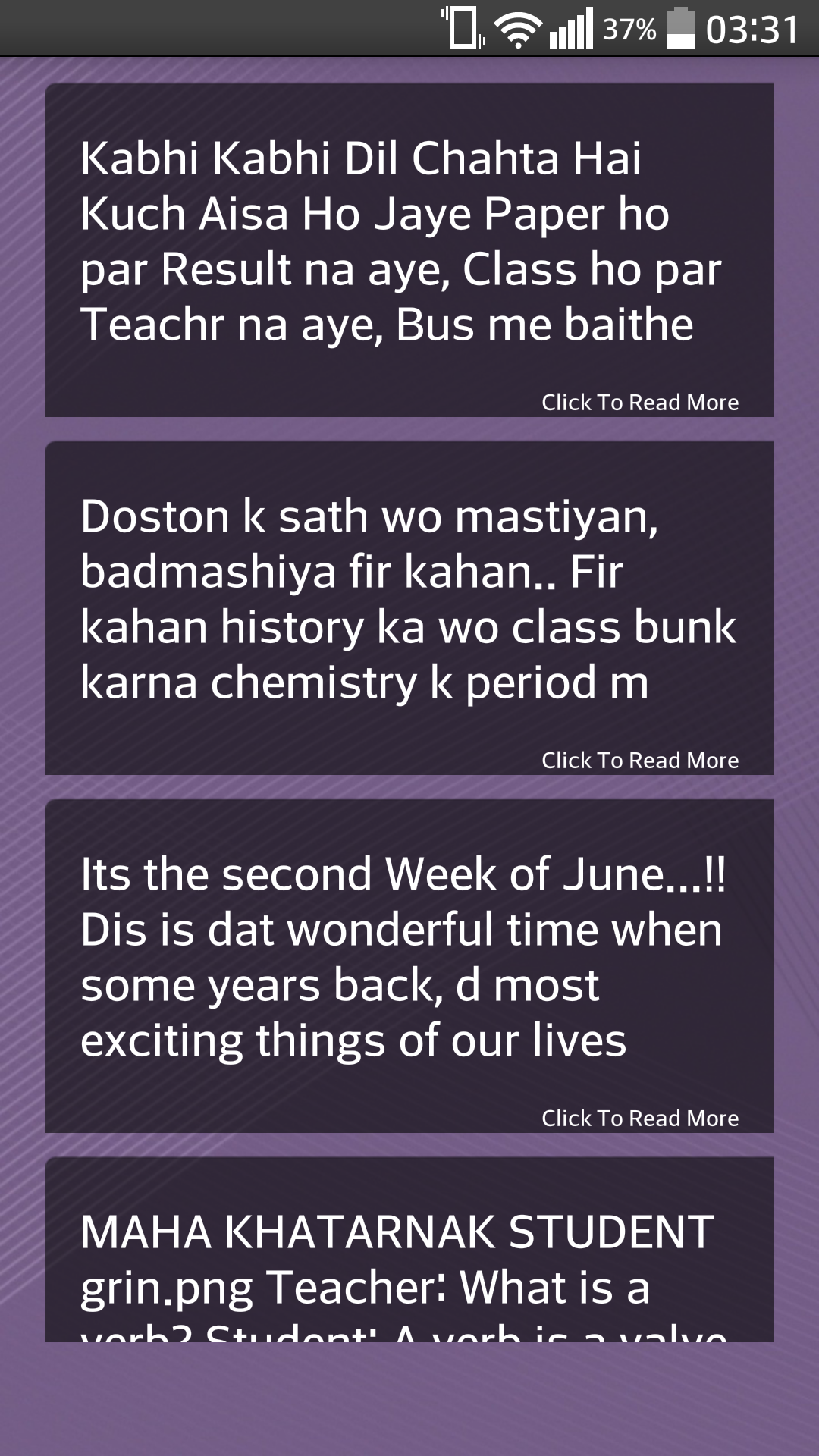 Welcome to the Hindi Jokes &SMS App.Here you will find thousands of jokes, sms and shayari's.New jokes added daily.You don't need to update app for new jokes.it will automatically grab new jokes, sms, shayari's daily when you open the app with internet connection.You can also read and share without internet connection.Some of great features of this app :- * Thousands of jokes, SMS, Shayari's * Daily new Hindi jokes and sms * While reading You can add any joke or sms as a favourite.Then You can read it any time in my favourites menu. * You can share any jokes, SMS, Shayari with one click on whatsapp, facebook, messages, or almost anywhere. * New Jokes will be updated daily you dont need to go anywhere else for new and latest jokes. * Many categories like santa banta, rajnikant jokes, Friendship jokes & sms, and many almost 25+ categories. * App design is best You can control Font size of Messages While Reading. You can still read and enjoy Jokes & SMS if you dont have a Android Device.Just visit http://www.funtoosms.com But If you have a android device we recommend please download this app because you will get all features listed above if you use android app.ENJOY!!!