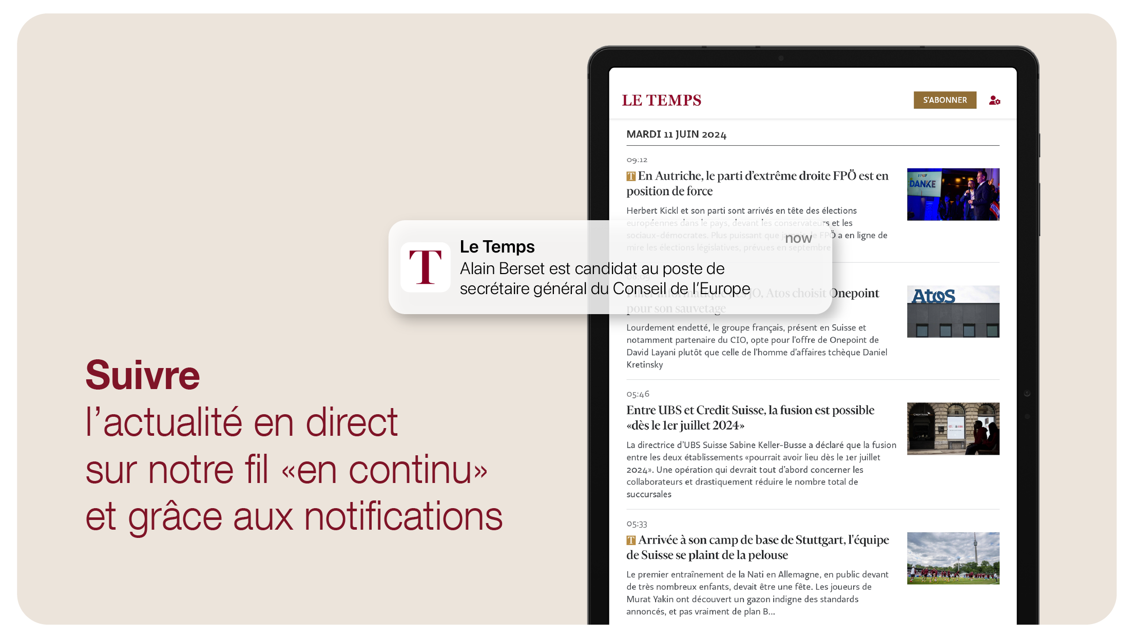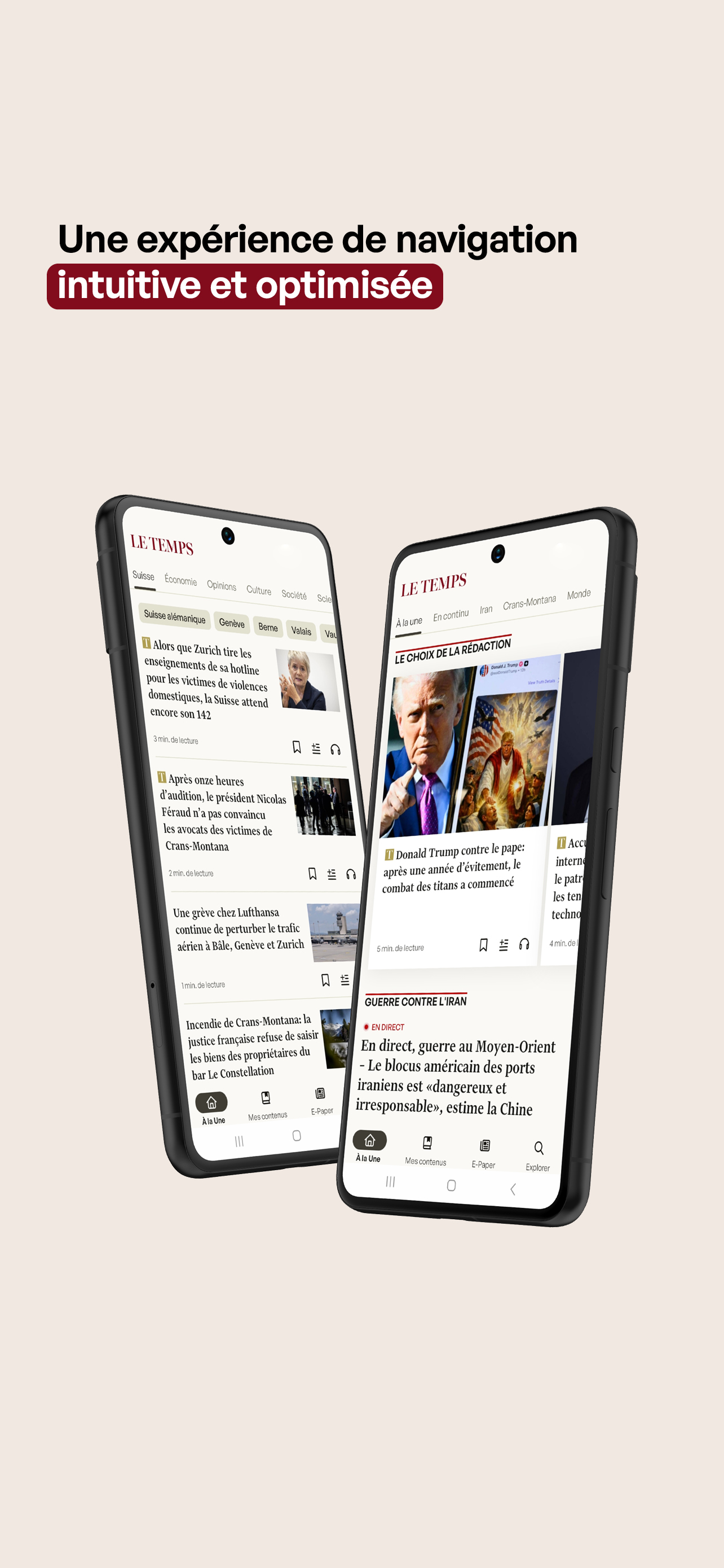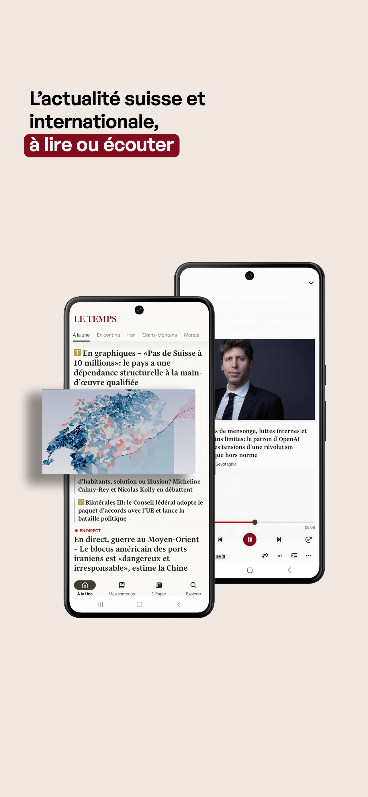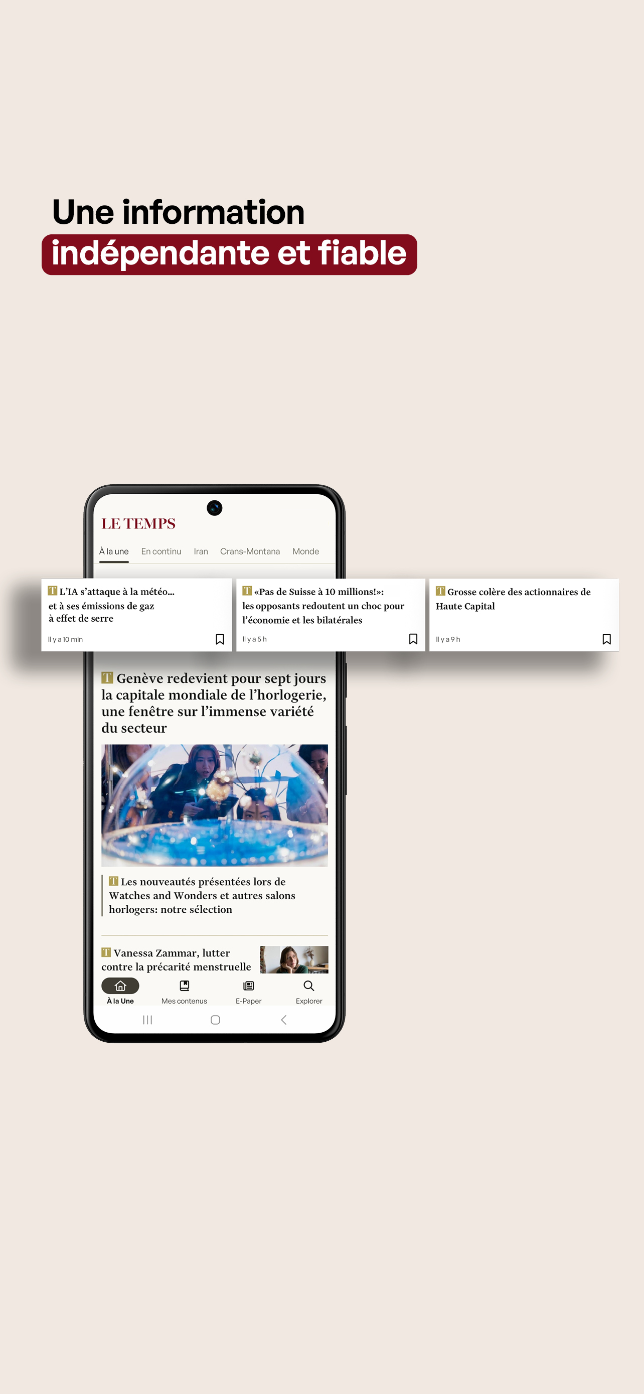 Le Temps deciphers Swiss and international news on a daily basis! Dive into the heart of the news from your smartphone, access all the articles, surveys and reports from our editorial staff and explore in depth the subjects that interest you. Browse through our different themes and formats (articles, e-paper, videos and podcasts) and enjoy a unique user experience. 🔴 Follow the news in real time: Follow the news continuously thanks to our notifications and our “continuous” feed. Find all the news in French-speaking Switzerland and nationally in our Switzerland section Follow international news thanks to our correspondents abroad ✅ Reliable and in-depth information Explore our investigations, reports and analysis on the themes that interest you: Economy, Politics, Science, Culture, Sport… Also discover our large formats and our files to understand the challenges of today and tomorrow. ⏩ Time on video Culture, economy, politics, testimony… Find all the videos from Le Temps to understand the news Follow our series and reports to tell the world Share our videos 🎙️Time podcasts Listen to all episodes of Le Temps podcasts, as soon as they are released, from the application Discover the new episodes of Brise Glace, the podcast that focuses on what we dare neither say nor ask of the people around us Dive behind the scenes of Swiss politics with Sous la coupole, the podcast that deciphers political news 📰 Read the newspaper online View the PDF version of the newspaper directly from the application Access PDFs of T, the lifestyle magazine of Le Temps, and thematic supplements 👥Subscribe to Le Temps Unlimited access to all our online content: news, reports, videos, podcasts, etc. The paper newspaper delivered to your home or accessible online A privilege program with exclusive events and benefits Discover our subscription offers from 29 CHF per month. Already subscribed? Log in to your account to enjoy unlimited access to our content and manage your subscription directly on the app. 📌With the Time app, stay connected to the news: An editorial staff of 150 journalists and correspondents in Switzerland and abroad Reliable and verified information Daily Swiss and international news Surveys and reports to better understand how the world works ➡️ Download the Le Temps application, the leading Swiss media. _________________________________________________________ 📩 Contact us: Do you have a question, a comment or do you encounter a technical problem with our application? Do not hesitate to consult our FAQ or write to us using the “Contact” section accessible in the application settings General conditions and respect for your privacy Our general sales conditions are available here: https://www.letemps.ch/conditions-generales-vente We take the protection of your data seriously. Consult our data protection policy (https://www.letemps.ch/politique-de-confidentialite) to find out more about how we process your personal information.