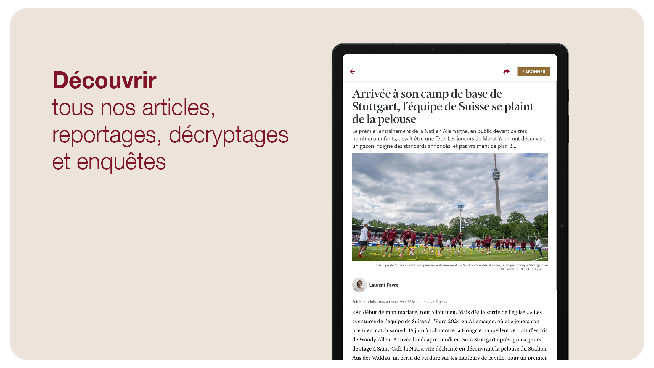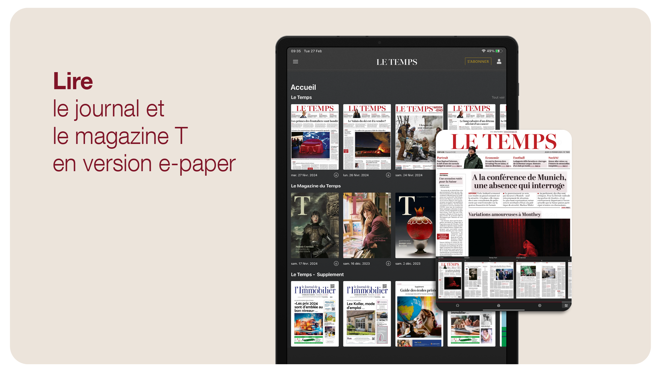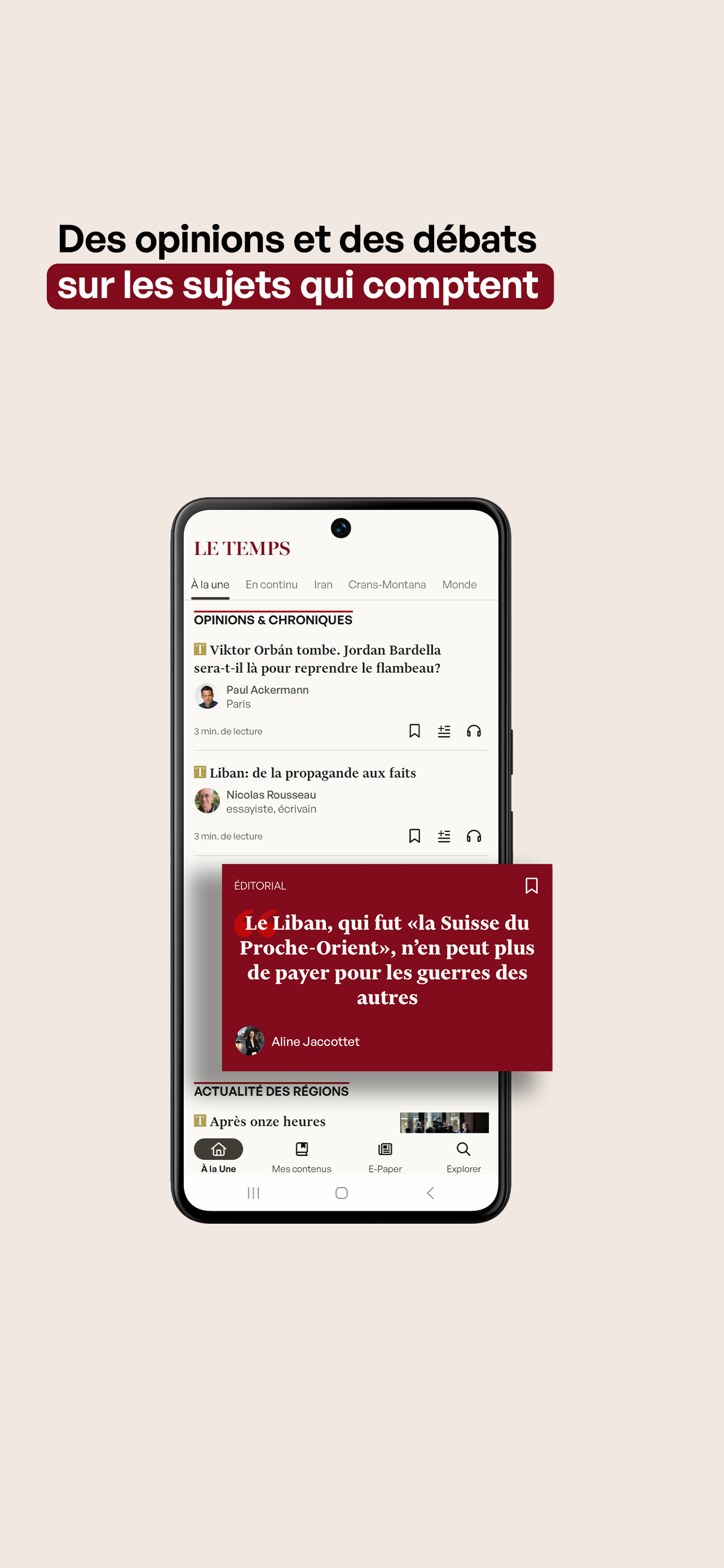 Le Temps deciphers Swiss and international news on a daily basis! Dive into the heart of the news from your smartphone, access all the articles, surveys and reports from our editorial staff and explore in depth the subjects that interest you. Browse through our different themes and formats (articles, e-paper, videos and podcasts) and enjoy a unique user experience. 🔴 Follow the news in real time: Follow the news continuously thanks to our notifications and our “continuous” feed. Find all the news in French-speaking Switzerland and nationally in our Switzerland section Follow international news thanks to our correspondents abroad ✅ Reliable and in-depth information Explore our investigations, reports and analysis on the themes that interest you: Economy, Politics, Science, Culture, Sport… Also discover our large formats and our files to understand the challenges of today and tomorrow. ⏩ Time on video Culture, economy, politics, testimony… Find all the videos from Le Temps to understand the news Follow our series and reports to tell the world Share our videos 🎙️Time podcasts Listen to all episodes of Le Temps podcasts, as soon as they are released, from the application Discover the new episodes of Brise Glace, the podcast that focuses on what we dare neither say nor ask of the people around us Dive behind the scenes of Swiss politics with Sous la coupole, the podcast that deciphers political news 📰 Read the newspaper online View the PDF version of the newspaper directly from the application Access PDFs of T, the lifestyle magazine of Le Temps, and thematic supplements 👥Subscribe to Le Temps Unlimited access to all our online content: news, reports, videos, podcasts, etc. The paper newspaper delivered to your home or accessible online A privilege program with exclusive events and benefits Discover our subscription offers from 29 CHF per month. Already subscribed? Log in to your account to enjoy unlimited access to our content and manage your subscription directly on the app. 📌With the Time app, stay connected to the news: An editorial staff of 150 journalists and correspondents in Switzerland and abroad Reliable and verified information Daily Swiss and international news Surveys and reports to better understand how the world works ➡️ Download the Le Temps application, the leading Swiss media. _________________________________________________________ 📩 Contact us: Do you have a question, a comment or do you encounter a technical problem with our application? Do not hesitate to consult our FAQ or write to us using the “Contact” section accessible in the application settings General conditions and respect for your privacy Our general sales conditions are available here: https://www.letemps.ch/conditions-generales-vente We take the protection of your data seriously. Consult our data protection policy (https://www.letemps.ch/politique-de-confidentialite) to find out more about how we process your personal information.