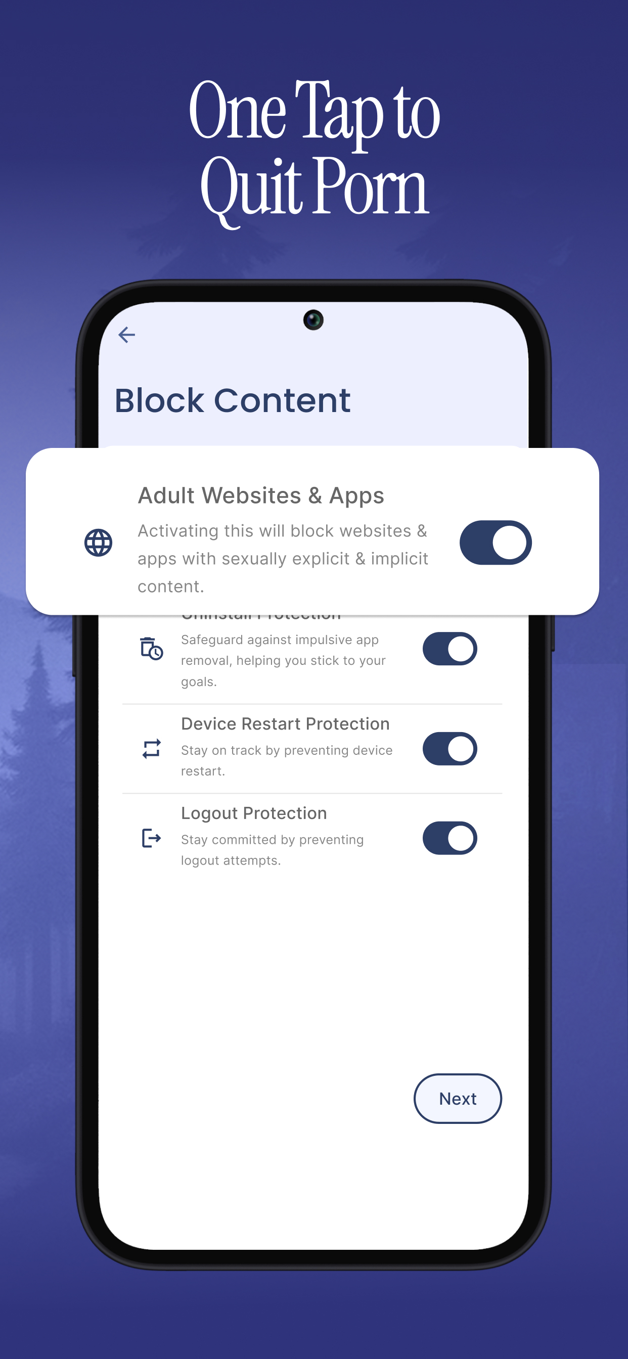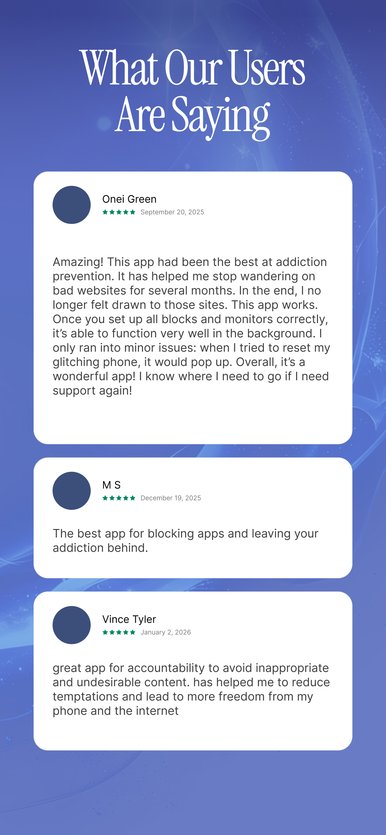 Ready to quit porn, break free from digital distractions, and regain control of your time? LeadMeNot is a powerful porn blocker, app blocker, and website blocker designed to help you block porn websites, limit screen time, and build healthier digital habits. Whether you're starting your NoFap journey or simply trying to quit porn, LeadMeNot gives you the tools to stay focused, stay accountable, and take back control of your digital life. More than just a blocker, LeadMeNot combines advanced screen time control, app time limit tools, and smart parental control features in one all-in-one digital wellness solution. Use it as a porn blocker, website blocker, or app blocker to set boundaries, enforce a screen time limit, and reduce distractions across your devices. With customizable rules that help you limit screen time and block unwanted content. It also works as a digital detox app that helps you regain focus and break free from social media addiction and distractions. Core Features 🔒 Porn & Adult Content Blocker - Advanced filtering blocks pornography, explicit content, and distracting apps across all your devices. Use LeadMeNot as a site blocker, content blocker, or adult content blocker to stay on track with your recovery and focus goals. 📵 Screen Time Control & Tracking - Define limits on apps and websites. With the built-in screen time tracker and screen time blocker, you can enforce rules that reduce time wasted on social media, streaming, or other digital distractions. 🤝 Accountability Partner System - Invite trusted friends, family, or coaches as accountability partners. Receive real-time alerts when boundaries are crossed, keeping you honest and supported in your porn addiction recovery journey. 👨👩👧 Parental Controls - Parents can monitor and limit their child’s device usage. With features like social media blocker and screen time limit enforcement, LeadMeNot offers a comprehensive solution for families aiming to maintain healthy digital habits. 📓 Daily Journaling & Self-Reflection - Built-in prompts help you understand triggers, track progress, and stay mindful of your recovery and focus improvements. 🛡️ Privacy & Security - You stay in control. Exclude specific apps or websites from monitoring, and all data is securely encrypted. 📱 Multi-Device & Cross-Platform Support - Protect all your Android, iOS, Windows, and macOS devices seamlessly. LeadMeNot goes wherever you go, enforcing rules as a reliable distraction blocker for every platform. Who Is LeadMeNot For? LeadMeNot is built for anyone struggling with porn addiction, unwanted sexual behavior, or unhealthy digital usage such as social media addiction or excessive screen time. Use LeadMeNot as a content blocker, site blocker, adult content blocker, or distraction blocker to regain focus and maintain healthy digital boundaries. Permissions & Technical Details Active Protection Mode & Foreground Service - LeadMeNot includes an Active Protection mode that continuously enforces the boundaries you set for your digital life. It runs a foreground service with a persistent notification while protection is active. What Active Protection Does • Blocks apps and websites you choose with a reliable screen time blocker and app blocker • Enforces the screen time limit and other custom restrictions you define • Monitors activity only while protection is enabled • Shows a persistent notification so you always know protection is active Accessibility Services LeadMeNot uses Accessibility Services to monitor app and in-app activity on your device. This allows you to block activity and share reports with accountability partners whenever boundaries are crossed. You can exclude specific apps or websites from monitoring at any time, making it a secure and effective digital detox app and distraction blocker for your entire device ecosystem.