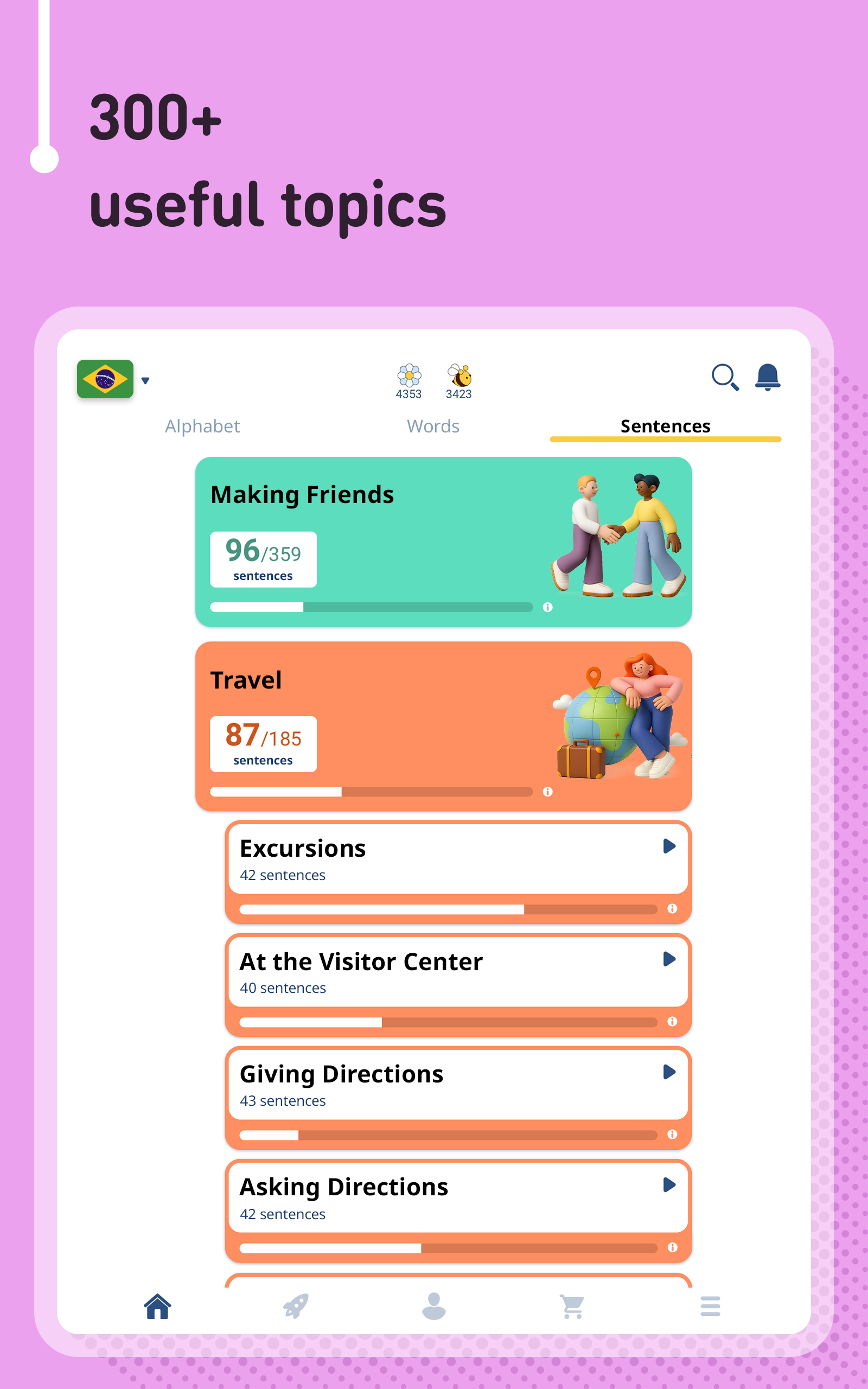 Learn Brazilian Portuguese from 61 native languages, for free & offline, with FunEasyLearn. Learn to READ 📖 WRITE ✍ and SPEAK Brazilian Portuguese 💬 Discover the fun & easy way to learn all the reading rules, all the words you’ll ever need and all the useful phrases in the Brazilian Portuguese language. 🚀 Contents • 6,000 Brazilian Portuguese words (constantly growing): the most common nouns, verbs, adjectives, etc., categorized into 7 levels and 200 topics; • 5,000 Brazilian Portuguese phrases (frequently used): the most important phrases for daily conversations and travelling, categorized into 10 levels and 120 topics. Enhance your vocabulary by learning words, sentences and expressions for beginner, intermediate and advanced learners. 🔔 Why learn Brazilian Portuguese with FunEasyLearn? FunEasyLearn reinvents language learning. Our team of linguists and teachers have developed a unique language learning strategy. The secret lies in combining an alphabet with all the reading rules, all the necessary words and a practical phrasebook into one app. This allows our users to read a word or phrase, pronounce it correctly, associate it with an illustration and practice it with listening, writing and speaking games. 🏆 Top features Hand-drawn illustrations – memorize the new vocabulary faster with intuitive illustrations; Professional audio recordings – listen to audios recorded by native speakers; Detailed statistics – analyze your results and track your progress; Review manager – review everything you learn; Smart search – find quickly the words and phrases you need; Hide what you know – hide the content you already know; Speech recognition – improve your pronunciation; Offline – use the app anywhere in the world, with no internet connection. 💼 Brazilian Portuguese for business Get access to special Brazilian Portuguese lessons created for your business. We provide specialized courses for taxi drivers, hotel & restaurant staffs, flight-attendants, shop-assistants, etc. ✈ Brazilian Portuguese for travelling Learn how to book a hotel room, order a meal in a restaurant, ask for directions, carry out a conversation and speak confidently with the native speakers. 🙌 Brazilian Portuguese for adults We adapt the contents depending on the age of the learner. Both you and your kid can learn Brazilian Portuguese and have fun. FunEasyLearn Free Subscription Subscribe for FREE, with the flowers you earn while playing language learning games. Learn Brazilian Portuguese, play for free! It’s fast & easy. 📴 📥 Download the FunEasyLearn Brazilian Portuguese course right now! Recommend the app to your friends and get a reward. Rate us and write a review ⭐⭐⭐⭐⭐ It would mean a lot to our team! Contact us: https://www.FunEasyLearn.com/