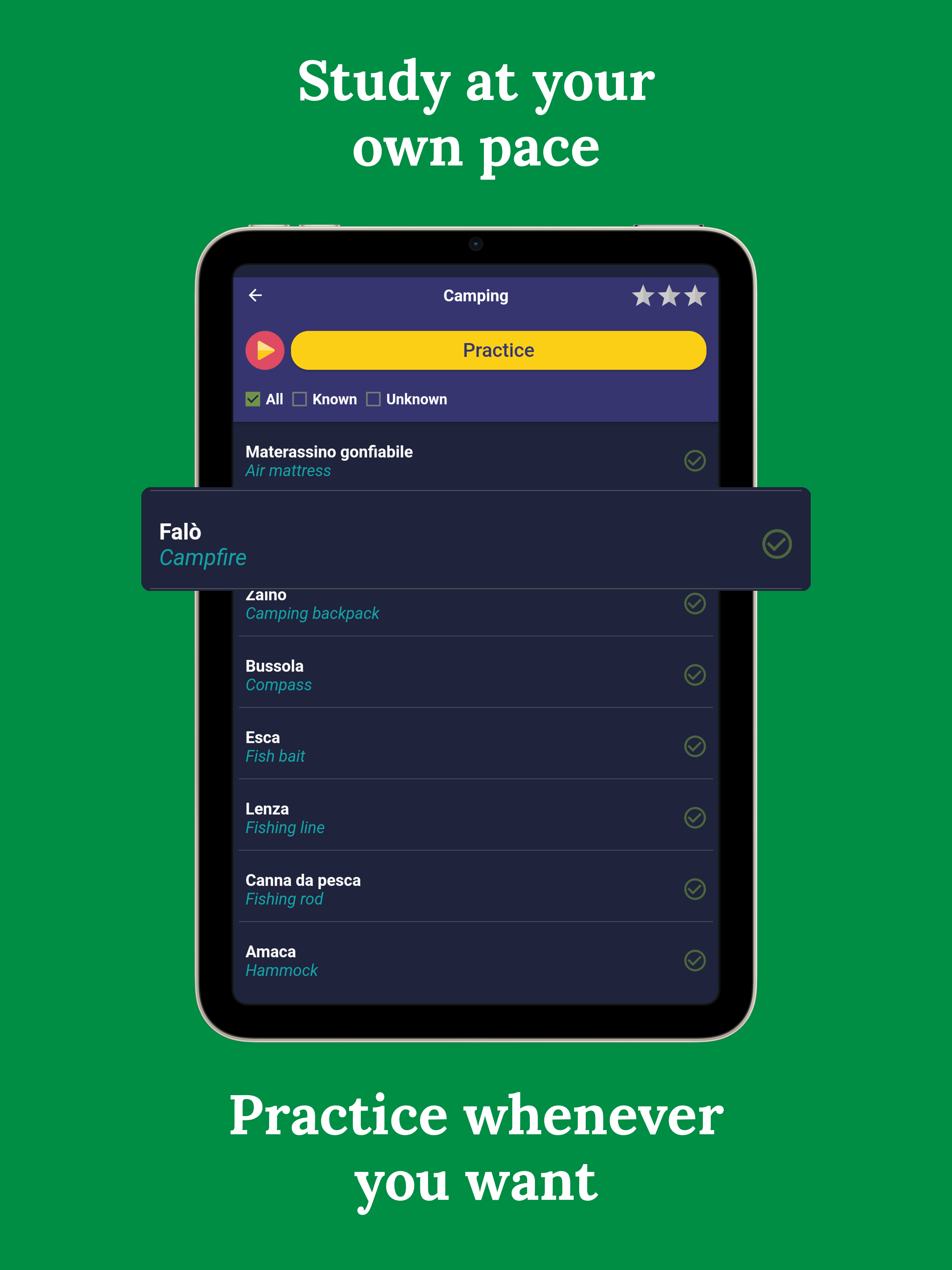 - Learn on your own! Study Italian independently, at your own pace, without needing teachers or tutors.