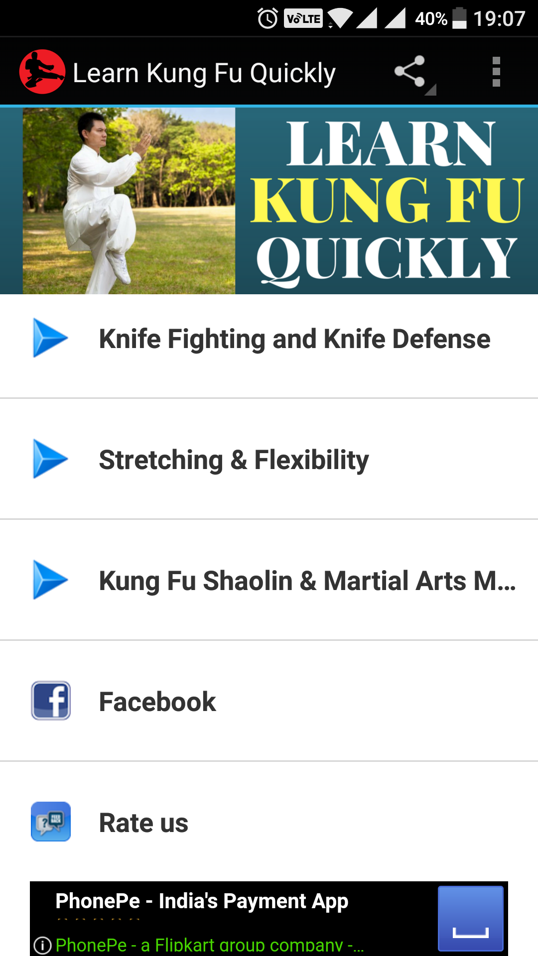Learn KungFu App is a software designed to help you Learn Kung Fu by yourself without any teacher or Shifu at anytime on your Phone or Tablet. Kungfu or gongfu (功夫, Pinyin: gōngfu) is a martial arts originating from China. However, the meaning of the word Kungfu actually has a much broader meaning, which is something that is obtained in a long time and with high perseverance. Thus, a great cooking expert can be said to have a high Kungfu. In addition to the word Kungfu, the terms Kundao or Kuntao are also often used to refer to martial arts from China. The Kungfu science that has spread to Southeast Asia (especially Indonesia) in the past is called Kuntao, according to Donn F. Draeger in his book Weapons and Fighting Arts of Indonesia. However, the term Kuntao is very rarely used in the present time. In learning kung fu, it takes discipline and high dedication. We are not only trained to move, but also appreciate each movement. Structural position or posture is an important point in learning kung fu. Movement and style on kungfu varies, starting from the position of the foot, the distribution of body weight, and alignment of the body. Everything is to be pursued in this martial arts learning. Shape and posture are not free, but regularly according to composition. With a good composition, then the movement will feel more supple. The form of posture in every movement must be done seriously and correctly. I studied some compositions in kung fu movements until I finally wondered. Is this composition designed from scratch? What do you want to pursue from this composition? Is motion composition aimed to achieve motion stability or movement compatibility? Here we have provided specifically for you who want to deepen kung fu, may be useful. Always been interested and inspired by Shaolin Kungfu but never had the time, access or means to learn it and about it? This app will give you all the basics and advanced information about kung fu. Learn the history and the spirituality about kung fu and practice it using this app! It can train you from the basic level to the Grand Master level in Kung Fu with an award winning step by step tutorials, Videos Training, Best KungFu Photo stances, Training Tips, Kung Fu News & Tournaments plus many more. We are also working hard to develop and add more sophisticated functions into this App, so please support us by doing the following: 1). Rate 5 stars @ Google Play Store and also tell your friends about this App. After this, you can keep this software free & forever. All names, logos, any resource and brands used in this are property of their respective owners.