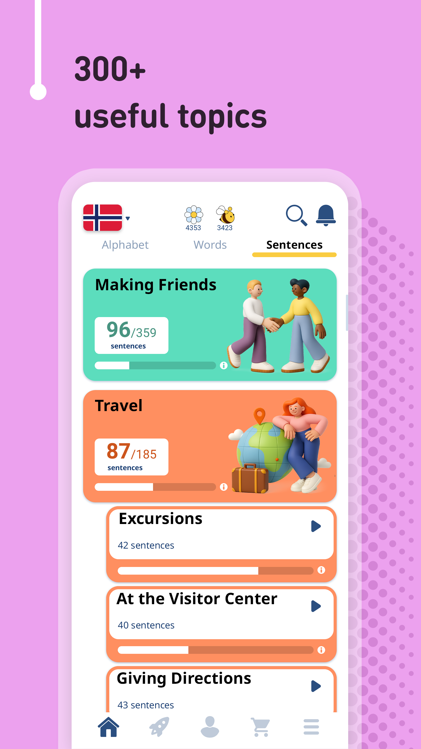 Learn Norwegian from 61 native languages, for free & offline, with FunEasyLearn. Learn to READ 📖 WRITE ✍ and SPEAK Norwegian 💬 Discover the fun & easy way to learn all the reading rules, all the words you’ll ever need and all the useful phrases in the Norwegian language. 🚀 Contents • 6,000 Norwegian words (constantly growing): the most common nouns, verbs, adjectives, etc., categorized into 7 levels and 200 topics; • 5,000 Norwegian phrases (frequently used): the most important phrases for daily conversations and travelling, categorized into 10 levels and 120 topics. Enhance your vocabulary by learning words, sentences and expressions for beginner, intermediate and advanced learners. 🔔 Why learn Norwegian with FunEasyLearn? FunEasyLearn reinvents language learning. Our team of linguists and teachers have developed a unique language learning strategy. The secret lies in combining an alphabet with all the reading rules, all the necessary words and a practical phrasebook into one app. This allows our users to read a word or phrase, pronounce it correctly, associate it with an illustration and practice it with listening, writing and speaking games. 🏆 Top features Hand-drawn illustrations – memorize the new vocabulary faster with intuitive illustrations; Professional audio recordings – listen to audios recorded by native speakers; Detailed statistics – analyze your results and track your progress; Review manager – review everything you learn; Smart search – find quickly the words and phrases you need; Hide what you know – hide the content you already know; Speech recognition – improve your pronunciation; Offline – use the app anywhere in the world, with no internet connection. 💼 Norwegian for business Get access to special Norwegian lessons created for your business. We provide specialized courses for taxi drivers, hotel & restaurant staffs, flight-attendants, shop-assistants, etc. ✈ Norwegian for travelling Learn how to book a hotel room, order a meal in a restaurant, ask for directions, carry out a conversation and speak confidently with the native speakers. 🙌 Norwegian for adults We adapt the contents depending on the age of the learner. Both you and your kid can learn Norwegian and have fun. FunEasyLearn Free Subscription Subscribe for FREE, with the flowers you earn while playing language learning games. Learn Norwegian, play for free! It’s fast & easy. 📴 📥 Download the FunEasyLearn Norwegian course right now! Recommend the app to your friends and get a reward. Rate us and write a review ⭐⭐⭐⭐⭐ It would mean a lot to our team! Contact us: https://www.FunEasyLearn.com/