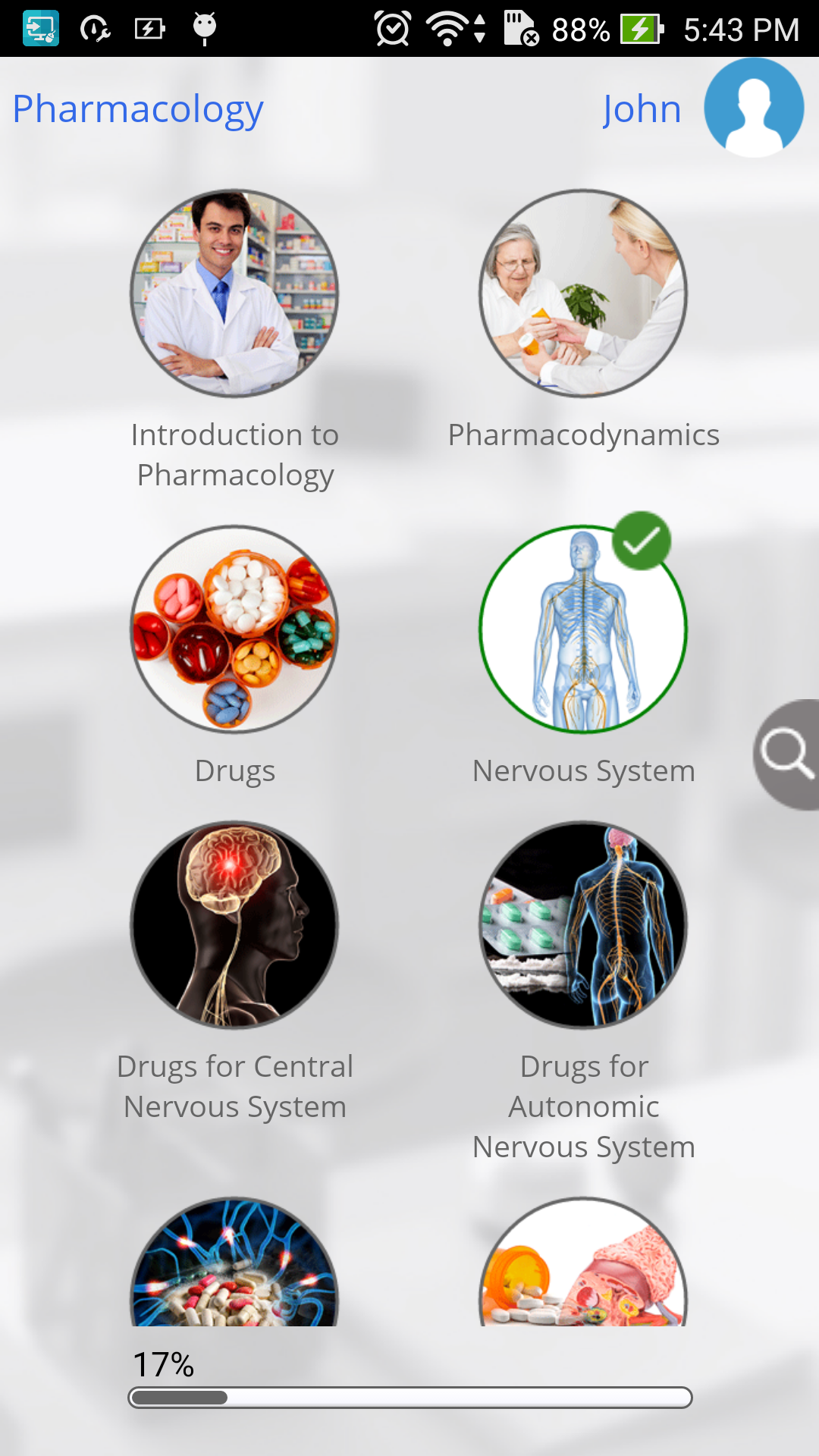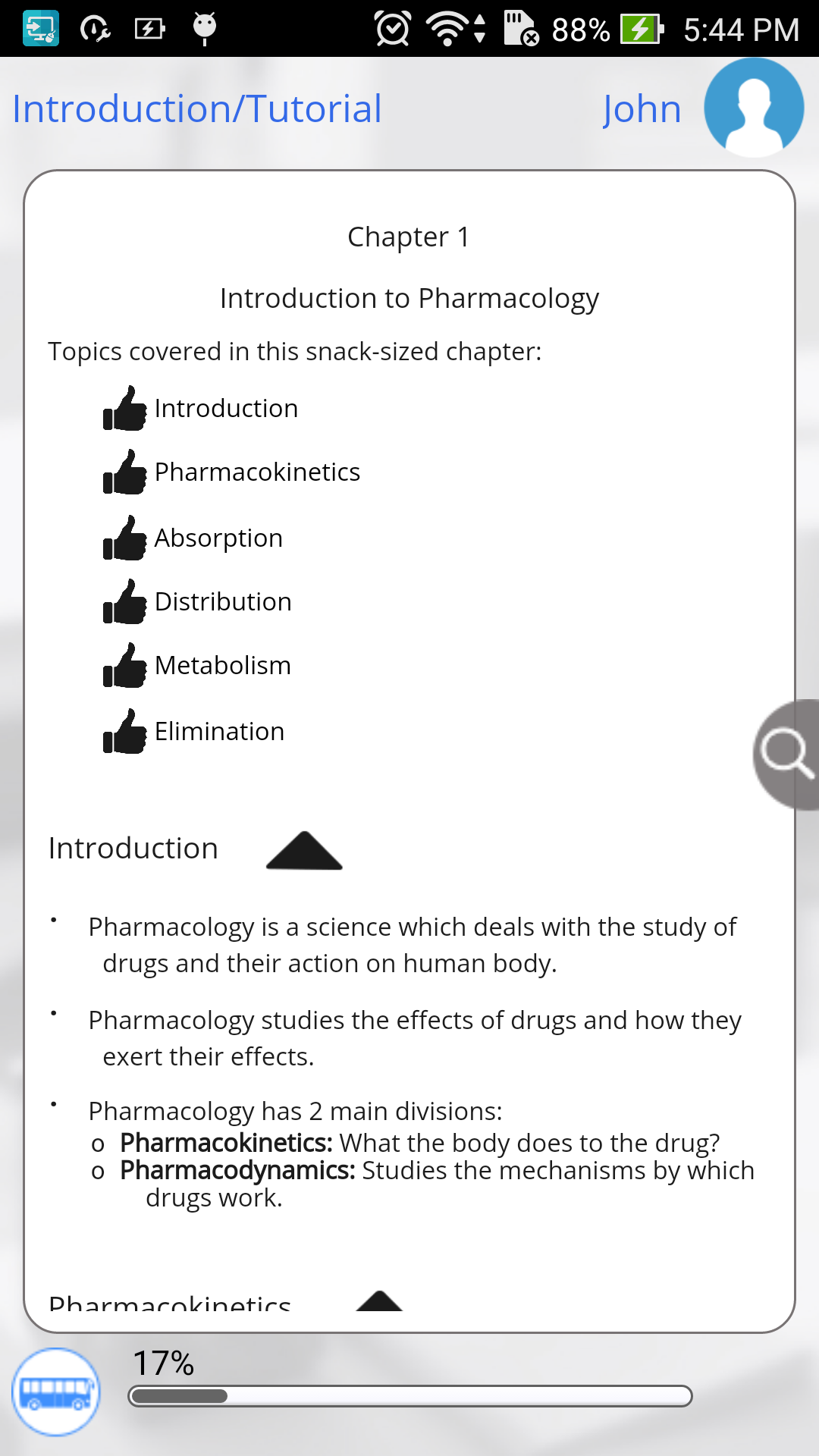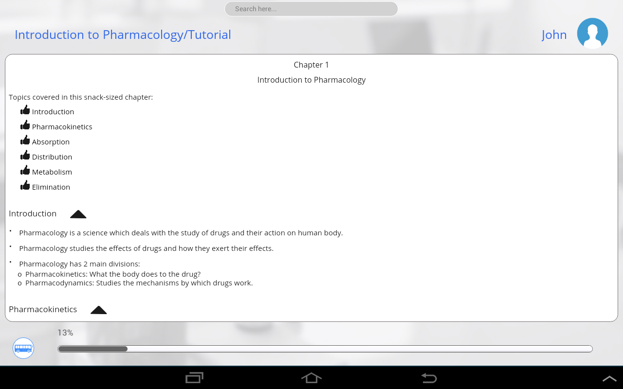 You have limited access to the content provided. For full access to the content, please login and purchase this application. This app provides a quick summary of essential concepts in Pharmacology by following snack sized chapters: