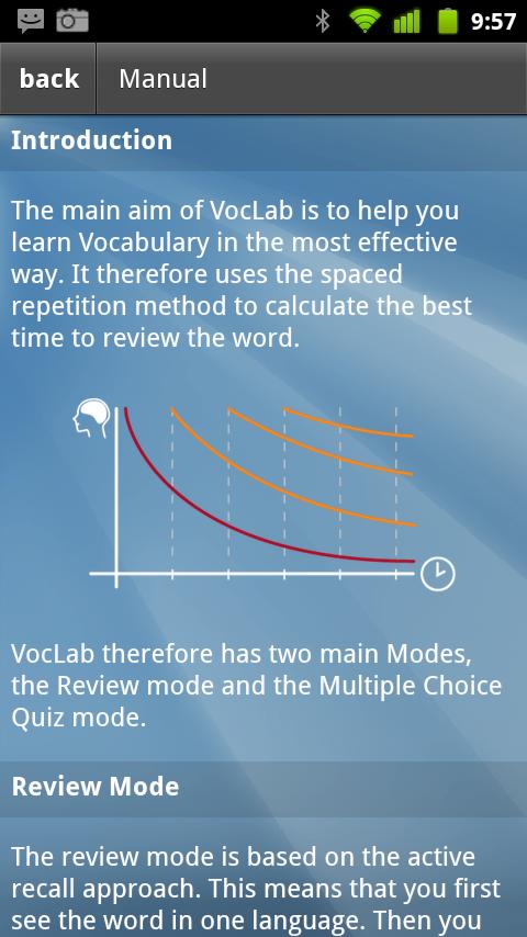 Voclab will gradually increase the difficulty of words to ensure that you gain first a solid foundation of basic words before learning more complex ones. This enables you to quickly gain a good understanding of the language.