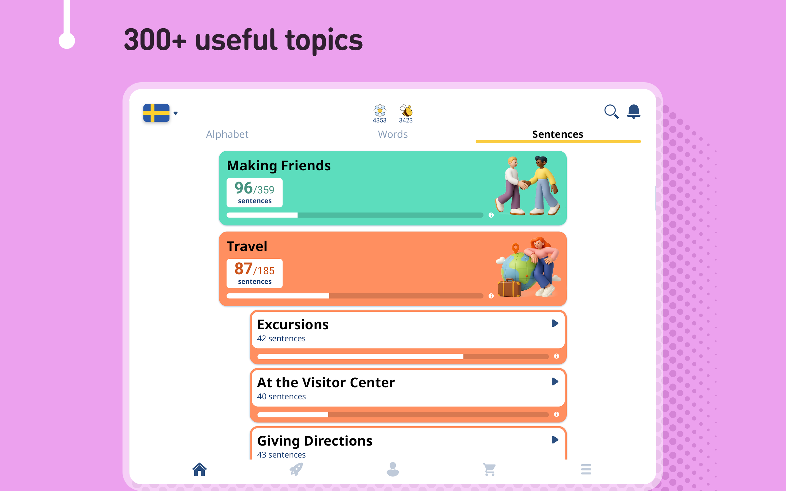 Learn Swedish from 61 native languages, for free & offline, with FunEasyLearn. Learn to READ 📖 WRITE ✍ and SPEAK Swedish 💬 Discover the fun & easy way to learn all the reading rules, all the words you’ll ever need and all the useful phrases in the Swedish language. 🚀 Contents • 6,000 Swedish words (constantly growing): the most common nouns, verbs, adjectives, etc., categorized into 7 levels and 200 topics; • 5,000 Swedish phrases (frequently used): the most important phrases for daily conversations and travelling, categorized into 10 levels and 120 topics. Enhance your vocabulary by learning words, sentences and expressions for beginner, intermediate and advanced learners. 🔔 Why learn Swedish with FunEasyLearn? FunEasyLearn reinvents language learning. Our team of linguists and teachers have developed a unique language learning strategy. The secret lies in combining an alphabet with all the reading rules, all the necessary words and a practical phrasebook into one app. This allows our users to read a word or phrase, pronounce it correctly, associate it with an illustration and practice it with listening, writing and speaking games. 🏆 Top features Hand-drawn illustrations – memorize the new vocabulary faster with intuitive illustrations; Professional audio recordings – listen to audios recorded by native speakers; Detailed statistics – analyze your results and track your progress; Review manager – review everything you learn; Smart search – find quickly the words and phrases you need; Hide what you know – hide the content you already know; Speech recognition – improve your pronunciation; Offline – use the app anywhere in the world, with no internet connection. 💼 Swedish for business Get access to special Swedish lessons created for your business. We provide specialized courses for taxi drivers, hotel & restaurant staffs, flight-attendants, shop-assistants, etc. ✈ Swedish for travelling Learn how to book a hotel room, order a meal in a restaurant, ask for directions, carry out a conversation and speak confidently with the native speakers. 🙌 Swedish for adults We adapt the contents depending on the age of the learner. Both you and your kid can learn Swedish and have fun. FunEasyLearn Free Subscription Subscribe for FREE, with the flowers you earn while playing language learning games. Learn Swedish, play for free! It’s fast & easy. 📴 📥 Download the FunEasyLearn Swedish course right now! Recommend the app to your friends and get a reward. Rate us and write a review ⭐⭐⭐⭐⭐ It would mean a lot to our team! Contact us: https://www.FunEasyLearn.com/