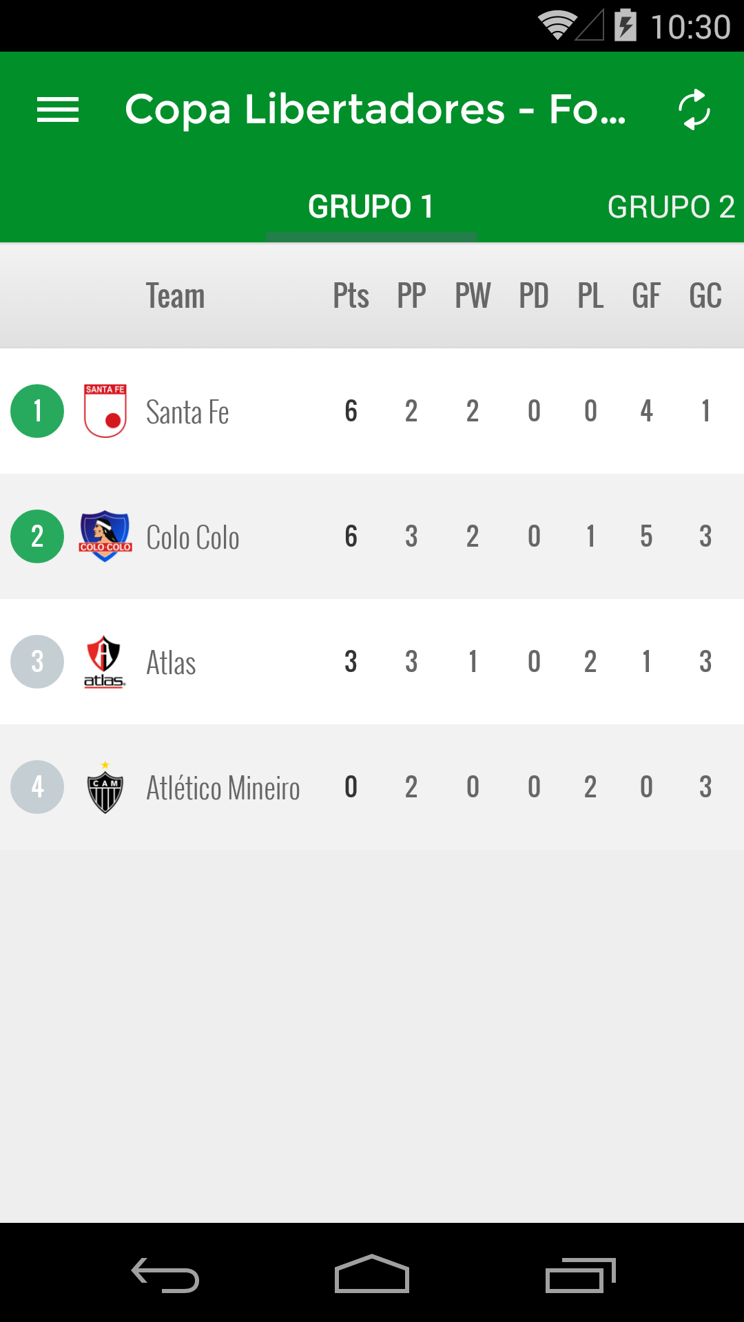 - Rankings of different groups of the Copa Libertadores updated date after date.