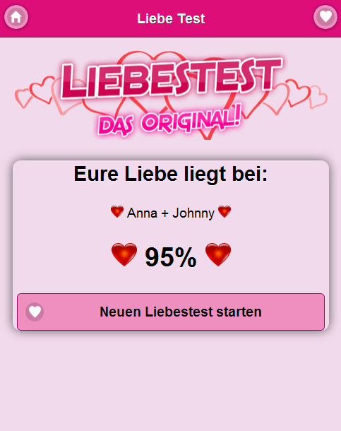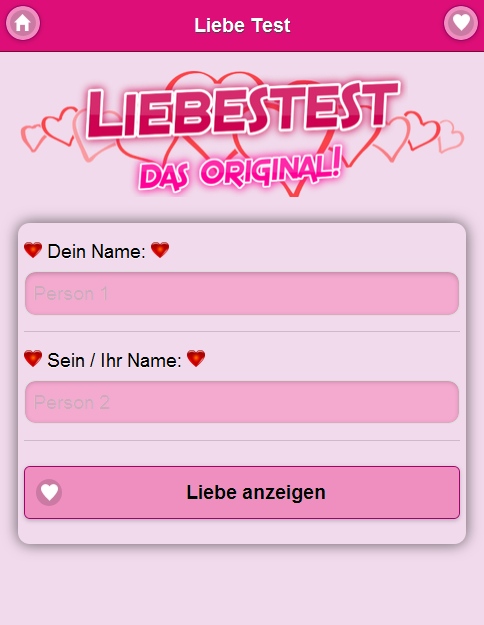 Die Liebe zwischen den 2 eingegebenen Personen wird mit den neusten und professionellsten Algorithmen analysiert! Gib einfach die beiden Personen, von denen du die Liebe analysieren willst ein und drücke auf "Liebe analysieren". Der Original Liebes Tester (Liebestest)!! Hole dir jetzt auch die offizielle PRO Version im Play-Store OHNE WERBUNG! Wenn Dir die App gefällt, bewerte diese bitte mit 5 Sternen und empfehle Sie weiter. Viel Spaß mit dem Original!