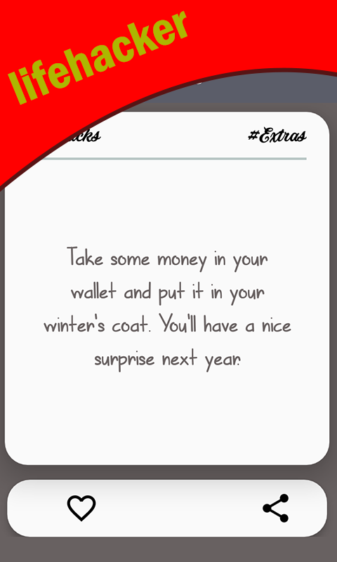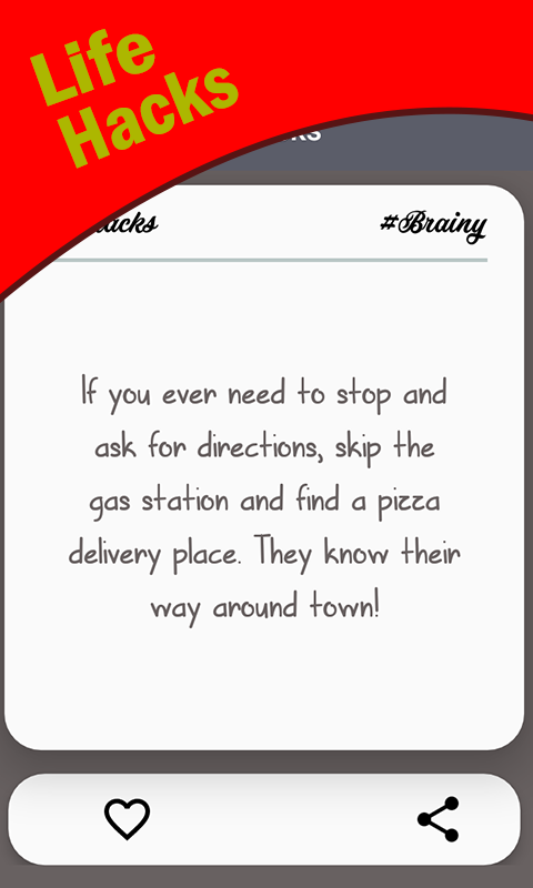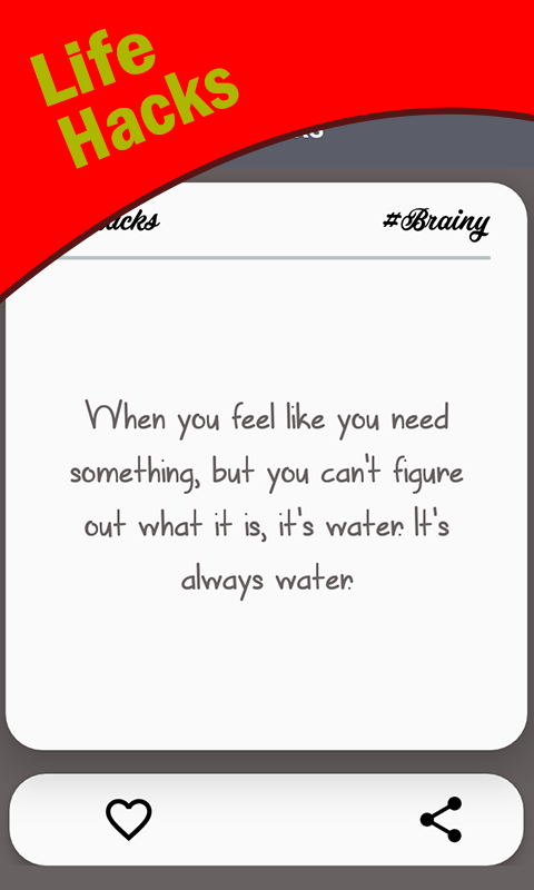 1000 ultimate life hack app or food hacks brings you the most advanced ideas to discover and share that you never know. Do you want to make your life interesting and want to get rid of frustration in everyday life there are 1000 Life hacks, tips and tricks to optimize your life. If you want to learn some quick and easy hacking that is easy to do, money saver, low cost and save your time? Then you are very lucky to have this daily life hacker app .This top android hacks will help you make your life easy and interesting. The easy life hacks in one small app will bring a smile to your face and reduce the frustration and make your boring jobs interesting and full of fun. It contains tips & tricks life advice and lifehacker that is very easy to do and is very helpful. The money saver, as well as the time saver, can be saved by giving a new look to the used things to impress your friends and family. Free stuff, cool apps, lifehacker, DIY projects, easy life hacks, food hacks, phone hacking and many other tips just in one small app that is free to download and easy to use in offline mode too. We will help you to become a life hacker for hacking things by providing you with some of the best daily life hacker that will help you to make your life easy and interesting. Food hacks, party hacks, kitchen life advice, life hacker, daily lifehack, phone hacking, health and fitness and many other easy life hacks tips for the comfort of you people in the just single app. The top android hacks contain life tips and tricks that are easy to share with friends and save them to favorites. It refers to anything, trick, skill or a shortcut method to increase the productivity and efficiency in all ways. You will find a lot of ways to make your life creative by life hack app. Your life will become easier and fascinating than ever as we are intelligently finding tips and daily life hacks that we think you will definitely like them or need them in your daily life. Lifehack is very easy to navigate and the ideas can easily be shared with your friends. We are living in the world with a large number of hidden easy lifehacks - lifehacker facilities which we do not even think of. If we start noticing and we learn to distinguish them and use them in a creative way, our life will become more effective. FEATURES: ** 1000+ lifehacks even available offline. ** Tips & Tricks to make things easy and useful without wasting money. ** Share lifehack to friends and family easily. ** Mark as a favorite and can be accessed easily in offline mode. ** Various categories of easy lifehacks such as food hacks, kitchen life advice, technology, life tips, household hack, phone hacking and health and tips etc. ** Super simple to use the life hack app and is money saver. ** Light in size and free hacks app. ** Life tips & tricks are constantly updated. ** Top android hacks and very easy to use designs. ** Life hack app for kids. Lifehacks is essentially creative ideas to solve small problems by giving the simple, creative and less expensive ways. It provides the best life advice tips & tricks for the users to save their money as well as time. The easy lifehacker app for kids, girls, parents, and all other people for all situations to make your life easier. Daily lifehacks is a series of workshops and events that are designed to guide people to work in a creative way. The best money saver app to save your money and time. Download the app for free to enjoy the easy tips and tricks for utilizing the things in different ways.