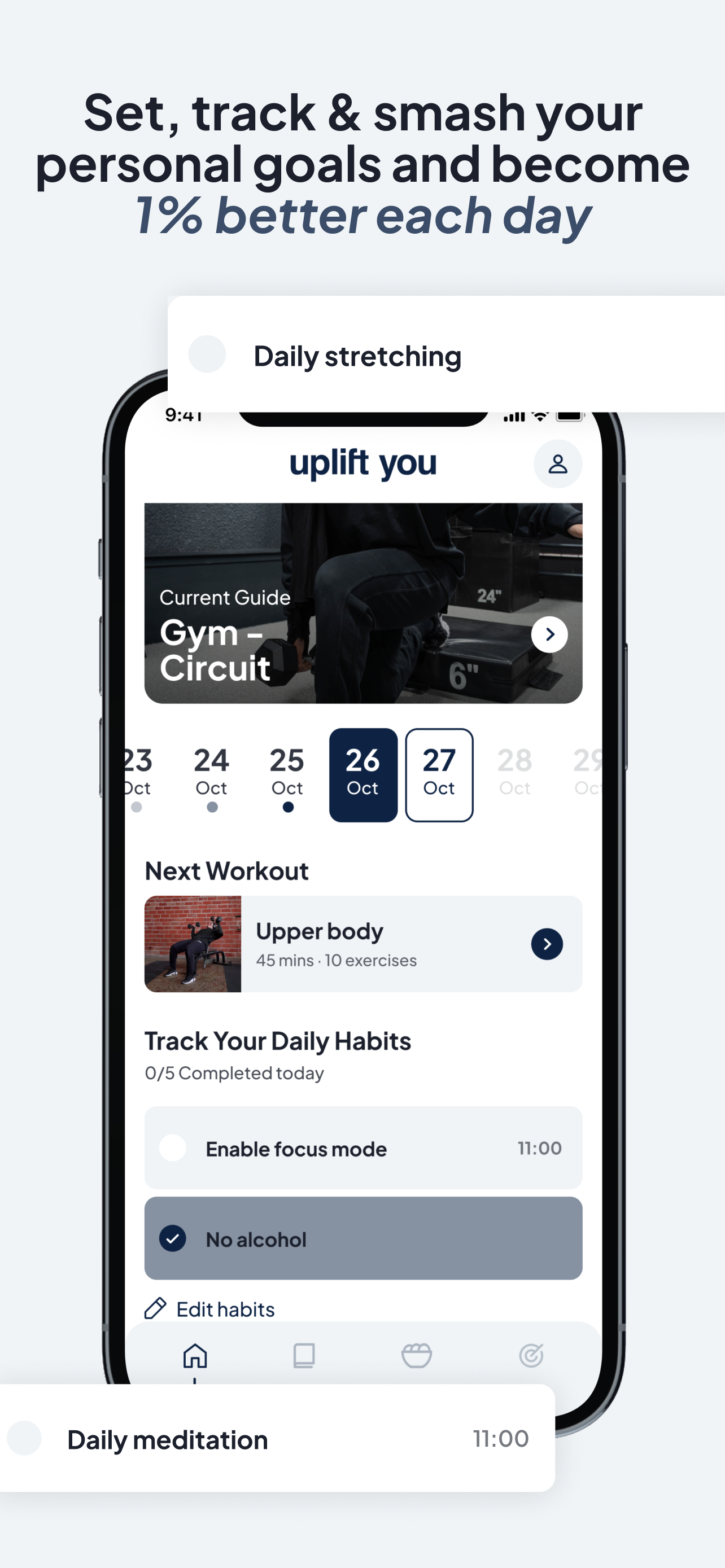 Uplift You is my new empowerment and personal growth platform designed to help you become the best version of yourself by helping you improve 1% every day. I know you want to become 1% better every day. It’s what led you here. But you probably also know that the journey of self-improvement is a hard one. There are setbacks, obstacles and more often than not you feel like you’re going it alone. The Uplift You App is there to remind you that you’re not alone. I can speak from the heart when I say that when you focus on surrounding yourself with good people, and good teachings and focus on the things you can control (YOU) that life presents itself with all the opportunities you deserve. So to give you all that perfect collection of guidance, knowledge and support you need to reach your potential - I created Uplift You, a platform designed to… Elevate every aspect of your life Uplift You is a platform to help y’all become: aware of your potential, confidence, and re-centre your focus on the one thing you can control - you. Our tools, resources, and community are there to help y’all pick yourself up when it’s not your day, week, or month and keep you consistent on your journey of growth. Uplift your health and reach your highest fitness goals Accountability is the hardest obstacle to face in your fitness journey. Digging deep and finding the resilience within you to keep going is what will give you results over the long run. Uplift You allows you to track your habits so you can start to build consistency and the discipline to become the best version of yourself. The app also provides the community, tools, and guidance with structured weekly training guides for all goals, custom workout plans, 100’s of easy-to-make meal plans, and access to our family on the same mission to improve as you. Set, track, and achieve your personal goals It’s only when we fall in love with the journey, not the outcome, that we create habits that last a lifetime. Set personal goals you want to track and record your daily streaks by logging your progress. You’ll have your own dashboard to see how you’re progressing with your goals and share your updates within the Uplift You Community When it comes to your goals - it's you vs you, but with a family and support system by your side, you can more easily commit yourself to becoming 1% better every day. So what do you say… Ready to join the family? —---------------------------------------------------------—------------------------------------------------ Uplift You is free to download and offers the following subscription options: 1 Month = $9.99 3 Months = $24.99 12 Months = $89.99 Your subscription will work across your devices and renew automatically unless cancelled at least 24 hours prior to the end of the subscription period. Subscriptions can be managed and auto-renewal turned off in the account setting within iTunes after purchase. Once purchased, no refunds will be provided for any unused portion of the term. By purchasing a subscription you agree to our full terms and conditions & Acceptable use policy that can be found here: upliftyou.com/terms-conditions upliftyou.com/privacy-policy upliftyou.com/acceptable-use-policy