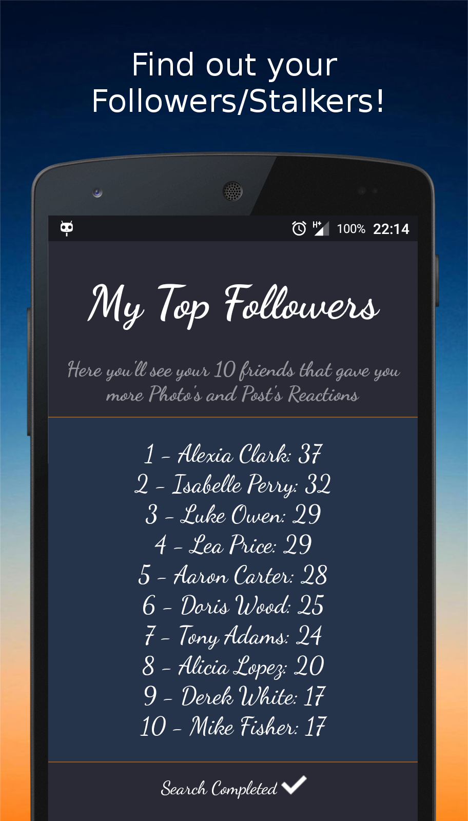 MY TOP FOLLOWERS / STALKERS: Have you ever wondered what's the person that liked you the most? Now you can find out! You'll discover your 25 friends/stalkers that gave you more Like in your Facebook Photo's and Post's.
