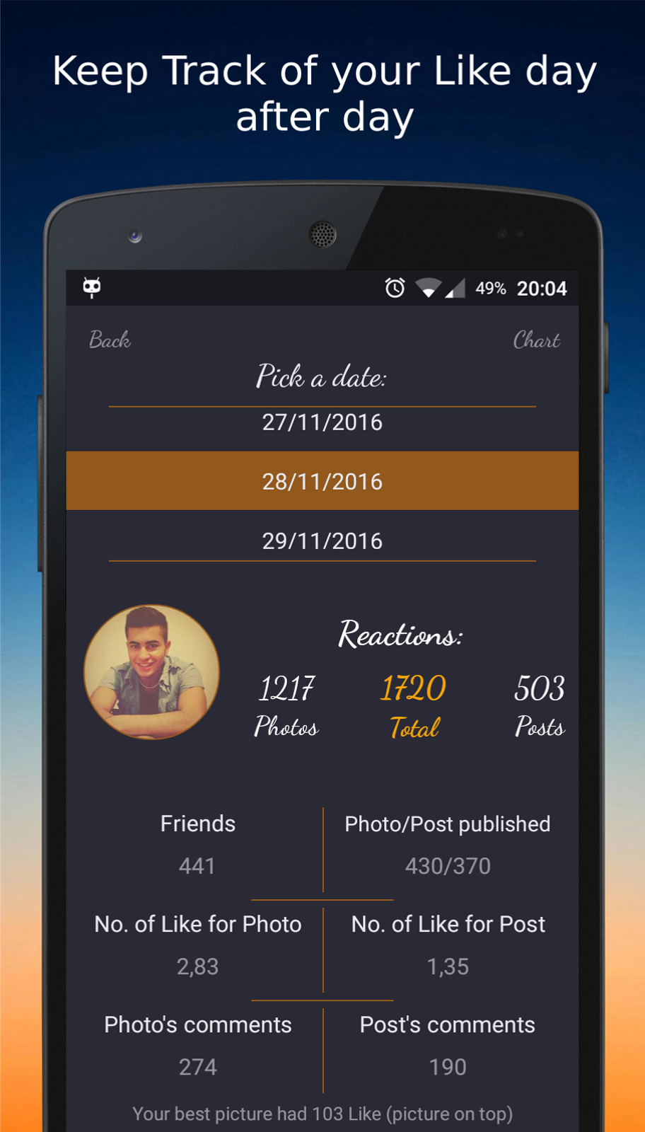 STATISTICS & CHART: Have a better understanding of your Like through Chart and useful Stats like: Average Like for Photo, the number of Photo published, Comments received and many others...