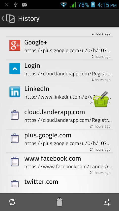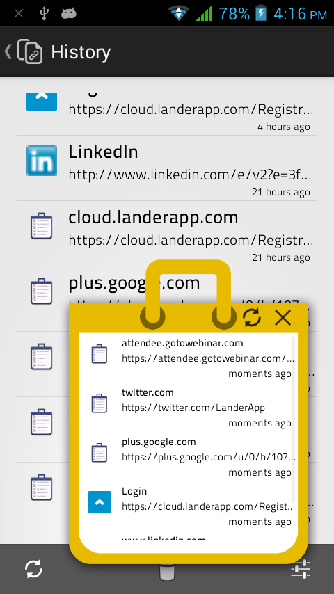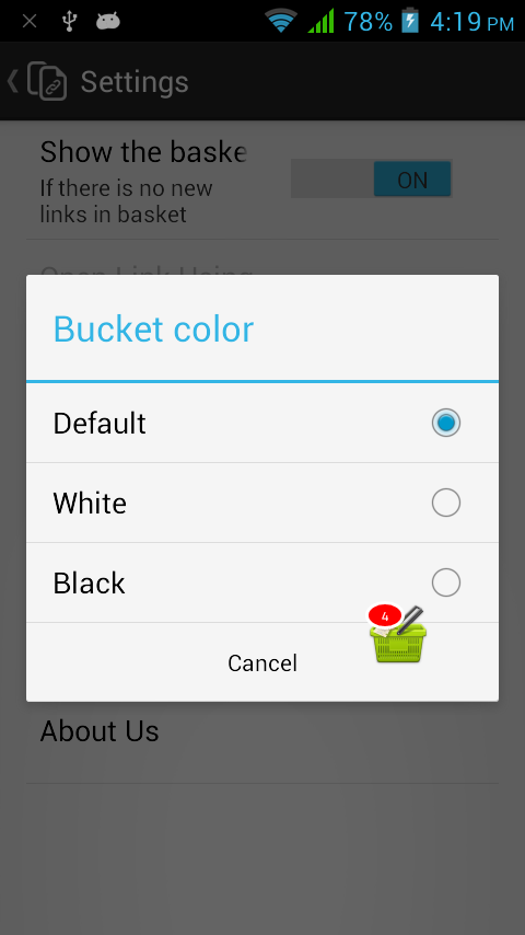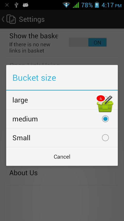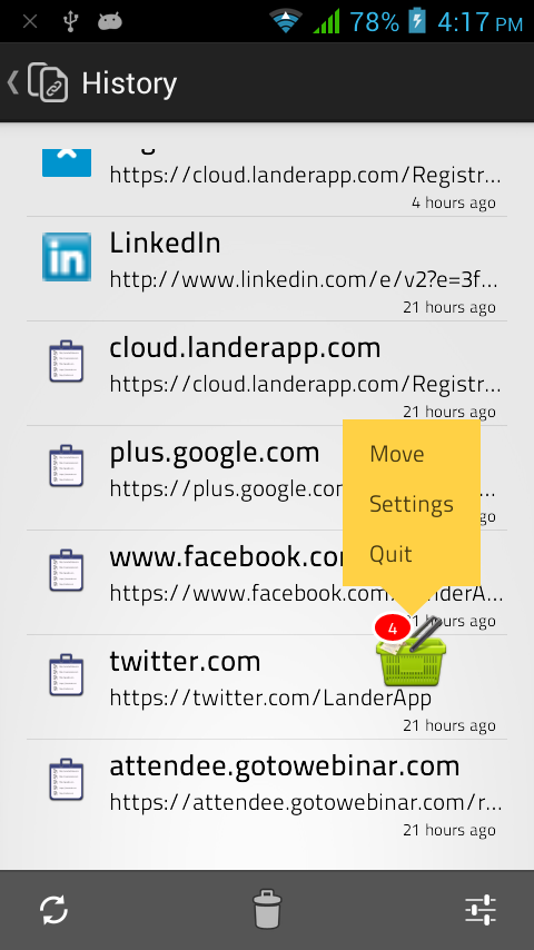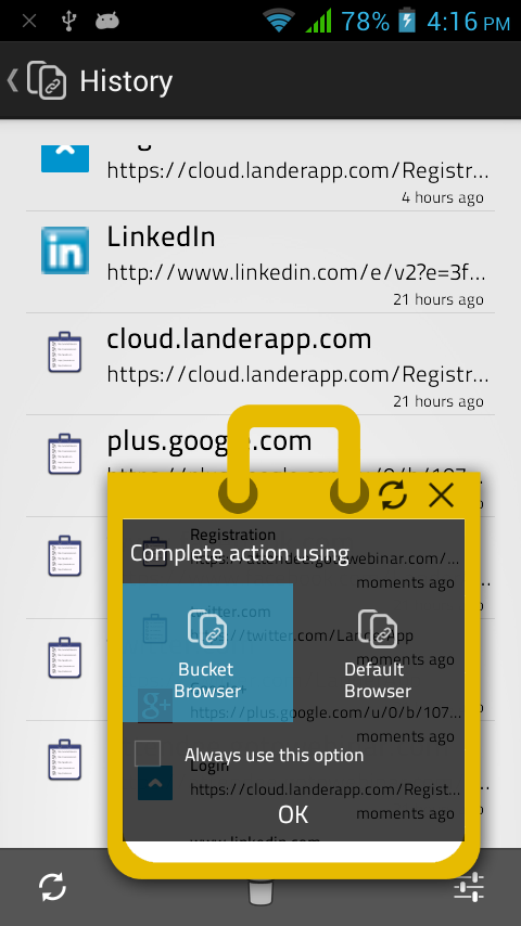 - While opening any link, just select Link Bucket to open the link and your link will be saved for later use - You don't have to open any application, just add links from any application and check them later - Use inbuilt full featured browser or check link on your default browser later on - Bucket will be shown on screen when there are unread links - Many options like : changing bucket size, color, show/hide options - Long press on bucket will allow you re-position it or quit the app - Works well on phones and tablets, on any orientation History : - All links ever added to link bucket - You can share links, open in inbuilt or other browsers - Copy links - Erase individual entry or all items Privacy : - We don't collect data of your usage, not even for statistics - Everything you do with your app or store any link in the bucket stays on your device, its never sent to our or any other server