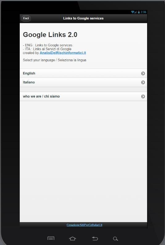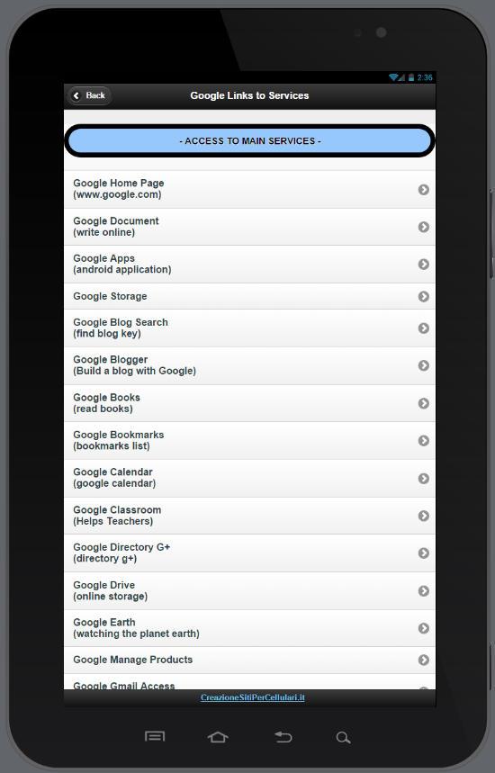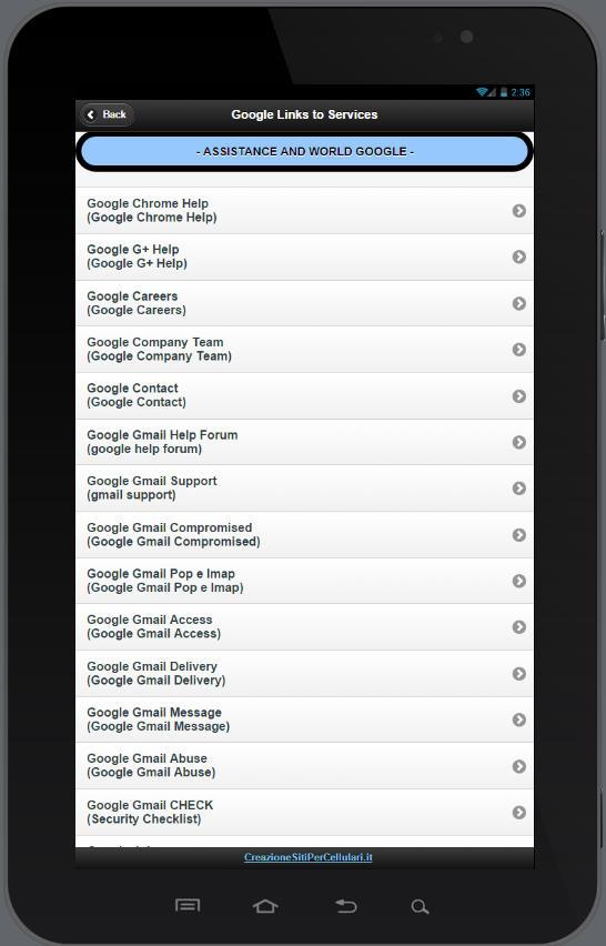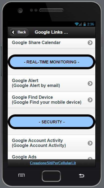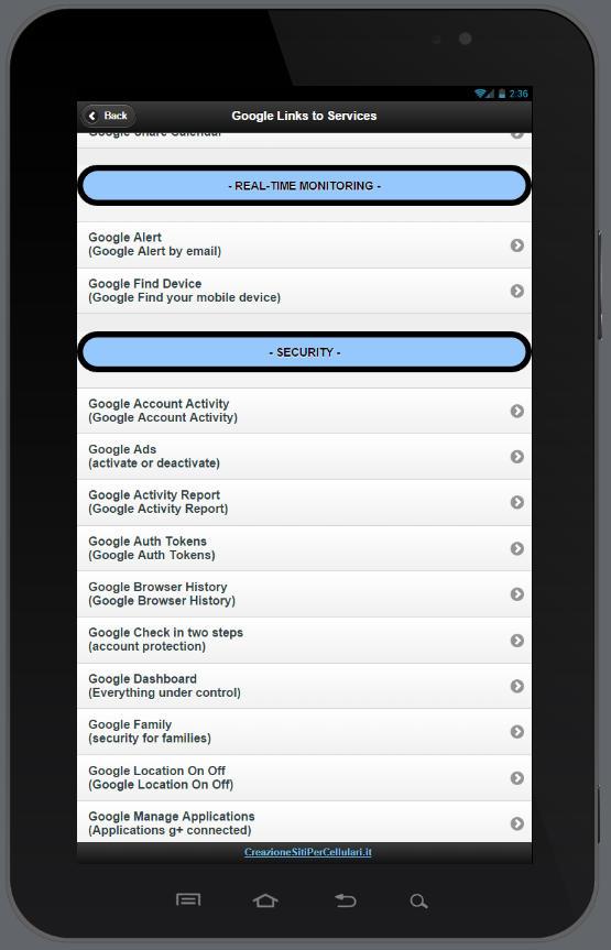 New link for google services ( 06/10/2014 ) Versione 1.8 Google Services Google Dashboard Google Data Tools Google Contact Manager Google Domini Google Gestione Prodotti Google Moving Product data Google Gmail Problemi di consegna Google Gmail Problemi di accesso Google Gmail Security Checklist Google Safety Tools Google Advanced Search Google Share Calendar Google Security & Privacy