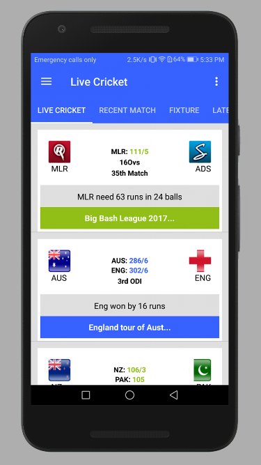 Live Cricket HD is an app that provides you live score, live game , cricket streaming and other opinions.Live Cricket The app keeps you updated with cricket matches and provides complete news coverage of ODI , Tests and T20 matches. Live text scores, opinions and milestones of cricket matches are also available. HD is an app that provides you live cricket score , live play and opinions. we are active all time for any update for any cricket match. Live Cricket HD provide All matches schedule updated daily basis. Watch all cricket matches schedule with live cricket streaming and tv channels where you can watch free live cricket. Watch Cricket Online. Australia vs England live streaming Ashes Series, India vs South Africa, Pakistan vs New Zealand vs West Indies. PSL live streaming. Test, ODI and T20 match live streaming available . IPL 2018, Big Bash League BBL T20, Bangladesh Premier League BPL T20, Ram Slam T20, Pakistan Super League PSL T20, T20 World Cup, India, pakistan, england, australia, west indies, sri lanka, bangladesh, south africa, new zealand teams matches. This app isn't affiliated with any cricket organization or Star Sports if you think any content need remove from this app you can contact us we will remove around 24 hours. Thanks