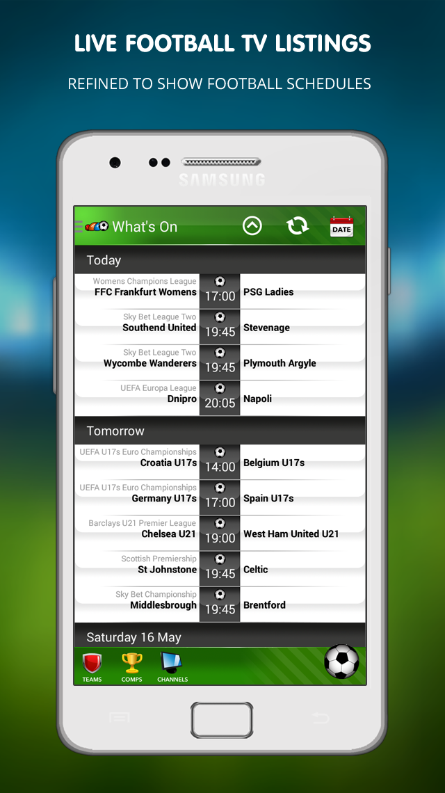 For all of you mad Armchair Football fans, our Android App gives you access to daily Live Football on TV Schedules from all of the main broadcasters in the UK including Sky Sports, BT Sport, BBC, ITV, BT Sport // ESPN, Eurosport, Premier Sports, Channel 5 and all other major UK TV Channels.