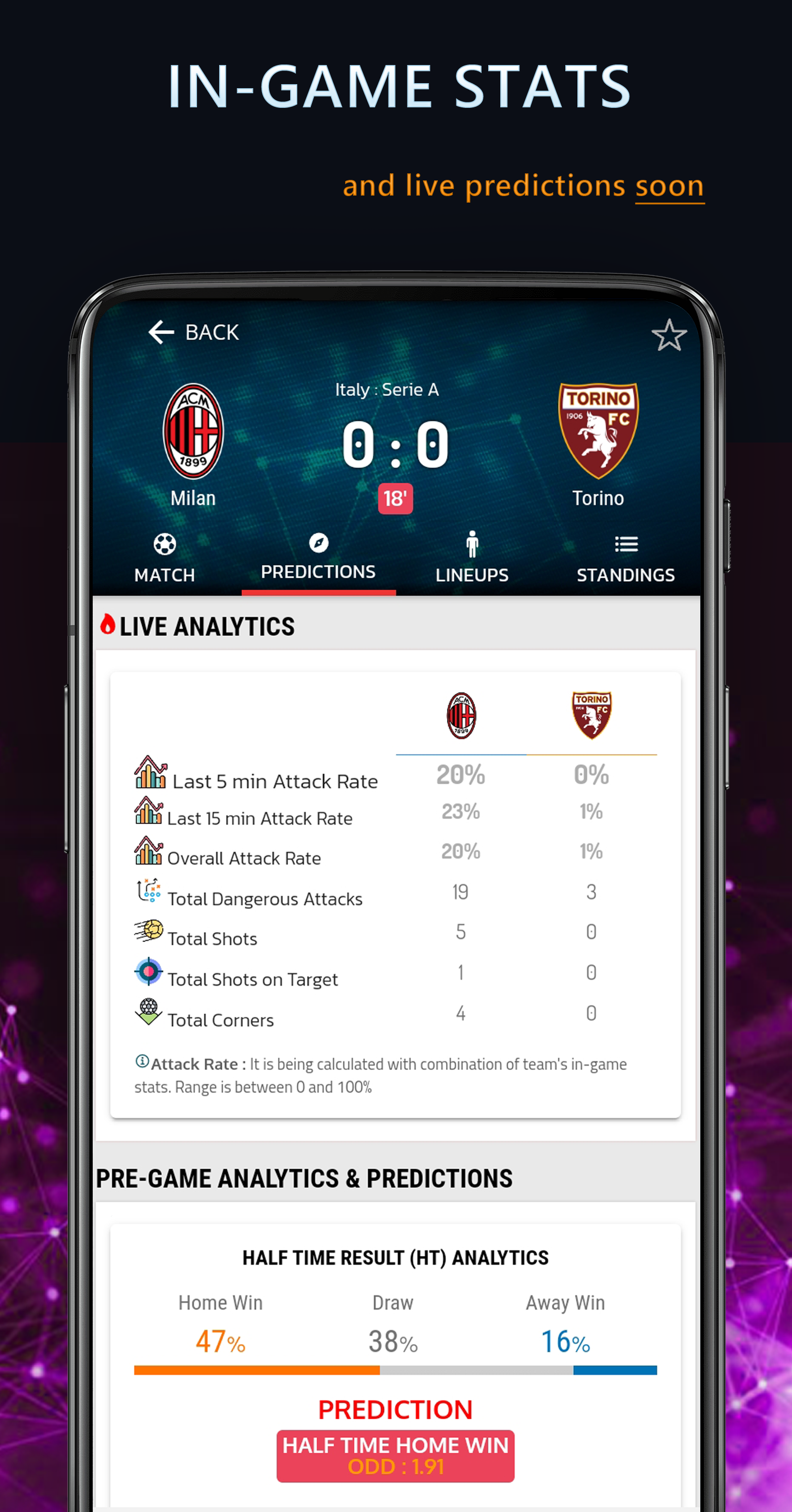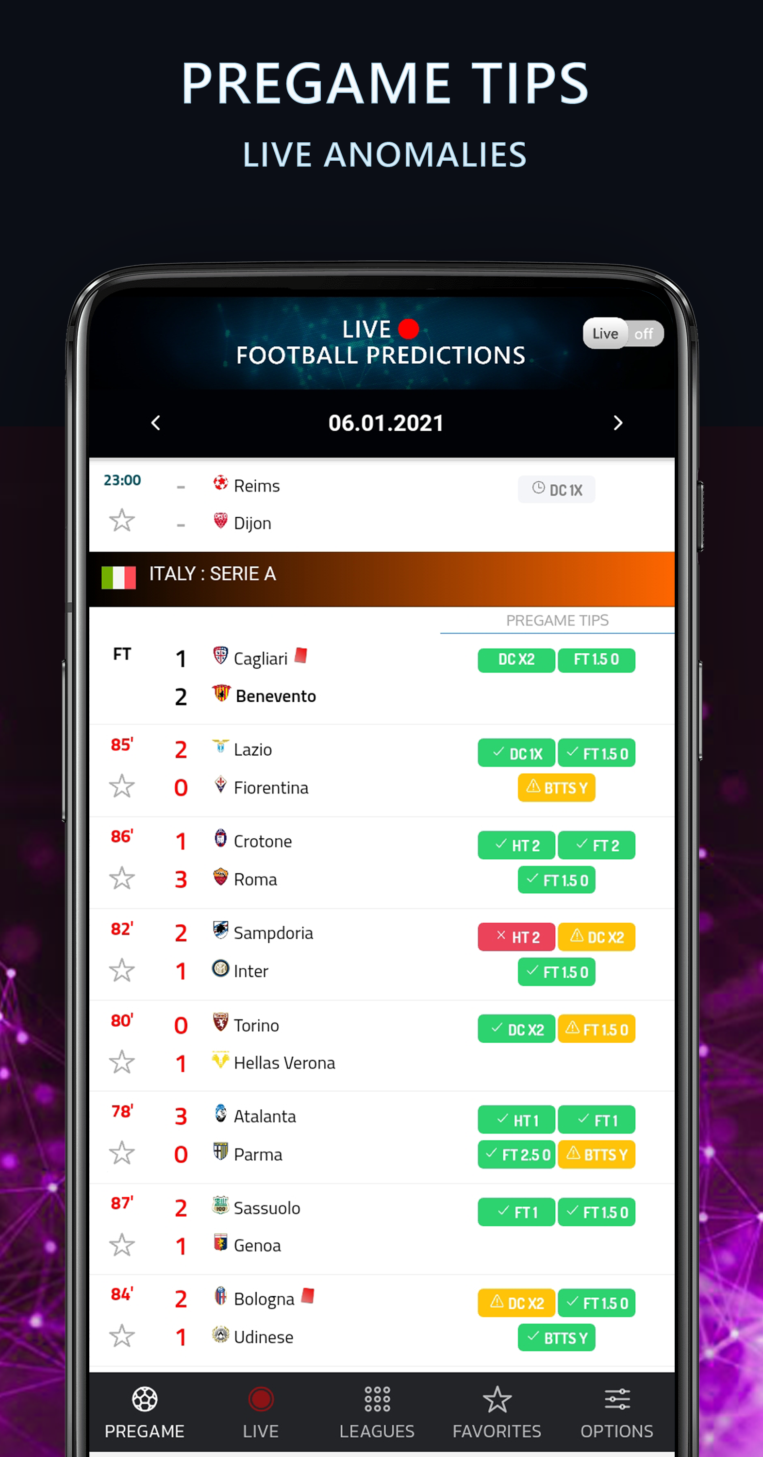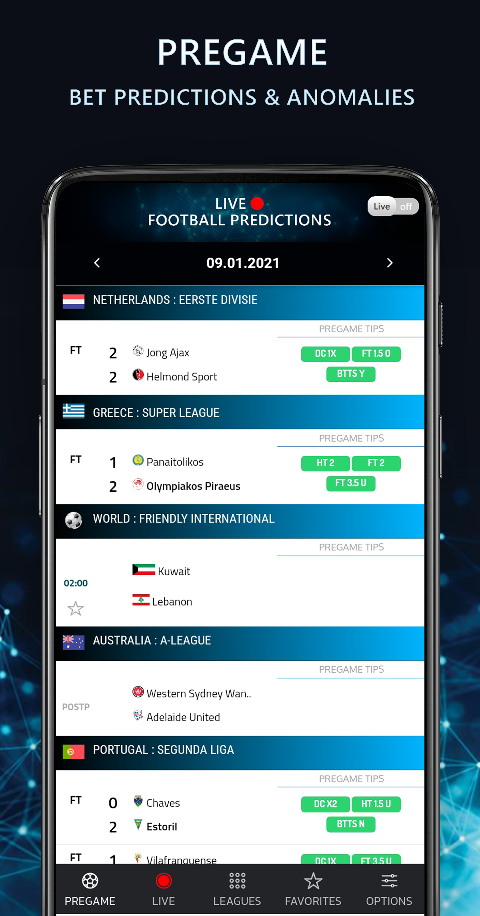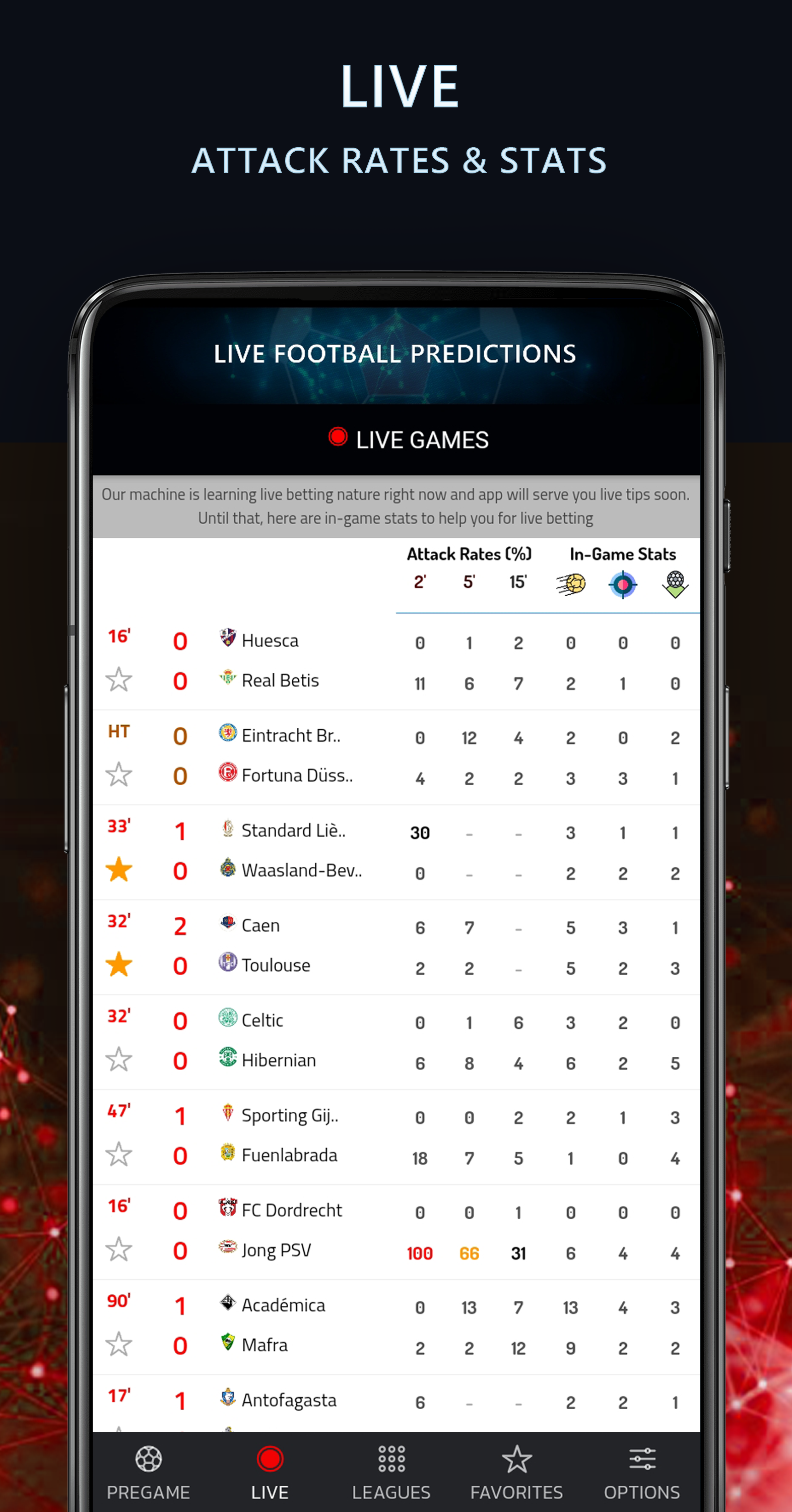 Live Football Bet Predictions App featured with Artificial Intelligence Algorithm for Bet Prediction, Winning Tips that is Capable of covering the large base of Football Fans across the world We offer Hundreds of Free Bet Predictions weekly with High Accuracies. Hundreds of football leagues are constantly monitored to revive the results, home/away performance to serve accurate statistics for multiple matches. With the best Bet Prediction advices you can covert your interest into real money ⏳ PREGAME FOOTBALL BET PREDICTIONS With associate AI-based bet predictor engine, our live football dissipated tips application provides daily bet predictions in tens of football leagues. ✔ Pregame bet predictions are going to be offered four days before the competition ✔ Football live game is being vie, a pregame bet comparison and bet anomaly checker is employed ✔ Pregame football live tips bet anomaly notifications for every new dissipated opportunity ✔ Best Predictions for regular, half-time, over/under, and each groups to attain 🔴 LIVE FOOTBALL STATS AND BET ADVISES Unlike many bet prediction apps, our application crawls, gather factual past data and evolving with live football tips information/offers/advises. Our football live app provides you some best functions : ✔ Live football betting tips, cards and in-game team stats by analytics ✔ Live goal Score predictor with combined attack rates of football teams to punters as a fortune ✔ Live stats of corners, shots and shot heading of Football Teams ✔ High Accuracy betting tips for Match result ✔ Over/Under , 3Way Handicap , Over/Under 1st Half , HT/FT Double , Draw No Bet , 1st Half Result , Total Home / Away , Accurate Score ✔ Live Odds to help you with better define betting Strategy ⚽ FOOTBALL MATCH DETAILS Live and finished football match events, predictions and team attack momentums. Details are here for a football game : ✔ Football match events as cards, substitutions and goals ✔ Pregame bet prediction stats with combined league and team stats ✔ Live attack rates with combined statistics of every bet punters desire to have ✔ Detailed stats as half time result, full time result and goal probability of team ✔ Team lineups, league standings 📈 FOOTBALL LEAGUES Check football leagues here in best football prediction app and acquire the best football stats of tens of football leagues ✔ League fixtures, results and stats ✔ League standings as overall, home and away stats ✔ Detailed league stats as half time result, full time result, and goals over/under ⏰ OTHER OPTIONS ✔ Chance to settle on your favorite leagues ✔ Chance to follow the results live due to a live score service ✔ Chance to access the most effective odds for every event ✔ Chance to spot similar matches in terms of odds ✔ Chance of receiving push notifications once our advised bets are revealed, once a consultant you follow posts a bet or once the bet you placed is winning We are here to give you best bet predictions in all over the world and now they are all free. It serves more than 300 free betting tips in a week for punters. With our bet advices and your wisely previous betting experiences you can make real money. ⚠ But please be careful! Machine doesn't have human emotions. Add your emotions to these predictions and place you bet wisely. ⛔ Disclaimer: Please don't forget, these free football bet predictions depends on machine statistics.
