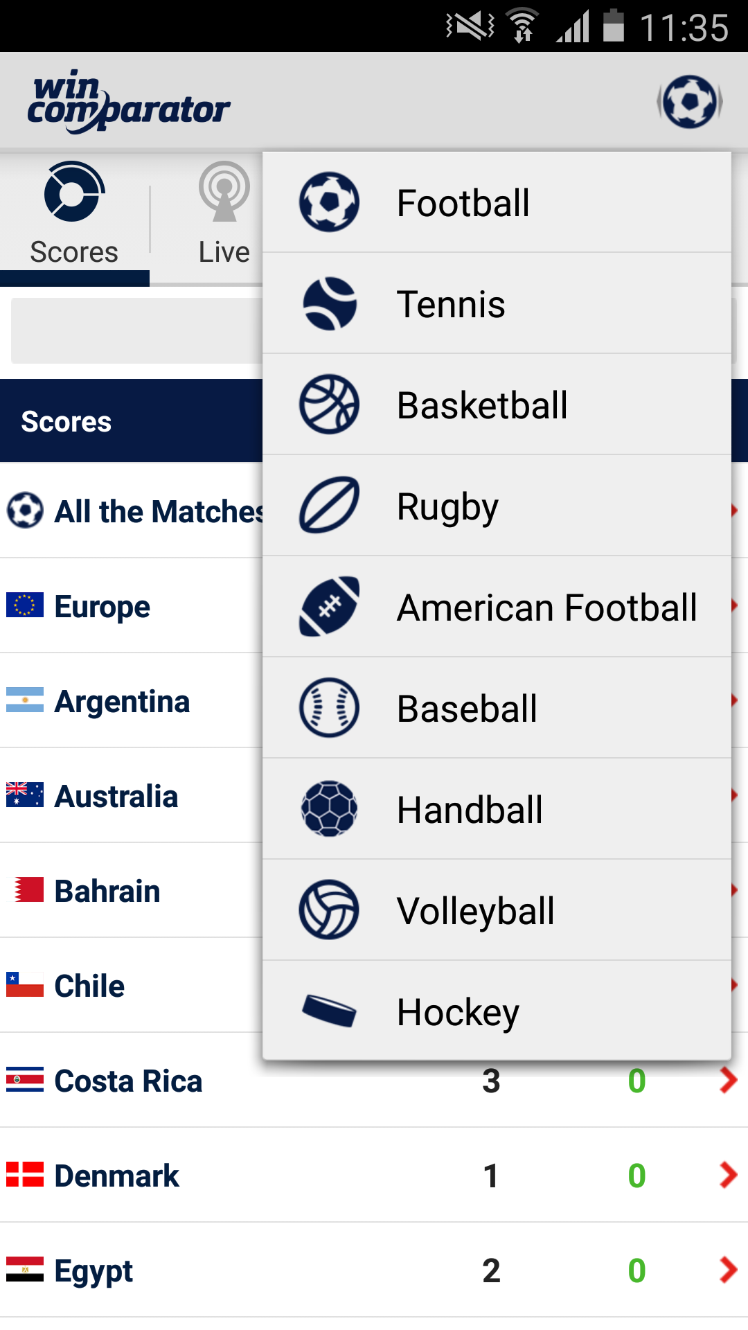 ★★★★★ The best sports app to follow LIVE SCORES and see goal VIDEOs ★★★★★ 9 SPORTS LIVE ✓ Live Football with over 1,000 championships ✓ Live Tennis scores for tournaments worldwide ✓ Live Score Soccer, Basketball, Rugby, American football, Handball, Volleyball, Hockey, Baseball NEVER MISS A SCORE Be in the heart of the action at any given moment! Our livescore app gives you immediate access to the following services: ✓ LIVE SCORE ✓ LIVE COMMENTARY especially on real-time football matches ✓ ALERTS on goals, bookings, live results ✓ FOOTBALL goal videos ✓ CHAMPIONSHIP tables and standings ✓ MATCH Schedule Watch goals of your favorite teams at any given moment! Be alerted of goals scores immediately! Here you have football/sports at your fingertips! Our live score service allows you to follow live football matches in over 1000 leagues. Enjoy up-to-the minute scores on ALL sporting events with our quality service. PREPARE YOUR TIPS AND FOLLOW ON YOUR MOBILE ✓ Stats updated in real time for all sports ✓ Stats on Soccer, Football, Tennis, Baseball, Hockey plus 4 other sports ✓ Live In-Play odds ✓ Comparing odds ✓ Results and sports tips CUSTOMIZE YOUR APP EASILY Make this app your own with our friendly personalization settings: - Set the type of alerts you want to receive when you follow a live match (goals, kick-offs, half-time score, final result, live coverage, cards) - Select your favorite teams and never miss a match offered with our Live Score service - Select your favorite sports every time you open the app - Set how often the information is updated Other advantages of the app include: - Find the current day fixtures live - See the list of all the live football games (or any other sport on our livescore) - View all the videos of the latest goals scored - See the soccer, football, tennis, basketball, baseball, hockey league tables.... - Easily access all your favorite games - Browse by date to find past results or timing of future matches - Soccer, Volley, BasketBall, Rugby, American Football, Hockey, Baseball, Tennis live To experience the best live sports app, download the Wincomparator app now and discover the best free football livescore, soccer, baseball plus 6 other sports offered in real-time!!
