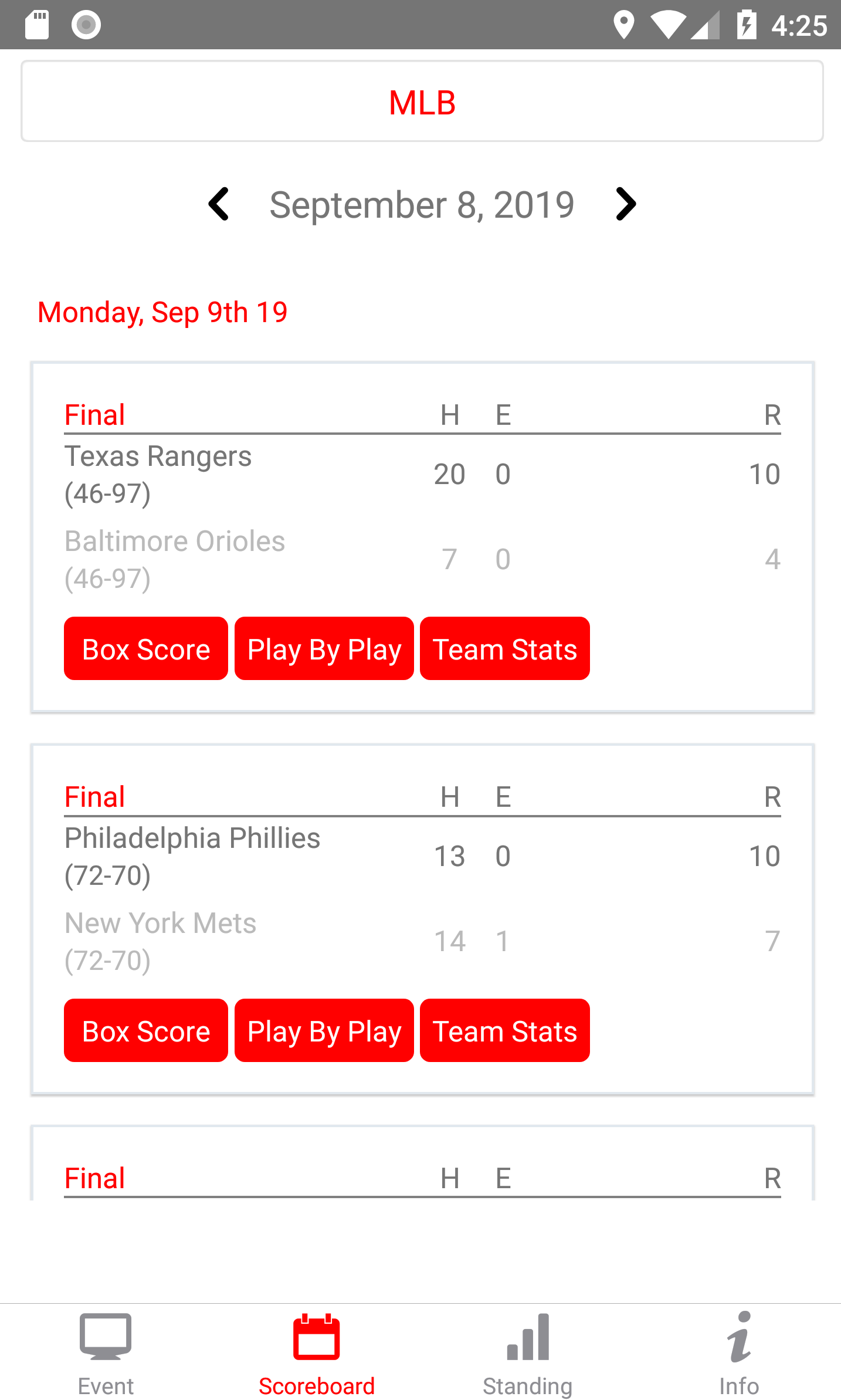 "MLB Live Streaming" This is the best application for MLB fan, Baseball fan and DofuStream fan: Watch free all game and more of all ongoing games for MLB - Baseball - The application helps you see the live score, scoreboard, standing, ranking, Play By Play, Box Score, Team Stats on mobile devices anywhere, anytime. - MLB season stats for teams & players, including league leaders in pitching, hitting, & fielding. - What's that channel? TV listings & radio stations for all games included. - Customize the schedule the way you want: filter by teams, division, or conference. - Updated results directly matches are taking place. - Never miss a game! You can set an alarm and be reminded to tune in. MLB 2019-2020 Teams: Arizona Diamondbacks Atlanta Braves Baltimore Orioles Boston Red Sox Chicago Cubs Chicago White Sox Cincinnati Reds Cleveland Indians Colorado Rockies Detroit Tigers Houston Astros Kansas City Royals Los Angeles Angels Los Angeles Dodgers Miami Marlins Milwaukee Brewers Minnesota Twins New York Mets New York Yankees Oakland Athletics Philadelphia Phillies Pittsburgh Pirates San Diego Padres San Francisco Giants Seattle Mariners St. Louis Cardinals Tampa Bay Rays Texas Rangers Toronto Blue Jays Washington Nationals