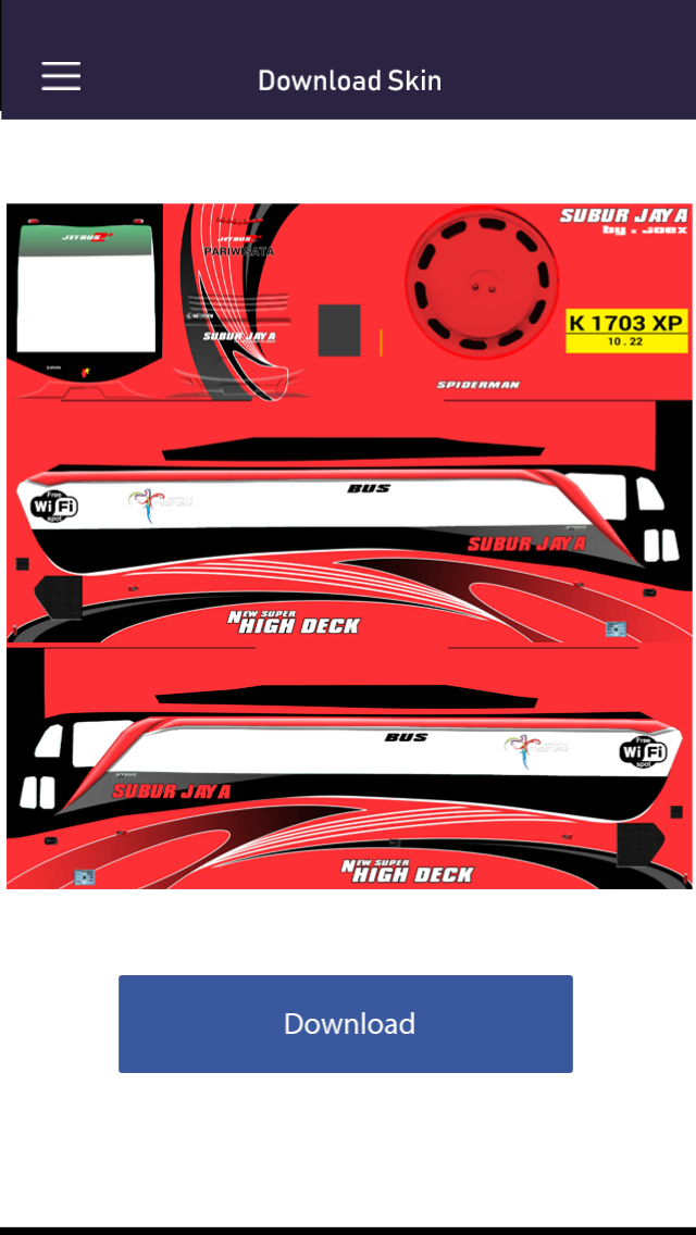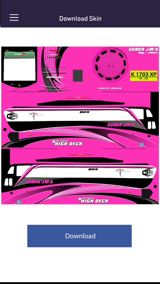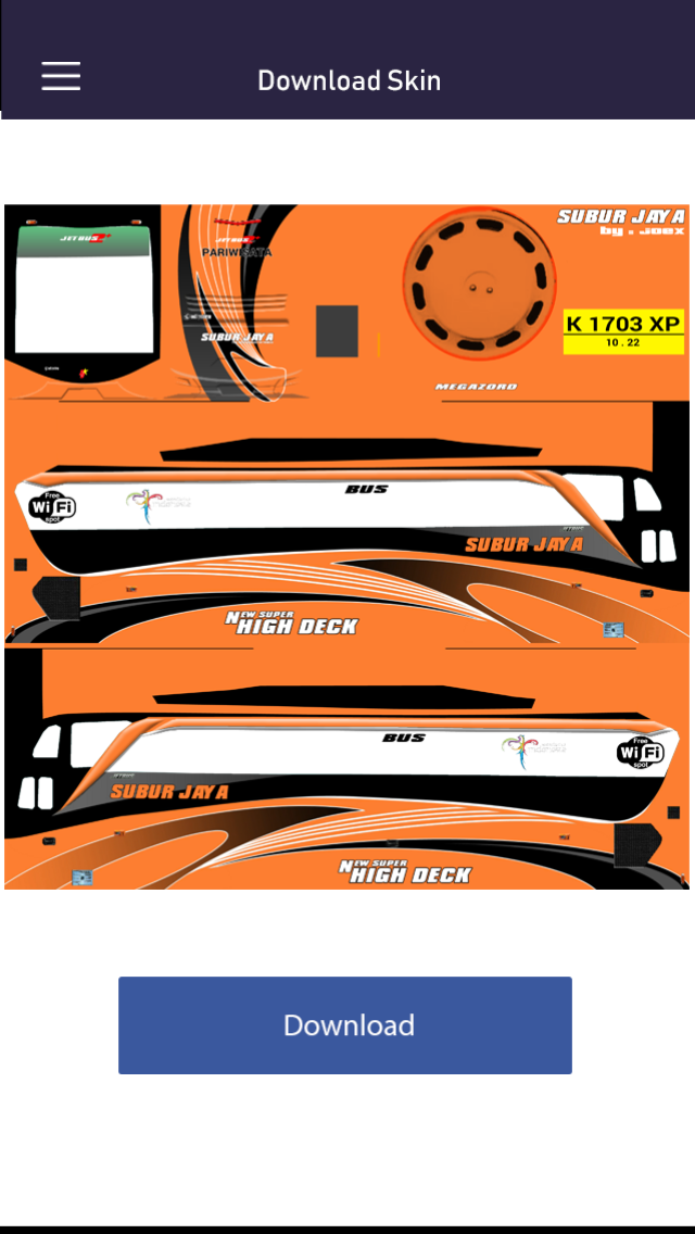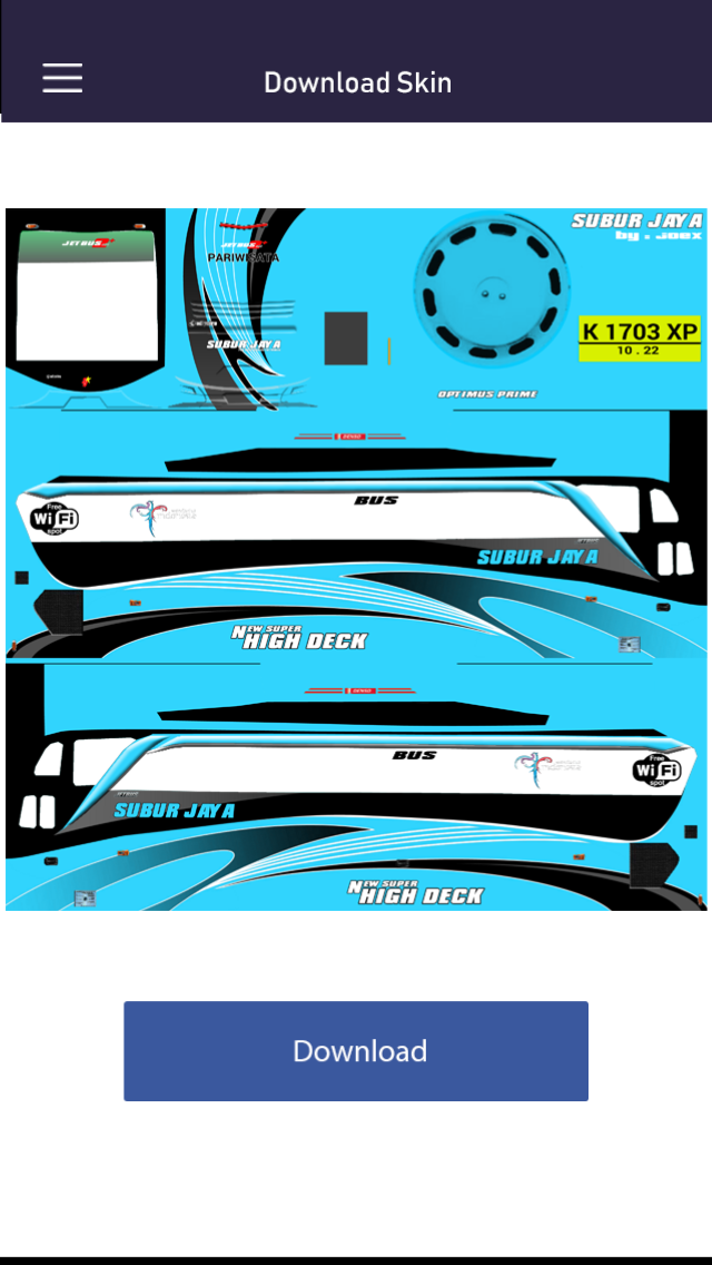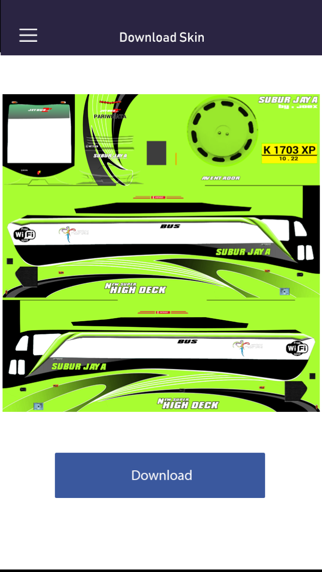 Livery Bussid Subur Jaya (Package Name: com.livery.bussidsuburjaya) is developed by Top Skin and the latest version of Livery Bussid Subur Jaya 1 was updated on February 8, 2018. Livery Bussid Subur Jaya is in the category of Personalization. You can check all apps from the developer of Livery Bussid Subur Jaya. Currently this app is for free. This app can be downloaded on Android 3.0+ on APKFab or Google Play. All APK/XAPK files on APKFab.com are original and 100% safe with fast download.