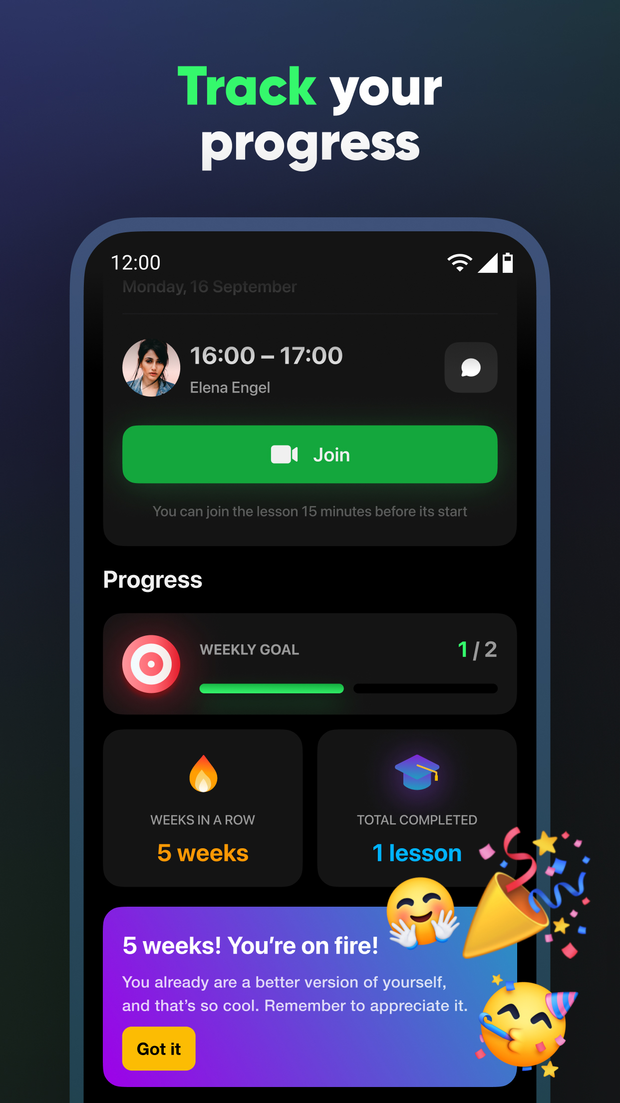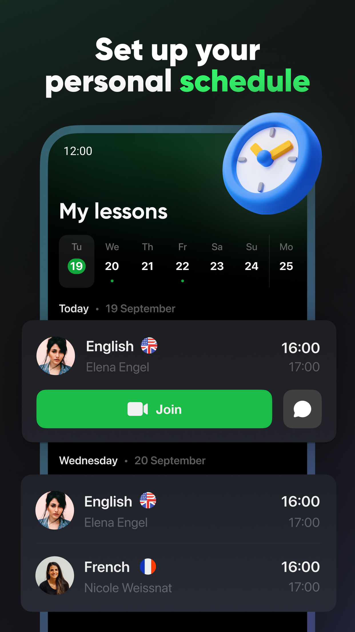 Choose from 30-, 45-, and 60-minute sessions and the date and time that suit you. You can have your lessons from anywhere in the world as long as there's an internet connection. And don’t forget about the vocabulary trainer!