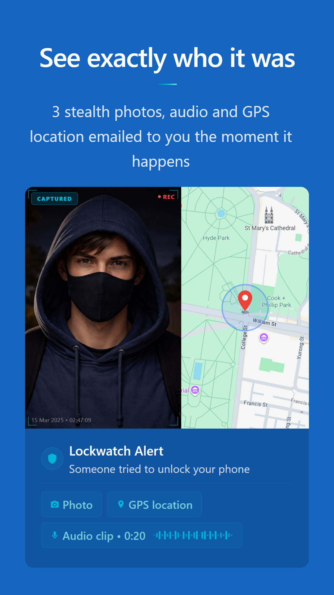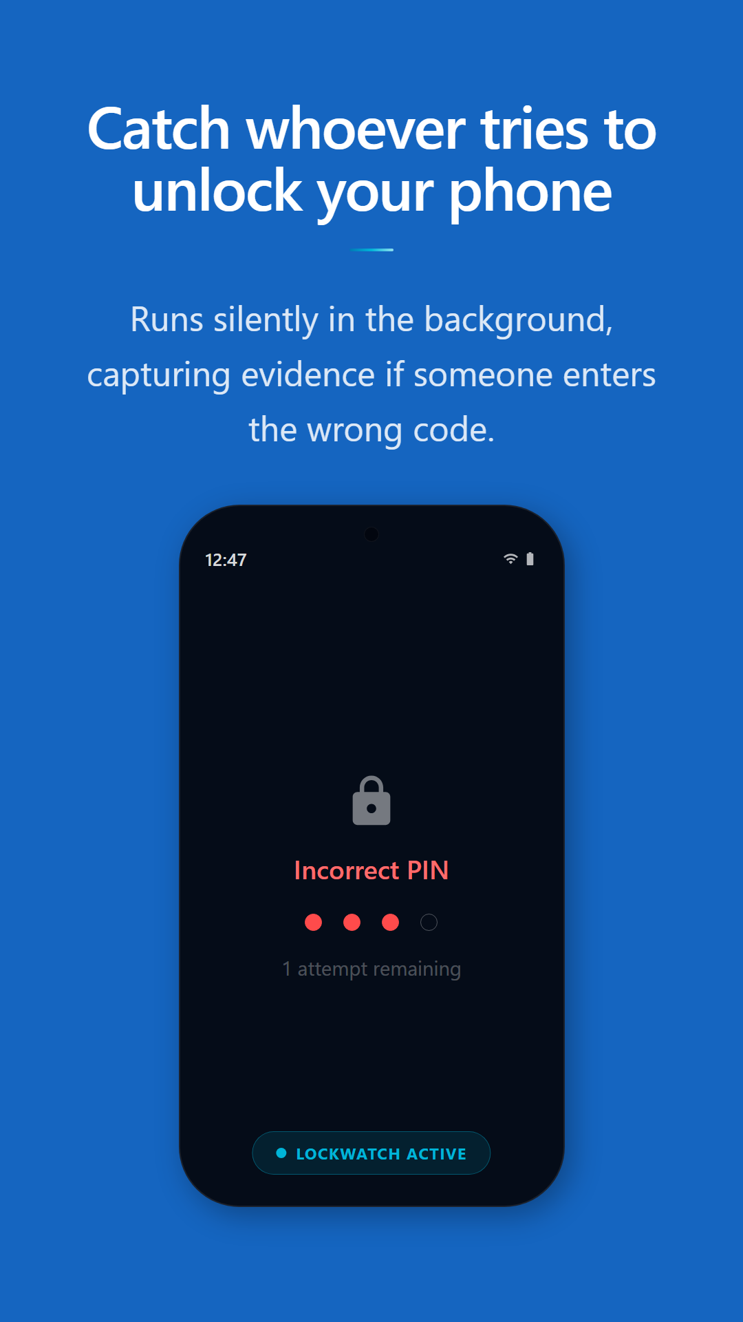 Lockwatch secretly takes a photo using your front camera when someone enters an incorrect unlock code on your phone. It emails you the photo along with their GPS location, without them knowing. It also alerts you when a SIM card is swapped or the phone is switched off while still locked. The app has helped recover hundreds of lost and stolen phones, and has been featured in TV and online news stories. Lockwatch uses Android's built-in lock screen and runs only when an incorrect unlock attempt occurs, so it won't drain your battery. FREE TRIAL Lockwatch includes a free 7-day trial. After that, a subscription is required to continue using the app. You can cancel anytime. FEATURES A subscription unlocks all features: • Secretly takes a photo using the front camera and emails it to you along with their GPS location, without them knowing • Sends you an email when a SIM card is swapped, including the location and new SIM details (phone number, network provider, where available) • Sends you an email when the phone is switched back on after being turned off while locked, hopefully revealing their hideout • Multiple photos per attempt, each a few seconds apart, so you get a clear view of their face. All photos are included in the email • Records a 20-second audio clip of what's happening around the phone, included in the email • If there is no Wi-Fi or mobile data, everything is saved to your phone and emailed when a connection becomes available • No advertisements within the app HELP For help, visit: https://bloketech.com/lockwatch/help NOTES • Lockwatch only triggers if at least four digits are entered incorrectly, as Android requires a minimum PIN or pattern length of four. If the correct code is entered within 10 seconds, the alert is cancelled, so a simple mistype won't send an email. • This app uses the Device Administrator permission to monitor screen unlock attempts. When activating Lockwatch, Android will warn that it may "erase all the phone's data". Android shows this warning for all Device Administrator apps. Lockwatch contains no code to wipe your phone.