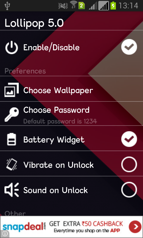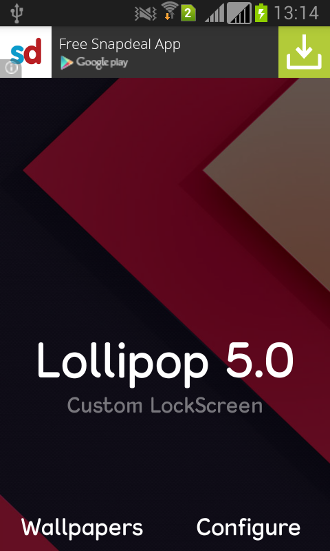 Android Lollipop 5.0 Lock Screen is now available..Lollipop Lock Screen will replace your device's existing lock screen and will give you lollipop theme on your lockscreen.Following features are provided in this app => Replace your phone's default lockscreen with this cool lock screen=> You can enable/disable lock screen any time you want,=> Change Background wallpaper or locker, choose from the lollipop wallpapers or even you can choose the wallpaper from the Gallery as well.=> Enable/Disable Battery widget on lock screen.=> Set password : you can set password of your choice to make it more secure.=> When lock screen appears, all the button of you phone will be disabled, which will make it more secure.=> Enable sound when unlock=> Enable vibration when unlock.So replace your phone's default lock screen with this cool lock screen.