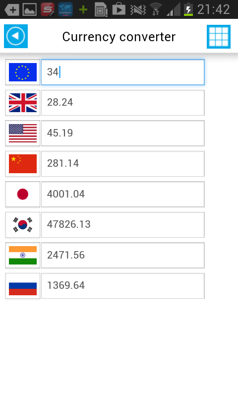 - currency converter: euro, british pound, US dollar, chinese Youan, Japanese Yen, Korean Won, Rupee, Russian Ruble (offline)