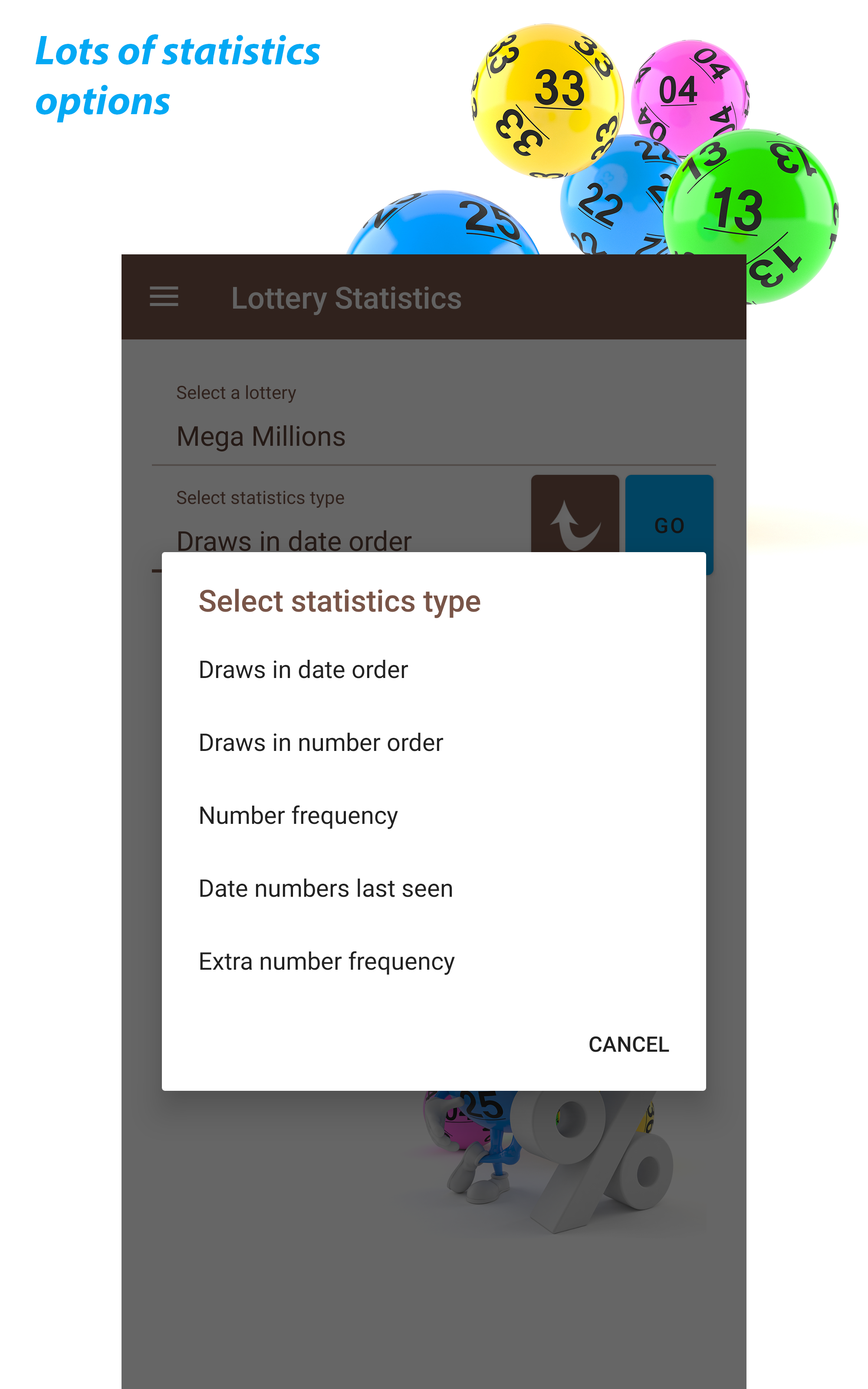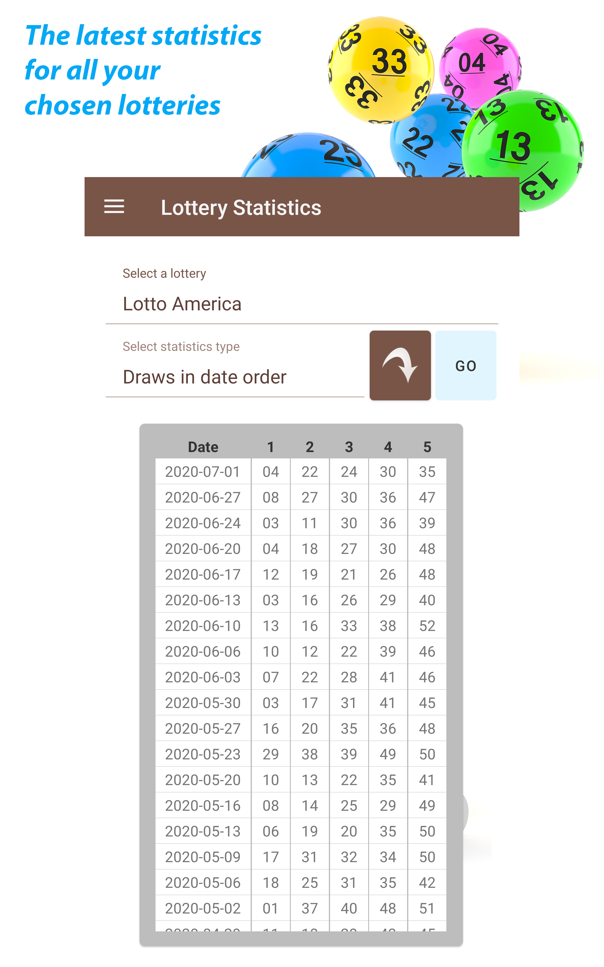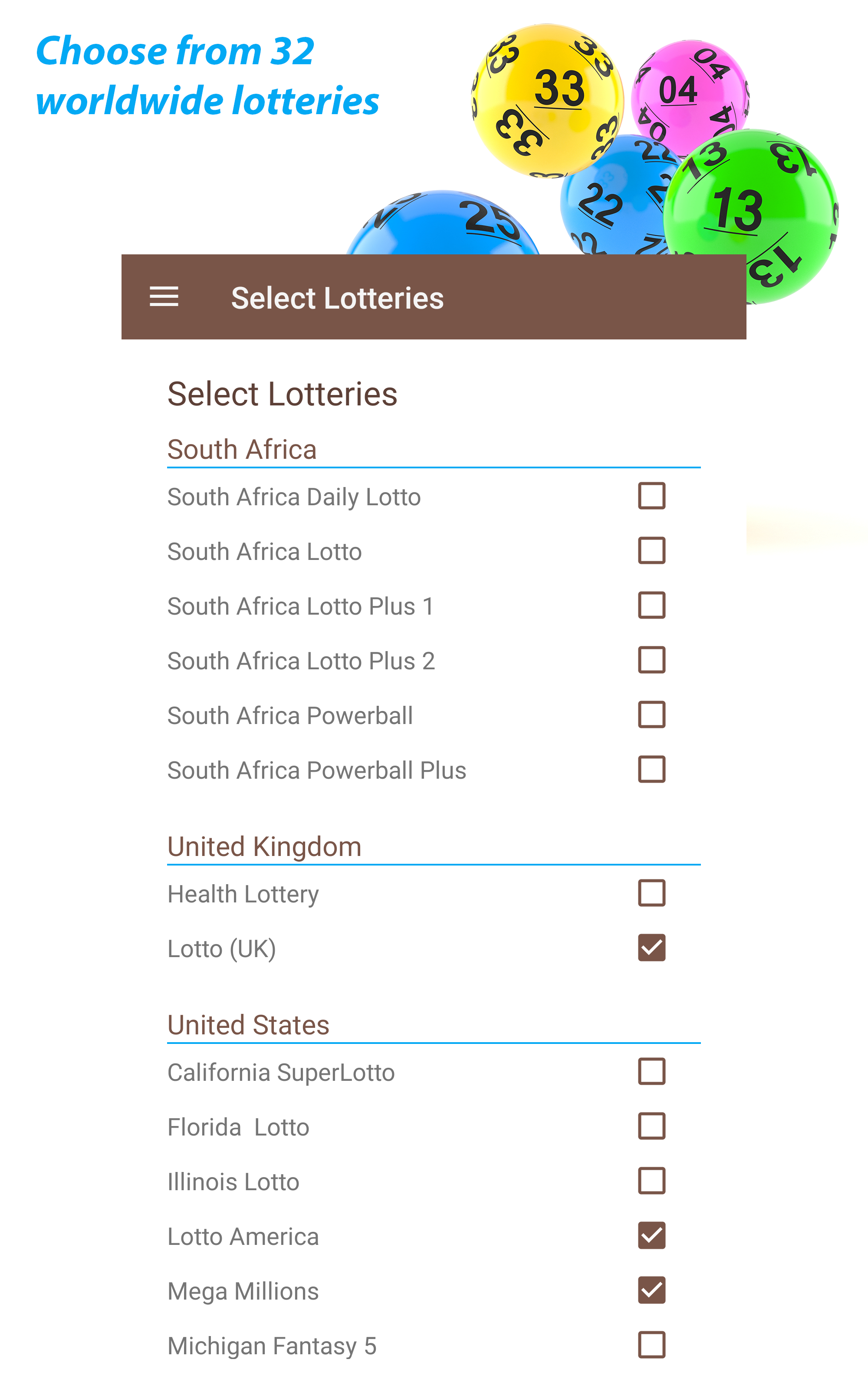 Do you love to play the lottery? Do you want to know the most (and least) popular numbers for your lottery and when each number was last drawn? The Lottery App gives you up-to-date information about lotteries from around the world, including the latest draws and historical data. All recent draws and statistics updates are provided for free. Try your luck with some of the biggest lotteries in the world, including El Gordo, MegaMillions, and Powerball. Lotteries included: Australia: - Monday Lotto - Powerball - Saturday Lotto - Wednesday Lotto Brazil - Mega-Sena (NEW) Canada: - Daily Grand - Lotto 649 - Lotto Max Eire: - Lotto (Ireland) Europe: - El Gordo (NEW) - Eurojackpot - Euromillions - French Loto (NEW) - German Lotto (NEW) - SuperEnalotto (NEW) New Zealand: - New Zealand Lotto & Powerball South Africa: - Lotto - Daily Lotto - Lotto Plus 1 - Lotto Plus 2 - Powerball - Powerball Plus UK: - Health Lottery (UK) - Lotto (UK) US: - California SuperLotto - Florida Lotto - Illinois Lotto - Lotto America - Mega Millions - Michigan Fantasy 5 - Michigan Lotto 47 - New Jersey Cash 5 - New Jersey Pick 6 - New York Lotto - Oregon Megabucks (NEW) - Oz Lotto - Powerball - Texas Lotto More lotteries coming soon! Use historical data and previous draws to help you choose your number. Select from: - Numbers not drawn before - Numbers drawn before - Most popular (HOT) numbers - Least popular (COLD) numbers Statistics included and updated: - Draw dates - Draws in number order - Number frequency - Dates numbers last seen