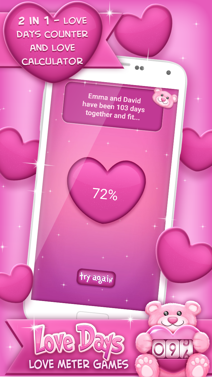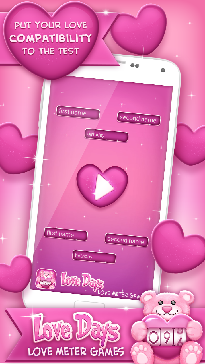 If you like kissing games, love quizzes such as “does he like me”, or apps with quotes on relationship, you’ll adore our name compatibility app. ♥ Love Days – Love Meter Game ♥ is both a love compatibility test and love days counter. So, you’ll get a full package in our love test game, which will seem to you like a real love calculator and lovedays counter! The romantic “love tester game” brings relationships to the cutest and sweetest level imaginable!