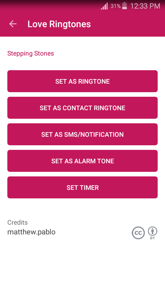 LEGAL INFO AND LICENSESounds and tones used in Love Ringtones are under Creative Commons license (CC0 1.0, CC BY 2.5, CC BY 3.0, CC BY-SA 3.0, CC BY 4.0), credited in the app, where appropriate. For any questions or concerns regarding license, please contact us at