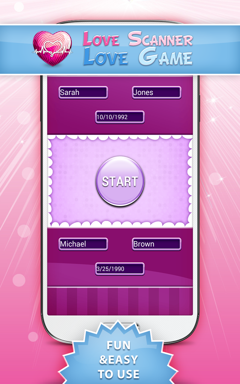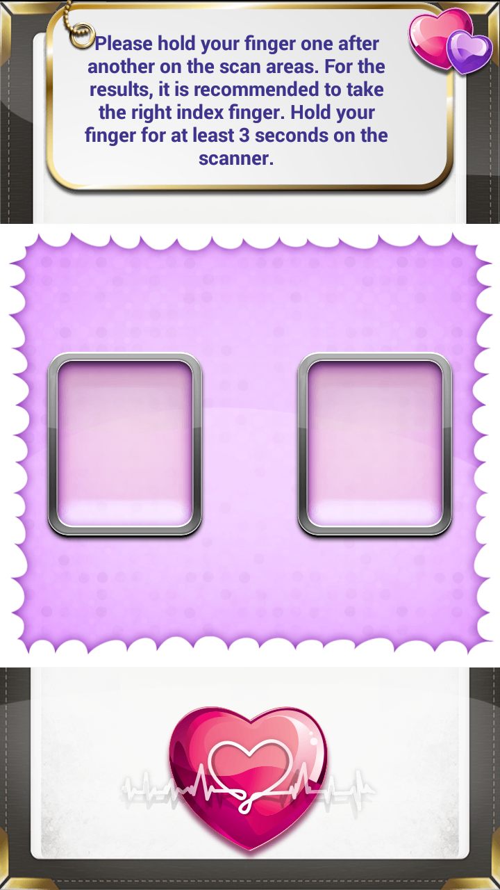 Hello, love birds! Calculate the percentage of your love with this brand new love app. Download ♥ Love Scanner Love Game ♥ and have your share of fun! P.S. This is for entertainment purposes only! The scanner is not real, but you can have a lot of fun playing this game! We offer you the best: ♥ Love calculator - calculates love percentage, based on numerology! ♥ Love test – lets you answer questions about each other, and check your compatibility! ♥ Love words – gives you cute “love quotes and sayings” that will brighten your day! ♥ Love Scanner Love Game ♥ is a fun new scanner app for all people in love! Whether you are single or a part of a couple, this super cool love scanner will give you a chance to check your love compatibility. This cute fingerprint scanner game will check how well you know your partner. You will answer questions about each other in this fun dating game for couples. Download it now and we guarantee you that this marriage love game is worth a try. Surprise your sweetheart for Valentine's Day by playing this love meter game together. If your love percentage is more than 30%, there's a lot of work to do to advance your relationship. If it's more than 50%, you're doing fine. If it's more than 70%, it is a very good relationship. If it's more than 100%, than it's true love. So, are you ready for a love test? Scan your fingers immediately and prepare for a beautiful love game. Download ♥ Love Scanner Love Game ♥ and read lovely quotes and sayings about love and romance. If you believe that you can truly be stuck by the Cupid's arrow, now is your time to read all about it. There are lovely quotes by famous poets and writers, such as William Shakespeare, Erich Fromm, and many others. It will evoke in you tender feelings and romantic memories. Read love text and send it to your partner in order to make them feel better and loved. They will surely appreciate your affection. ❤ Scanner app games with real fingerprint biometric readers are extremely popular these days and favorites for kids, for girls, boys as well as for adults. ♥ Love Scanner Love Game ♥ is one of such romantic apps you cannot miss to have. Download now and play these funny love games whenever you wish! ❤ Are you ready for an amazing love test which will help you check if your feelings are true? We created this fun test for couples and for lovers in order to help you realize your relationship status. If you have any problems with your partner, accept this challenge and let us analyze your fingerprints now! Feelings rock, so let this romantic scanner test rock your world! Love meter for girls, boys, and adults - enjoy this app! All boyfriends and girlfriends of the world – measure your affinity for each other now! ♥ Love Scanner Love Game ♥ is waiting for you, so start playing now! ❤ Download this unique ♥ Love Scanner Love Game ♥ and enjoy this HQ love game. This is a really funny app, free and easy to use! First enter your full name and date of birth; do the same for your partner; place your fingertips on the love scanner and wait for the results. The love meter will show your percentage results in a second. If you are married, you can use this awesome fingerprint scanner to have fun with your kids, friends or family members. An excellent free app to kill time during the waiting periods, at parties – this finger print game is bound to give you loads of fun any time. You can use it even as a marriage love test and check the level of compatibility with your spouse. If the meter indicates 100%, it means you are a perfect match, and your marriage is a great success! Trust this excellent match maker for it is very fun! ❤ Especially for all love birds!❤
