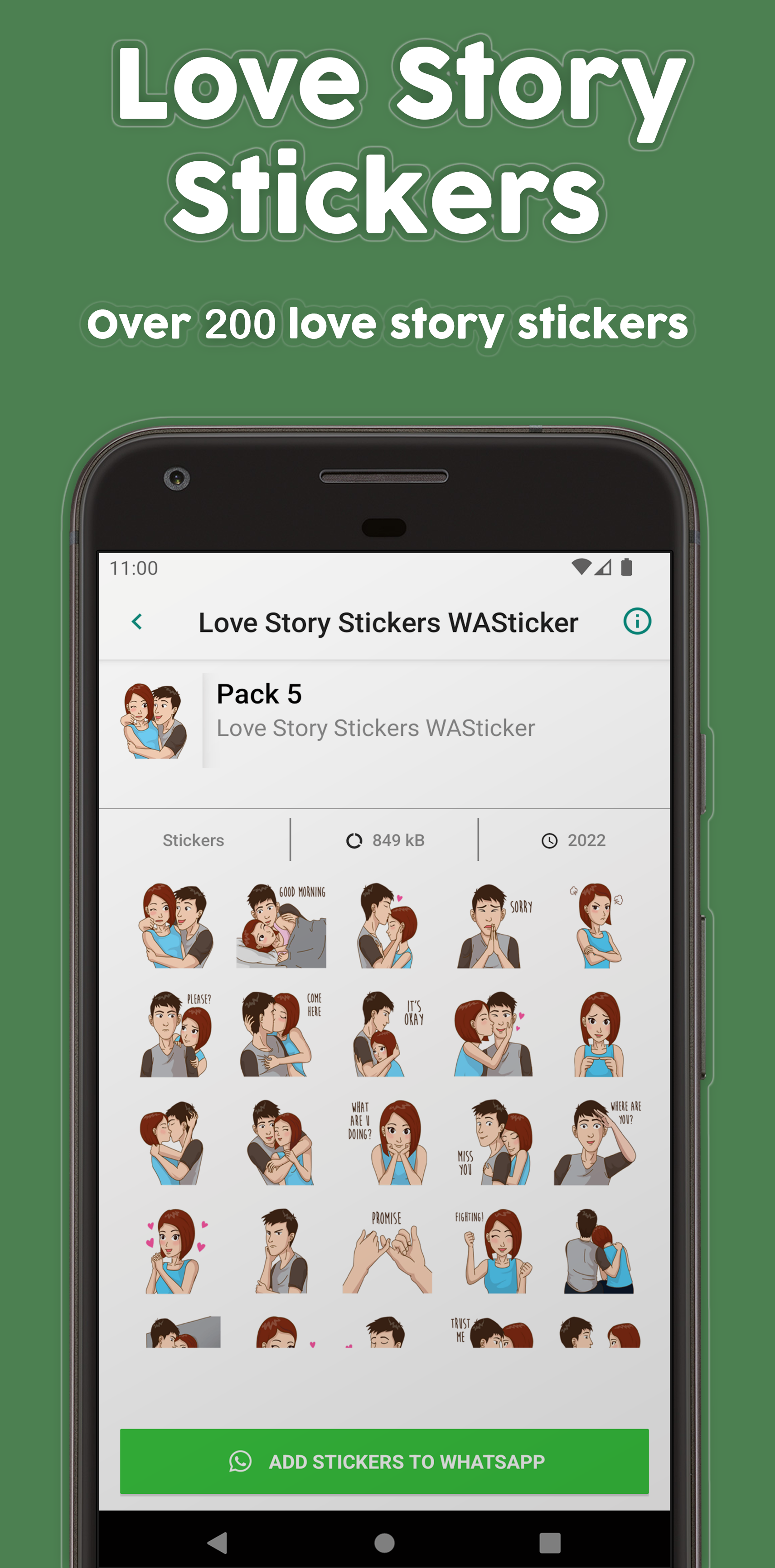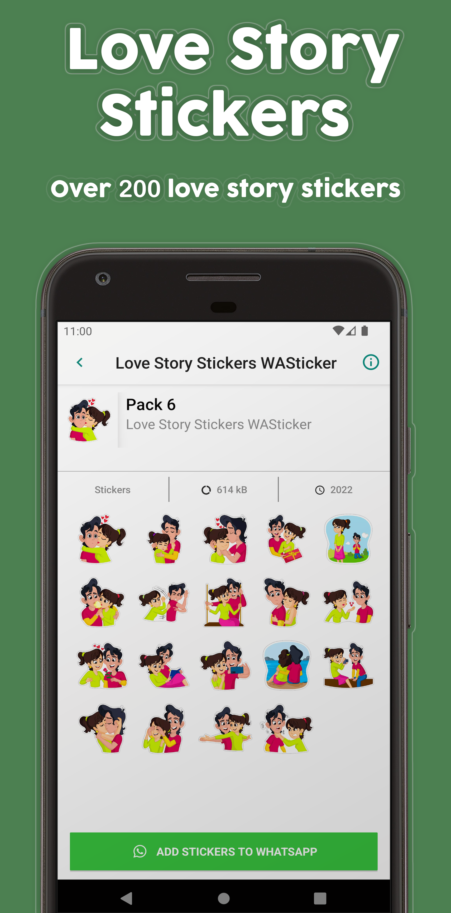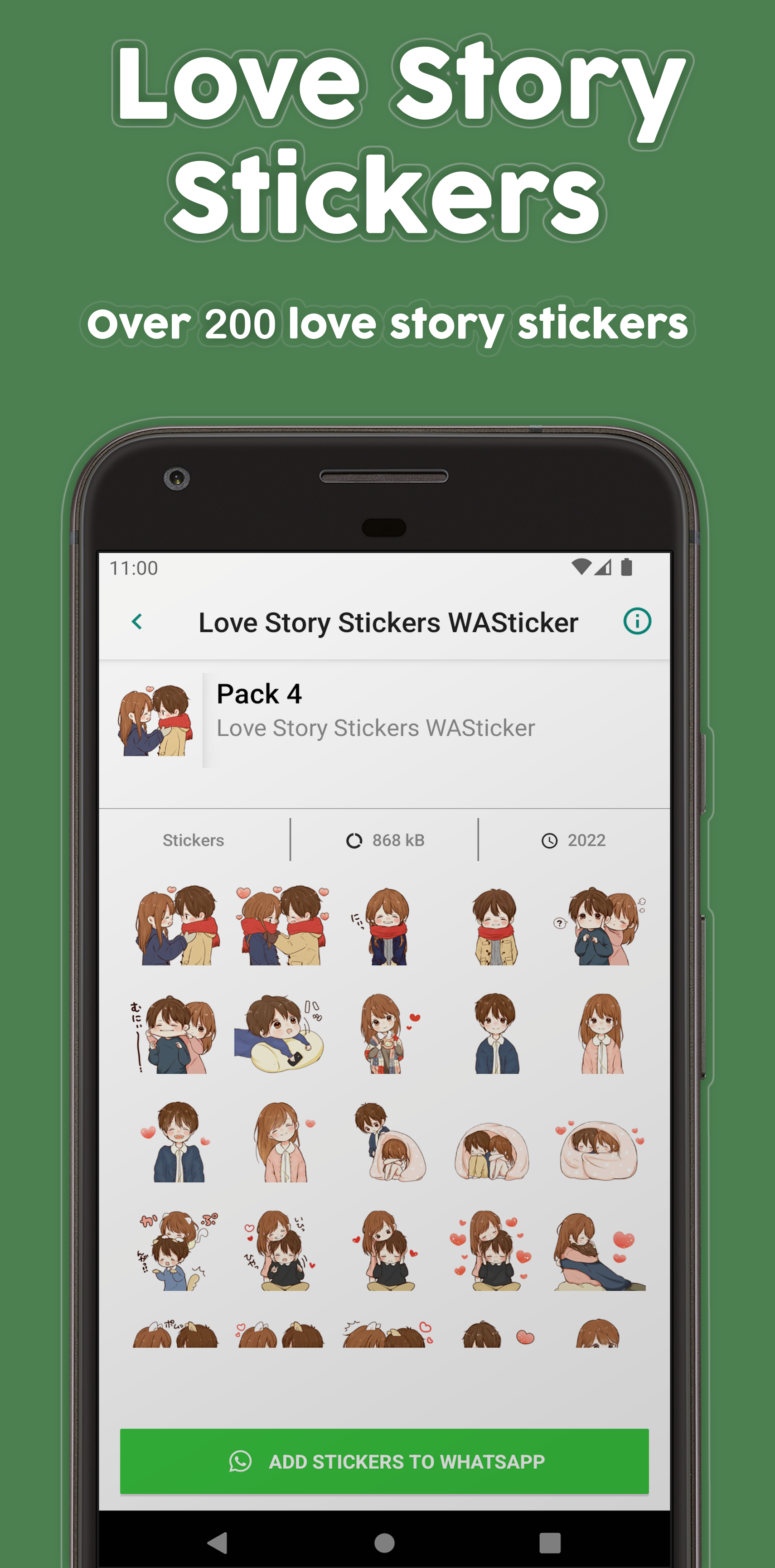 App includes multiple sticker packs you can import and use in WhatsApp. • How to add love story stickers to your WhatsApp: 1. Install this app. 2. Select sticker pack you want. 3. Press "add to whatsapp button". 4. Open Whatsapp chat and go to emoji page. At the bottom you should see the new stickers icon. ! If you can't add stickers to your 💬WhatsApp, it means you haven't received the update yet. More love stickers and more packs coming soon, Let me know what you think, what packs should I add?